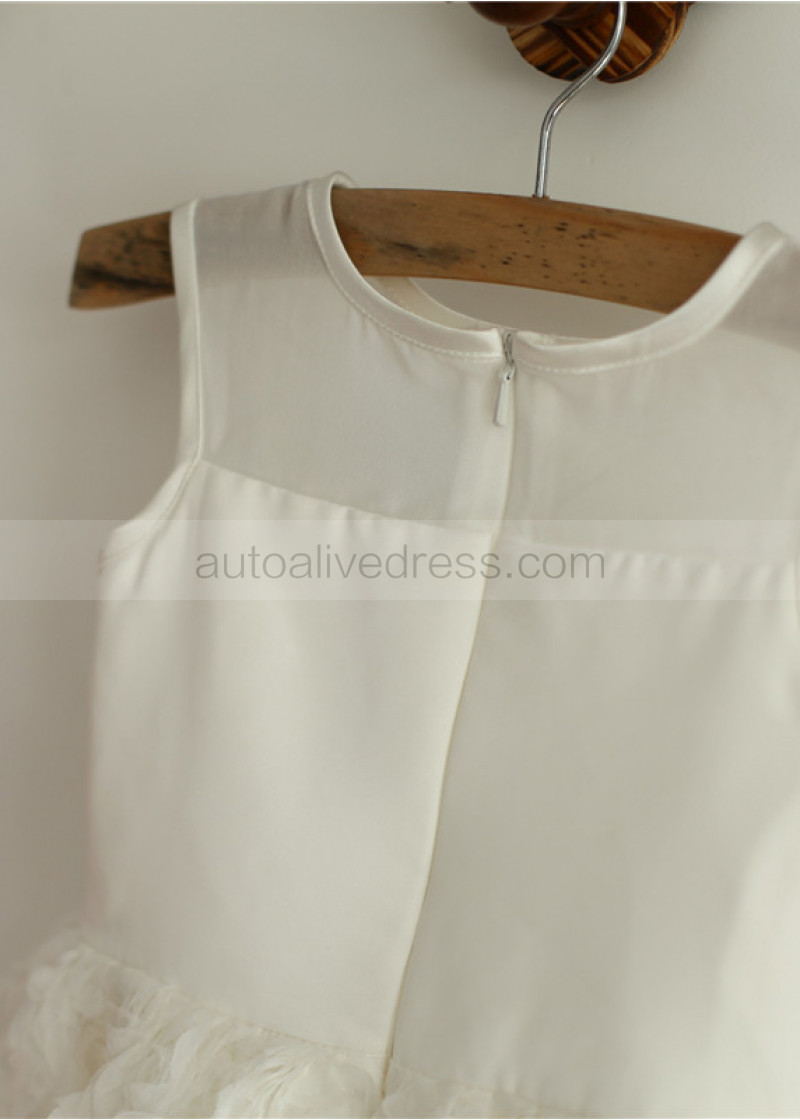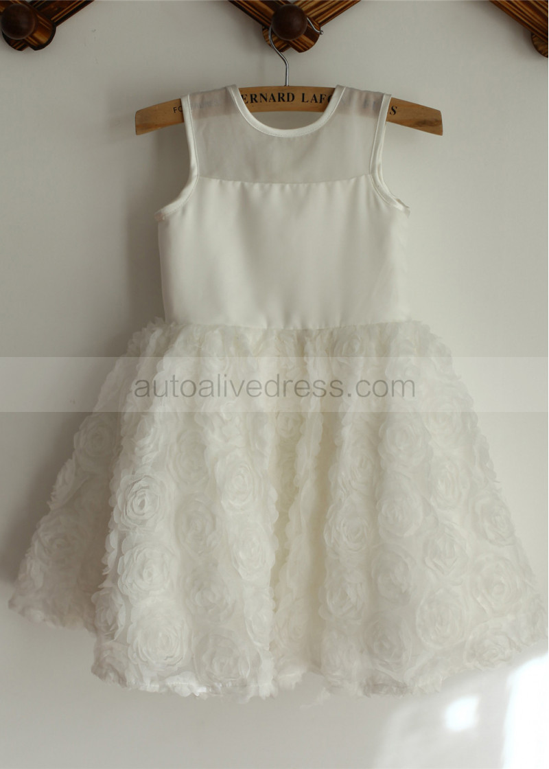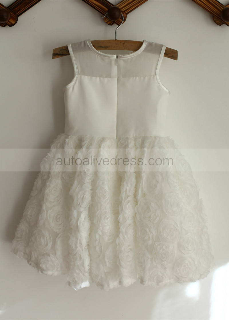Sheer Neck Ivory Organza Rosette Short Flower Girl Dress