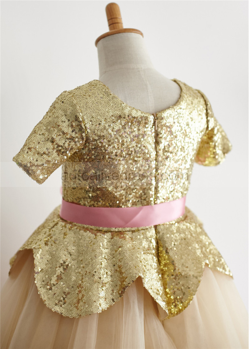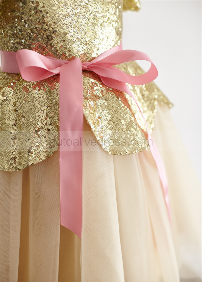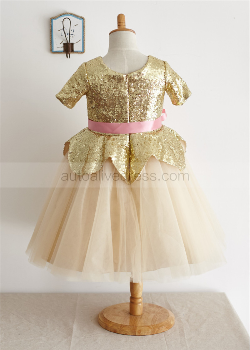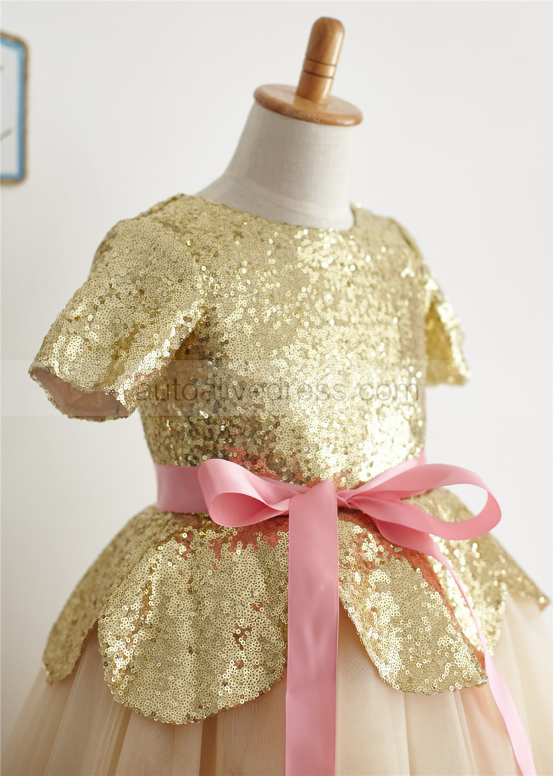 Short Sleeves Gold Sequin Peplum Champagne Tulle Flower Girl Dress