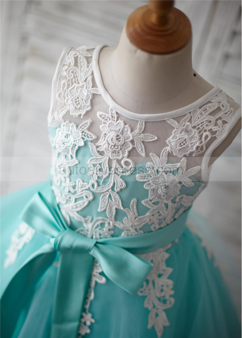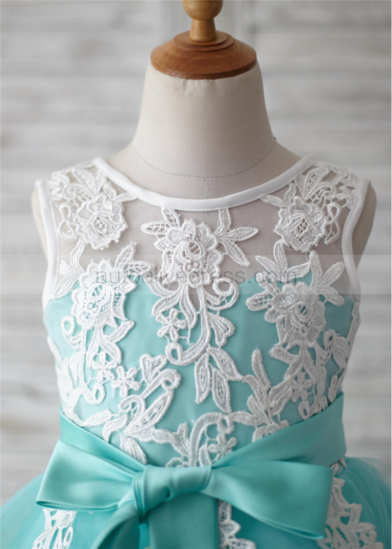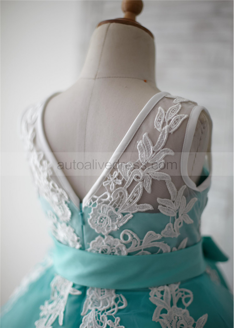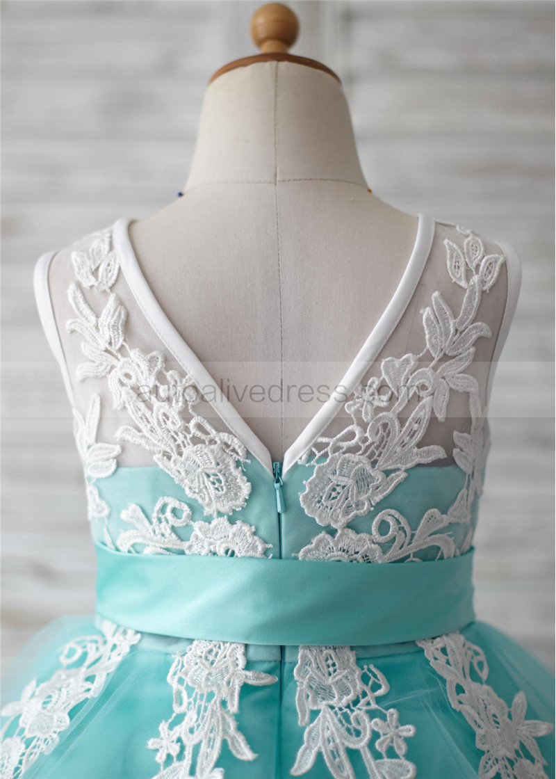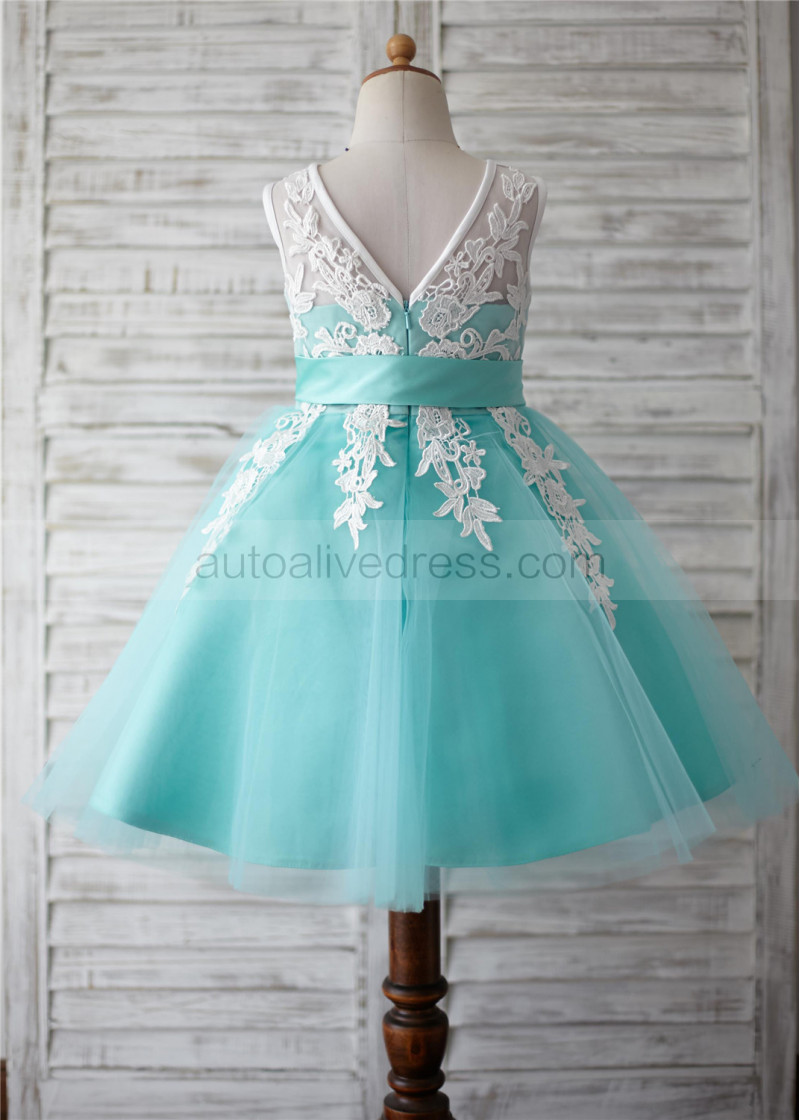 Turquoise Tulle Ivory Lace V Back Knee Length Flower Girl Dress