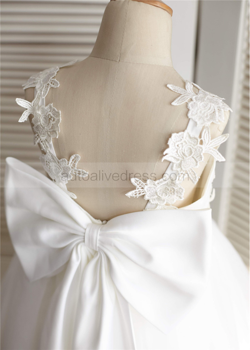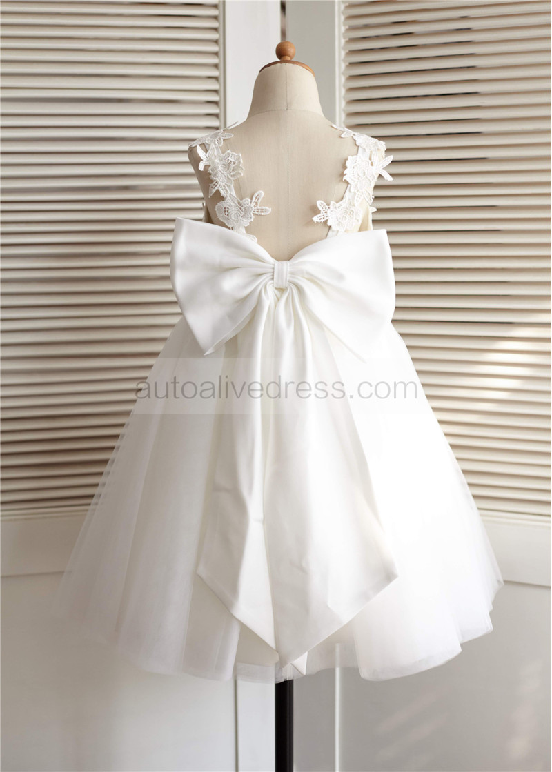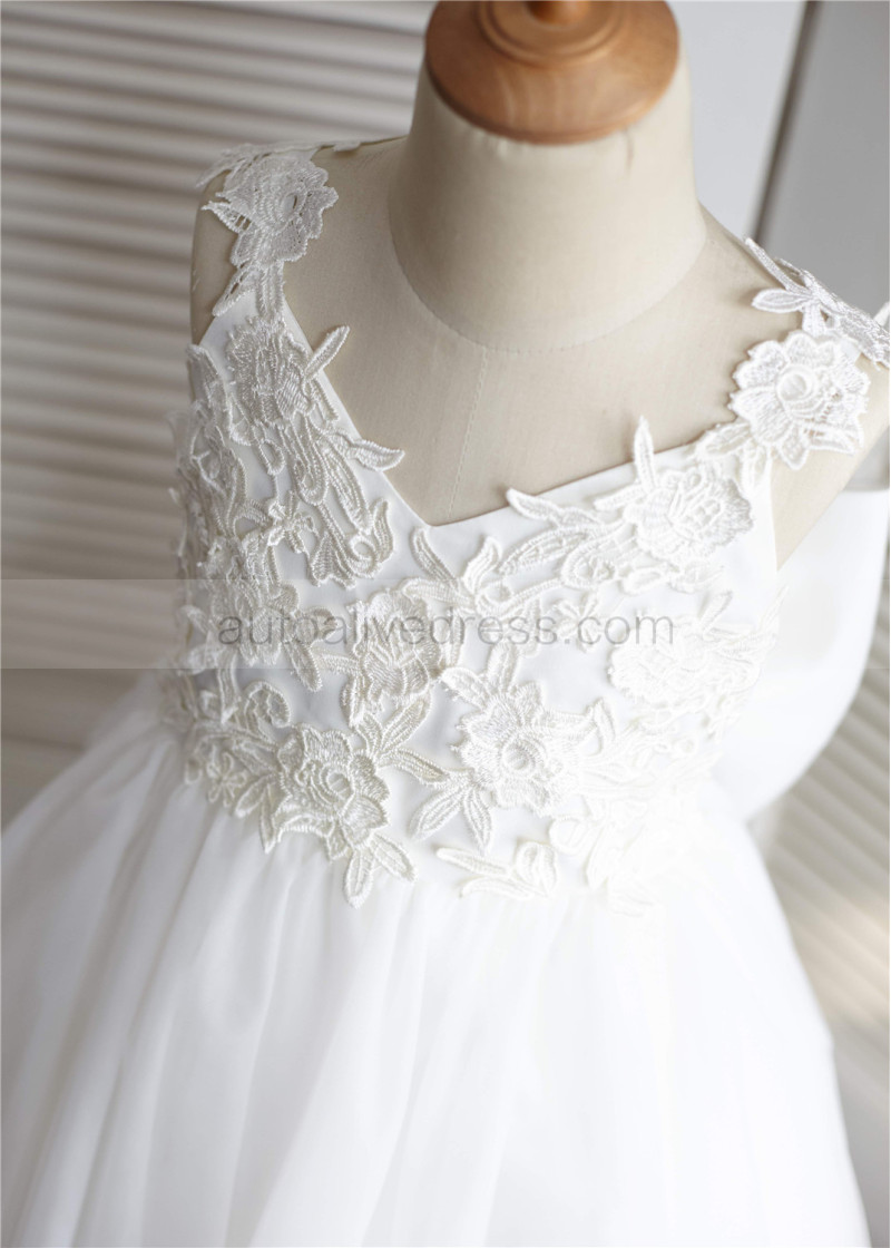 V Neckline Ivory Lace Tulle Knee Length Flower Girl Dress