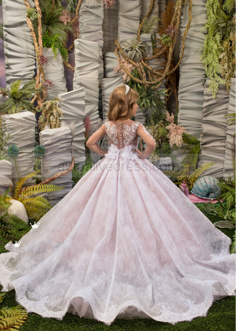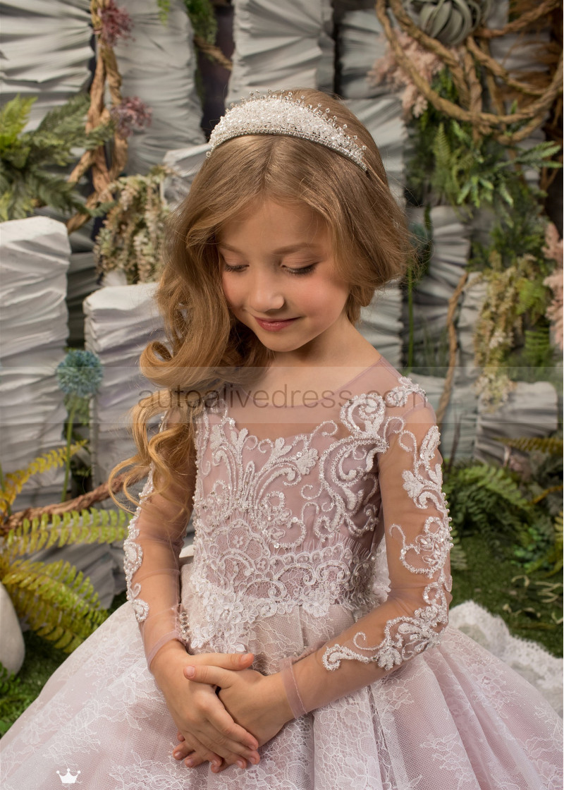 Beaded Ivory Lace Tulle Flower Girl Dress With Pink Lining