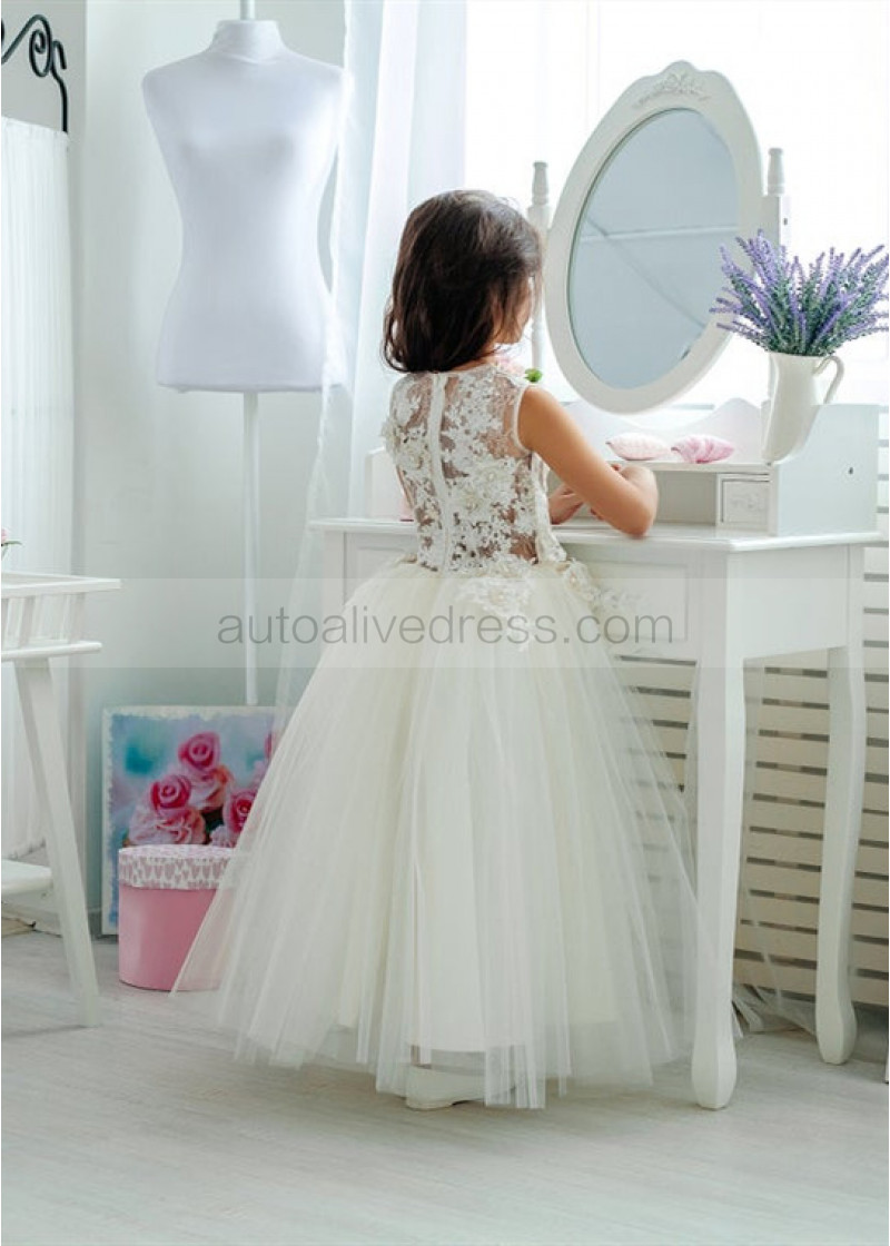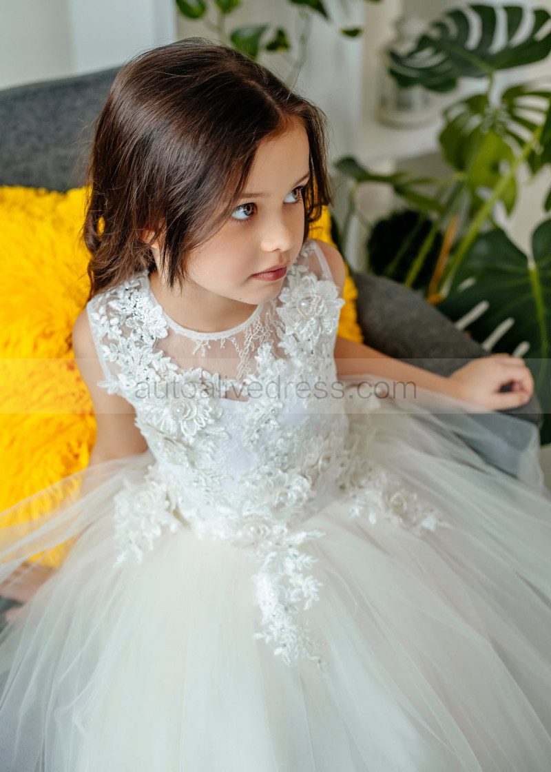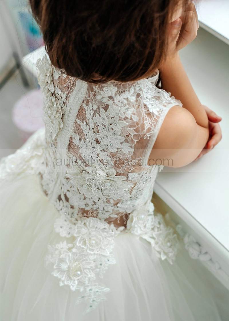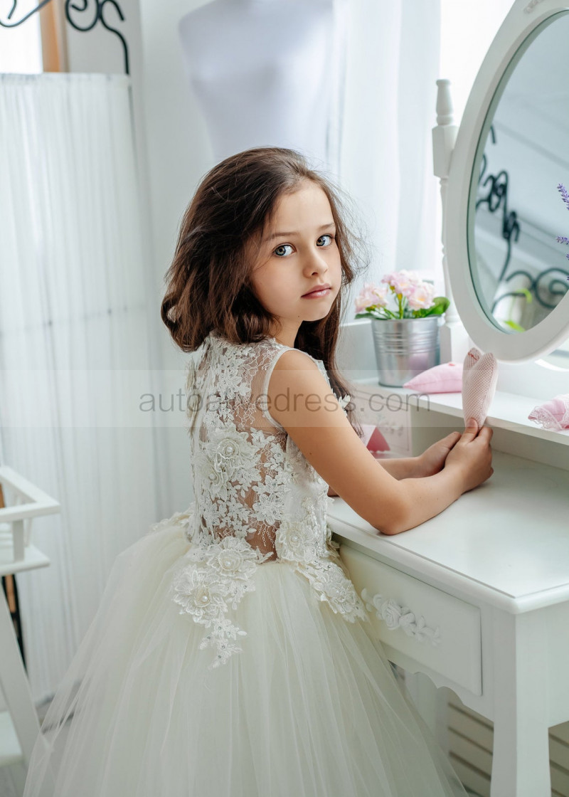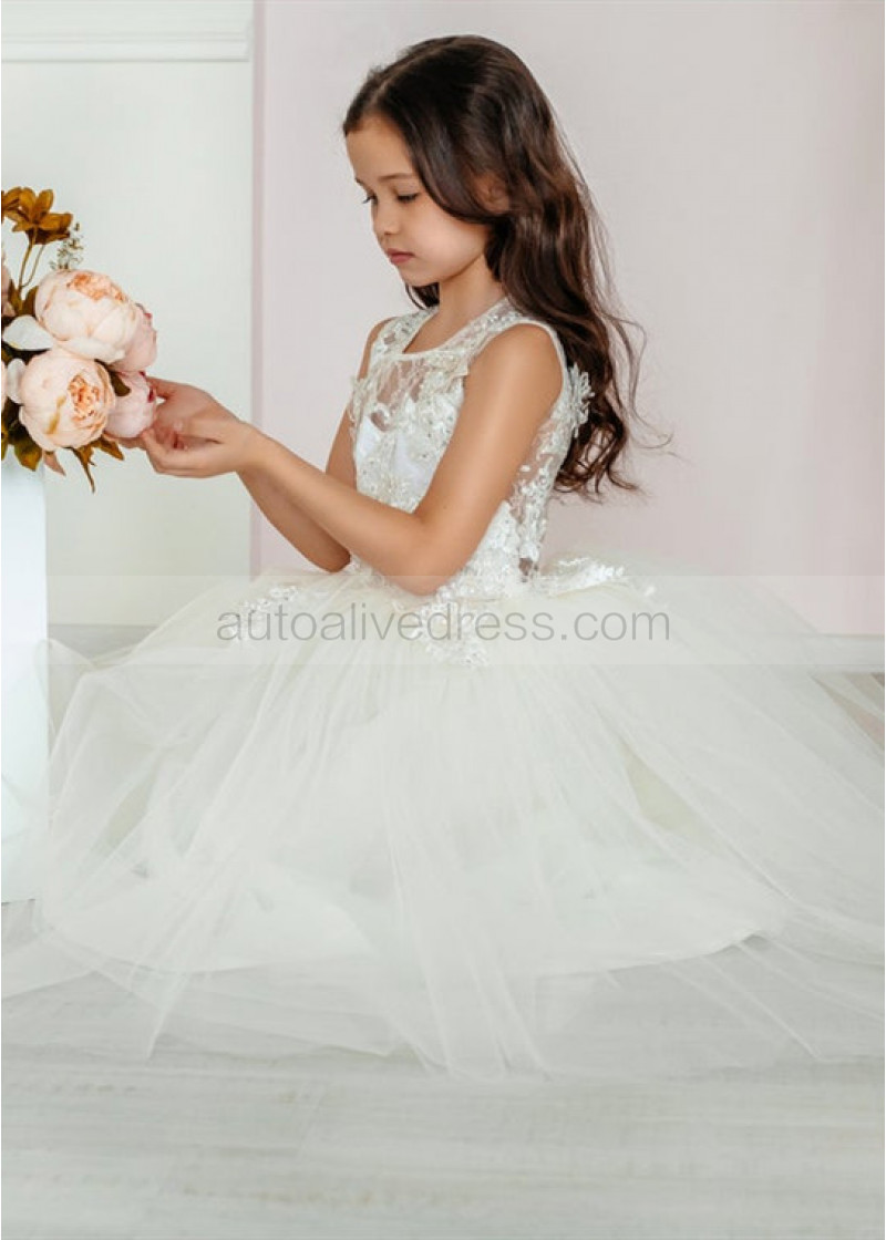 Beaded Ivory Lace Tulle Illusion Back Flower Girl Dress