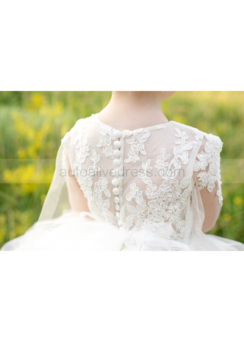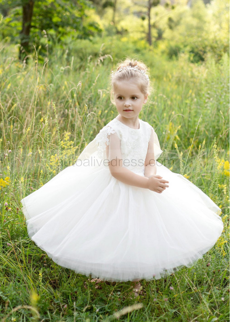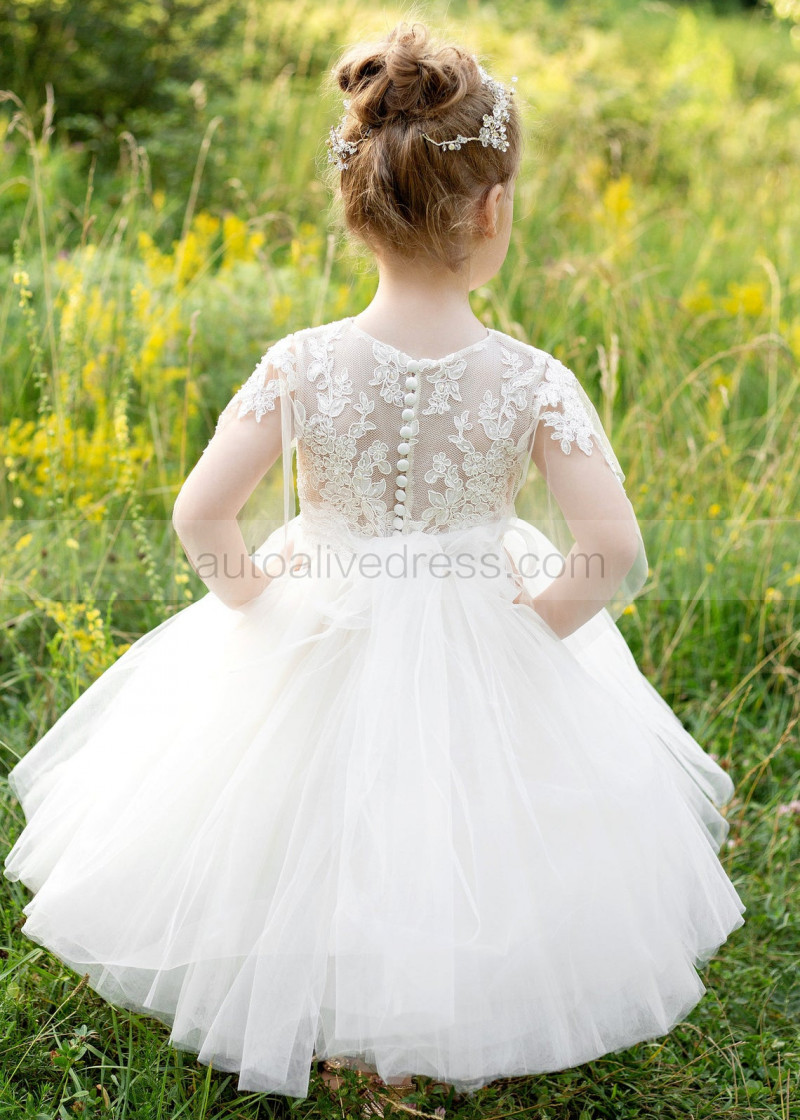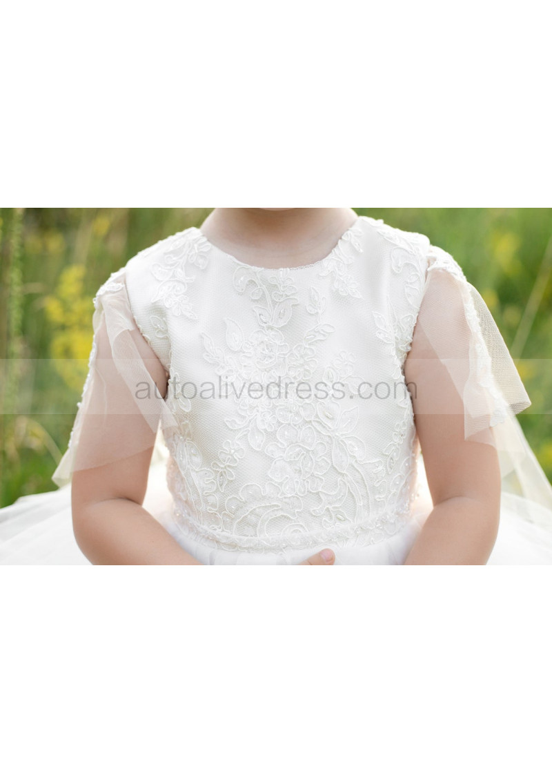 Beaded Ivory Lace Tulle Open Sleeves Flower Girl Dress
