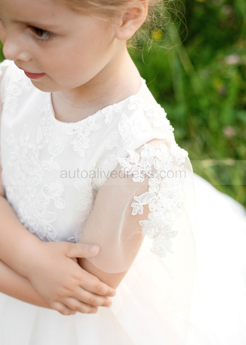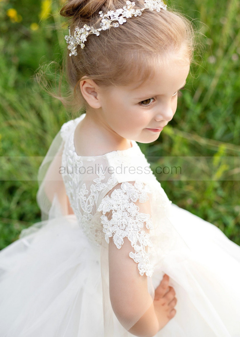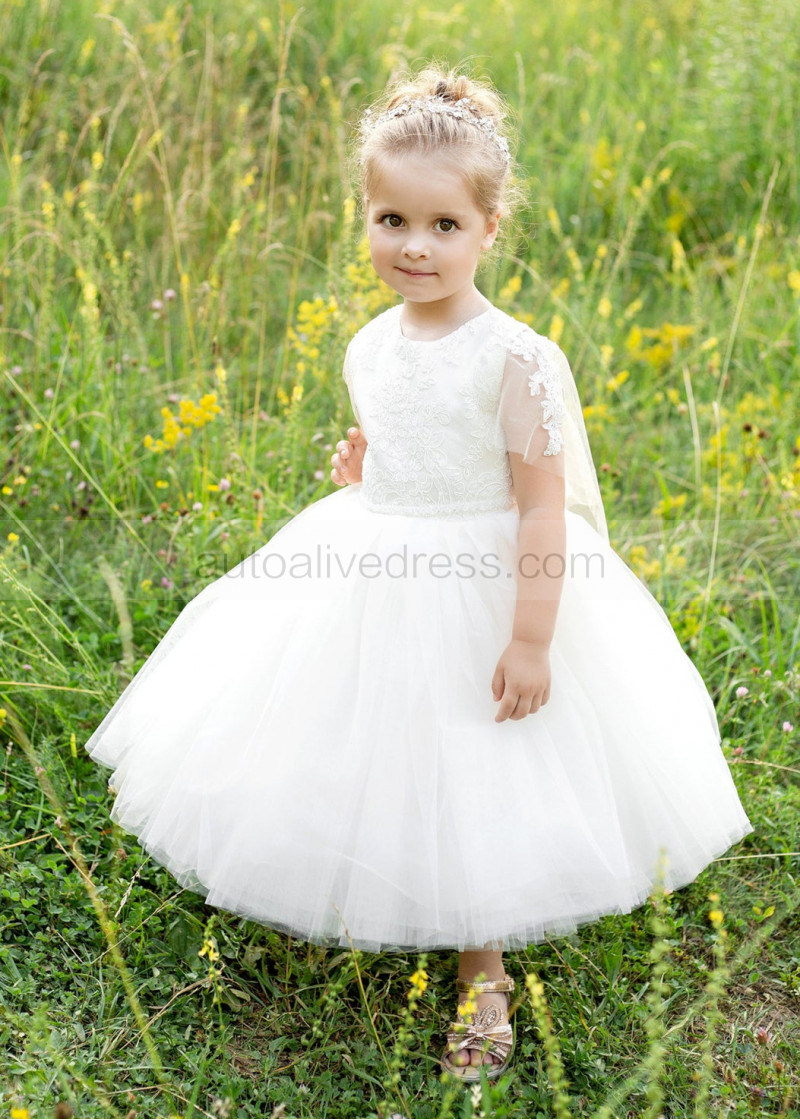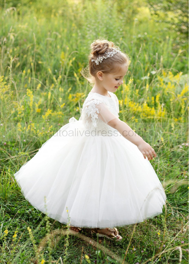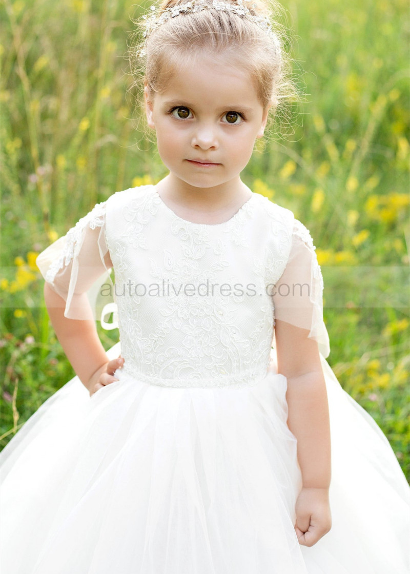 Beaded Ivory Lace Tulle Open Sleeves Flower Girl Dress