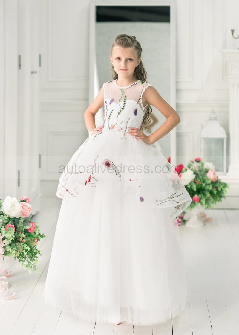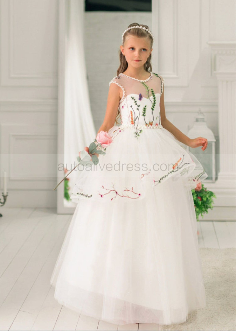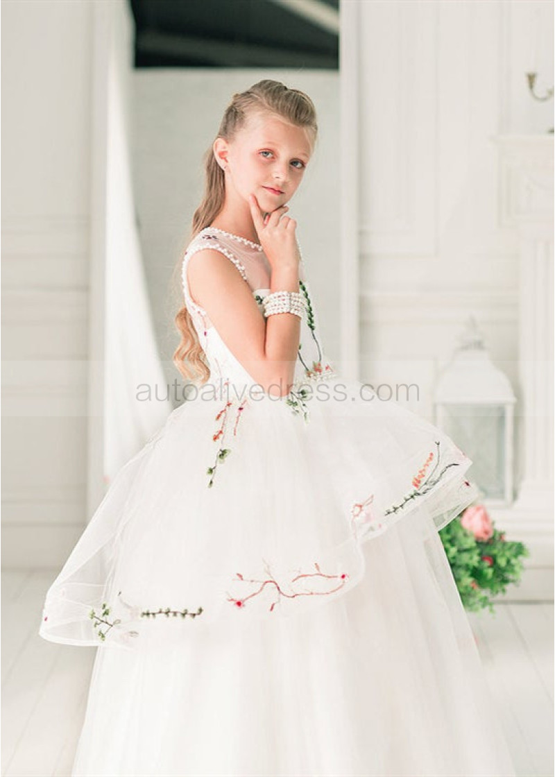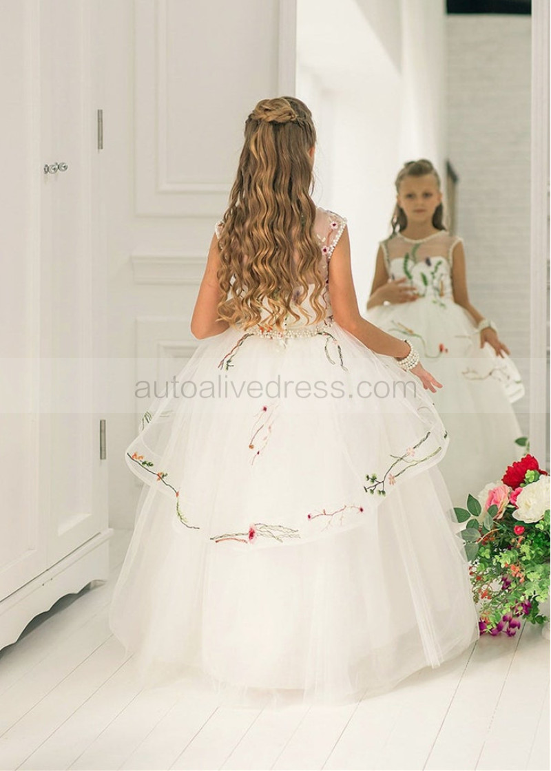 Beaded Ivory Tulle Peplum Print Flower Girl Dress
