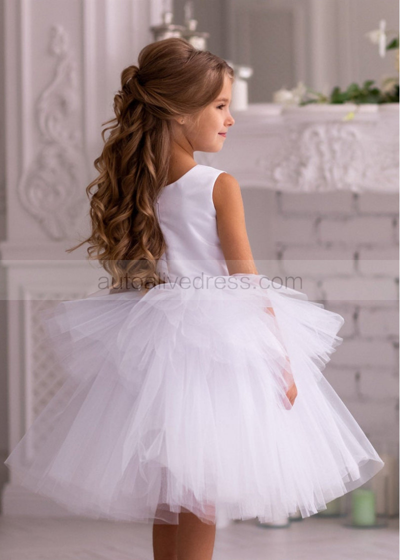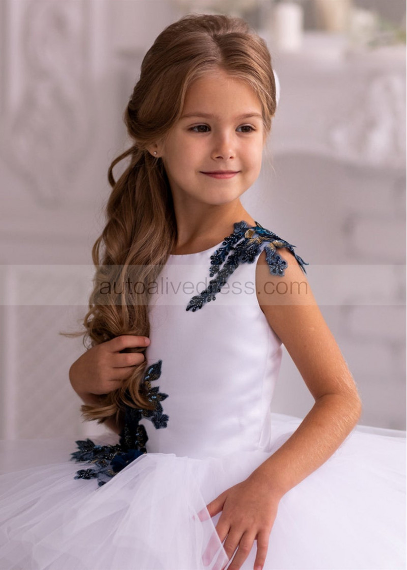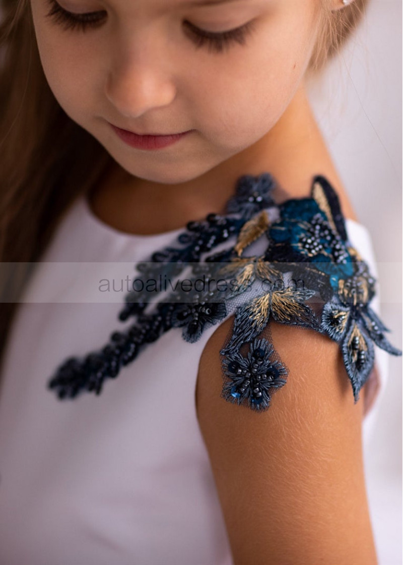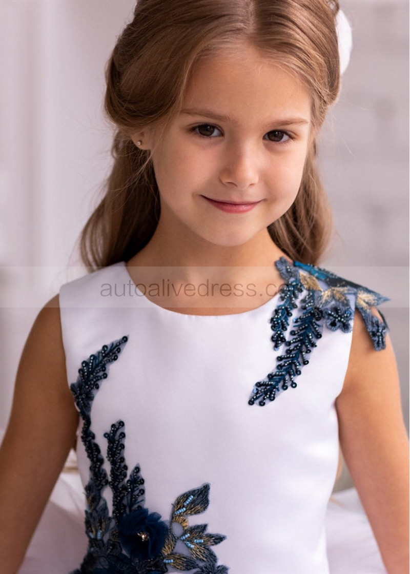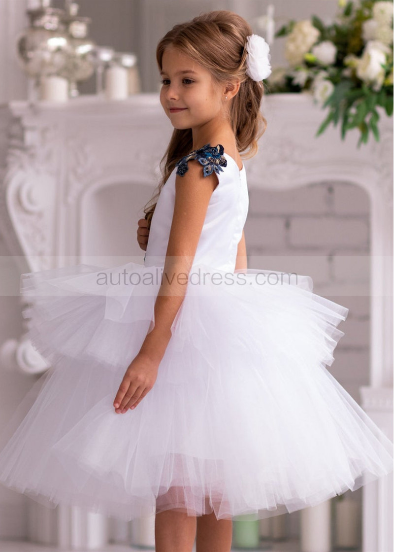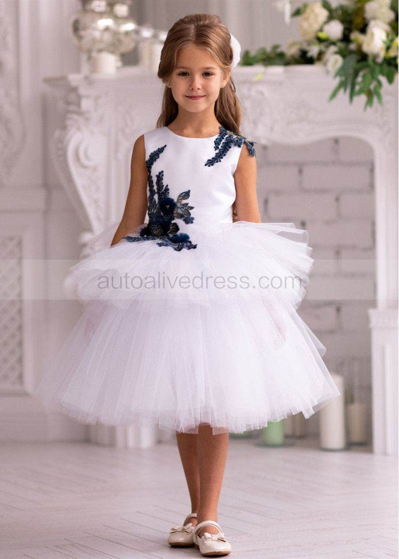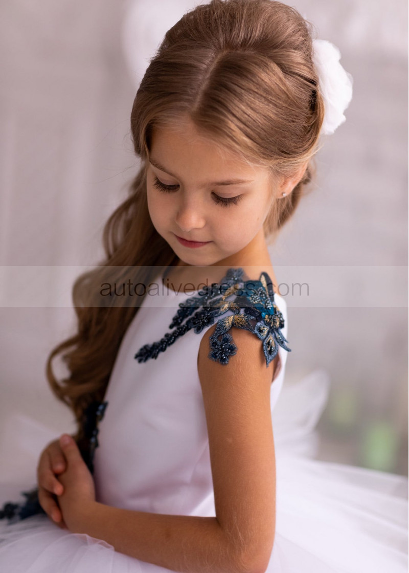 Beaded Navy Blue Lace White Tulle Tiered Flower Girl Dress