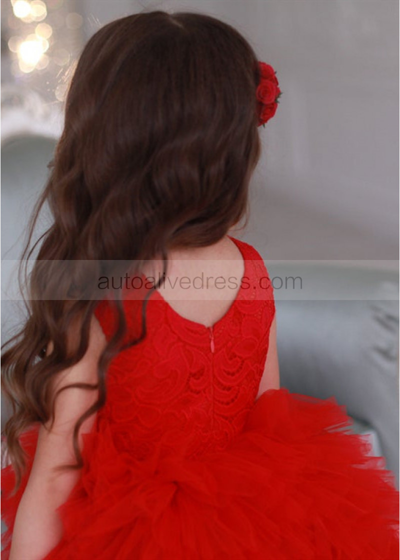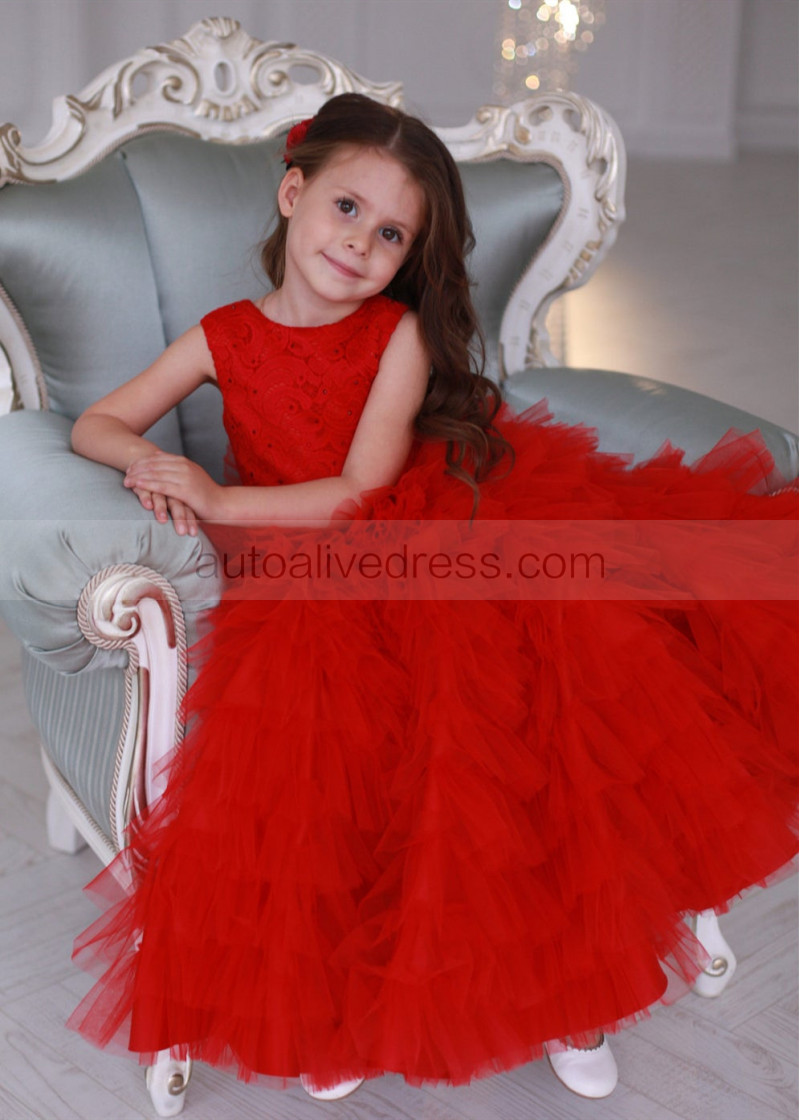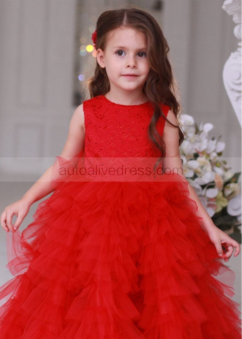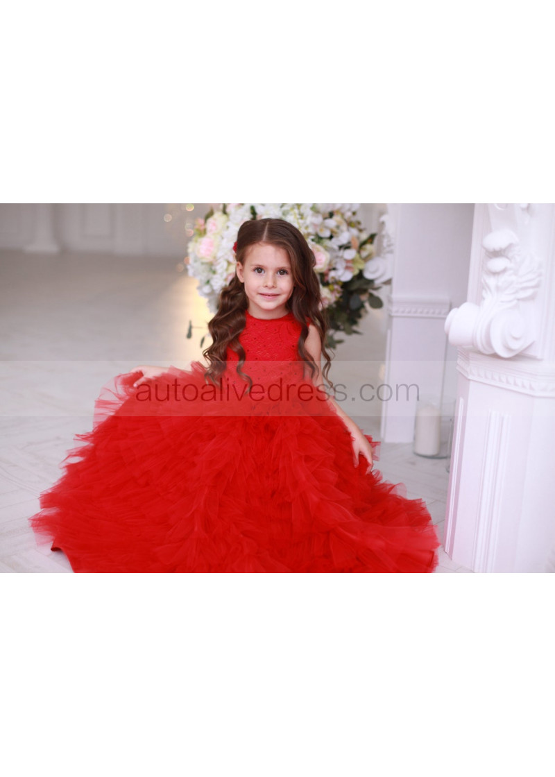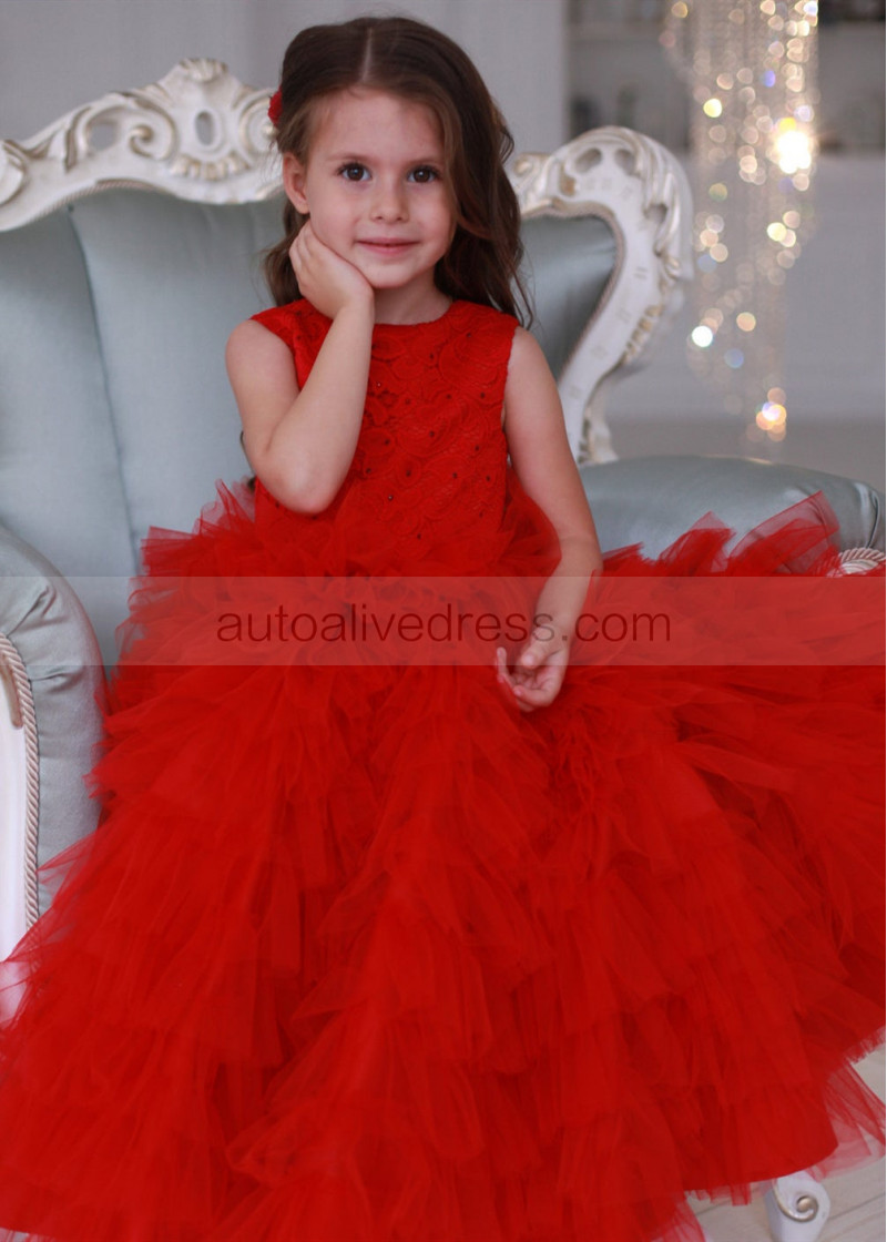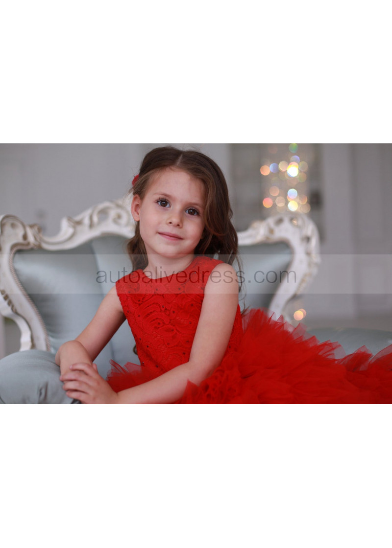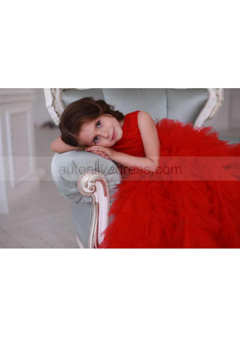 Beaded Red Lace Tulle Ruffle Flower Girl Dress Birthday Dress