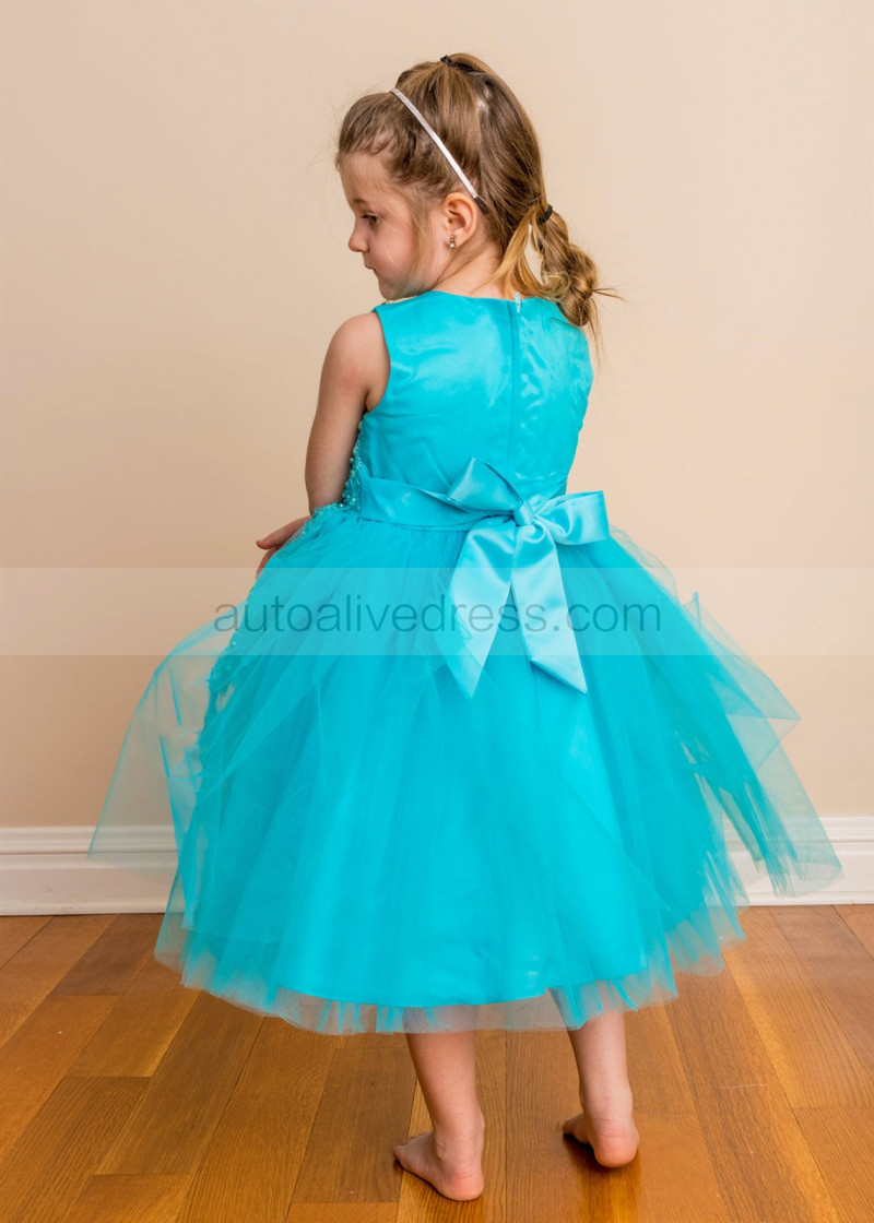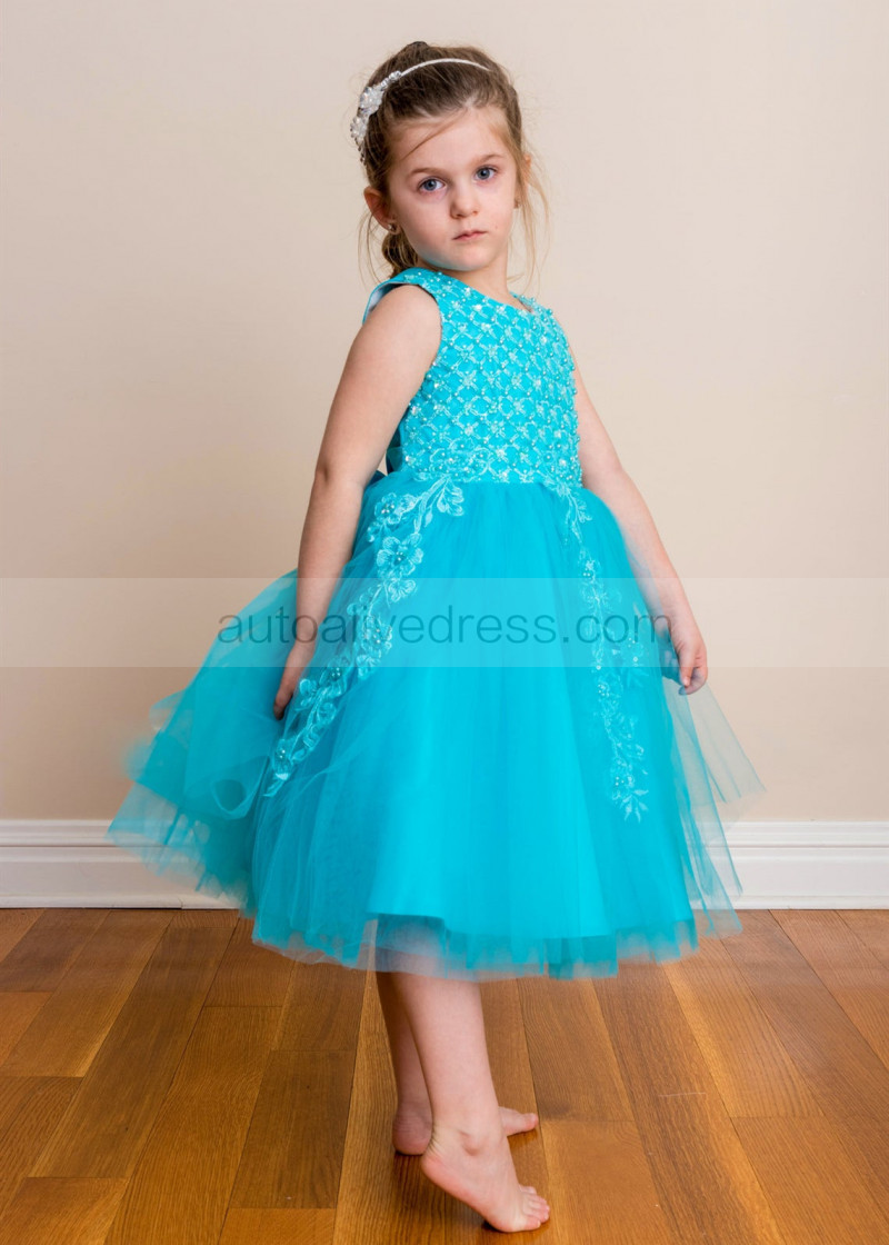 Beaded Turquoise Lace Tulle Tea Length Flower Girl Dress