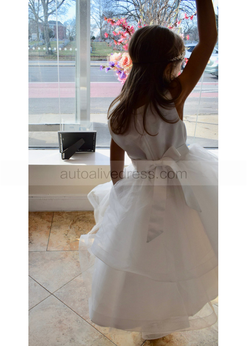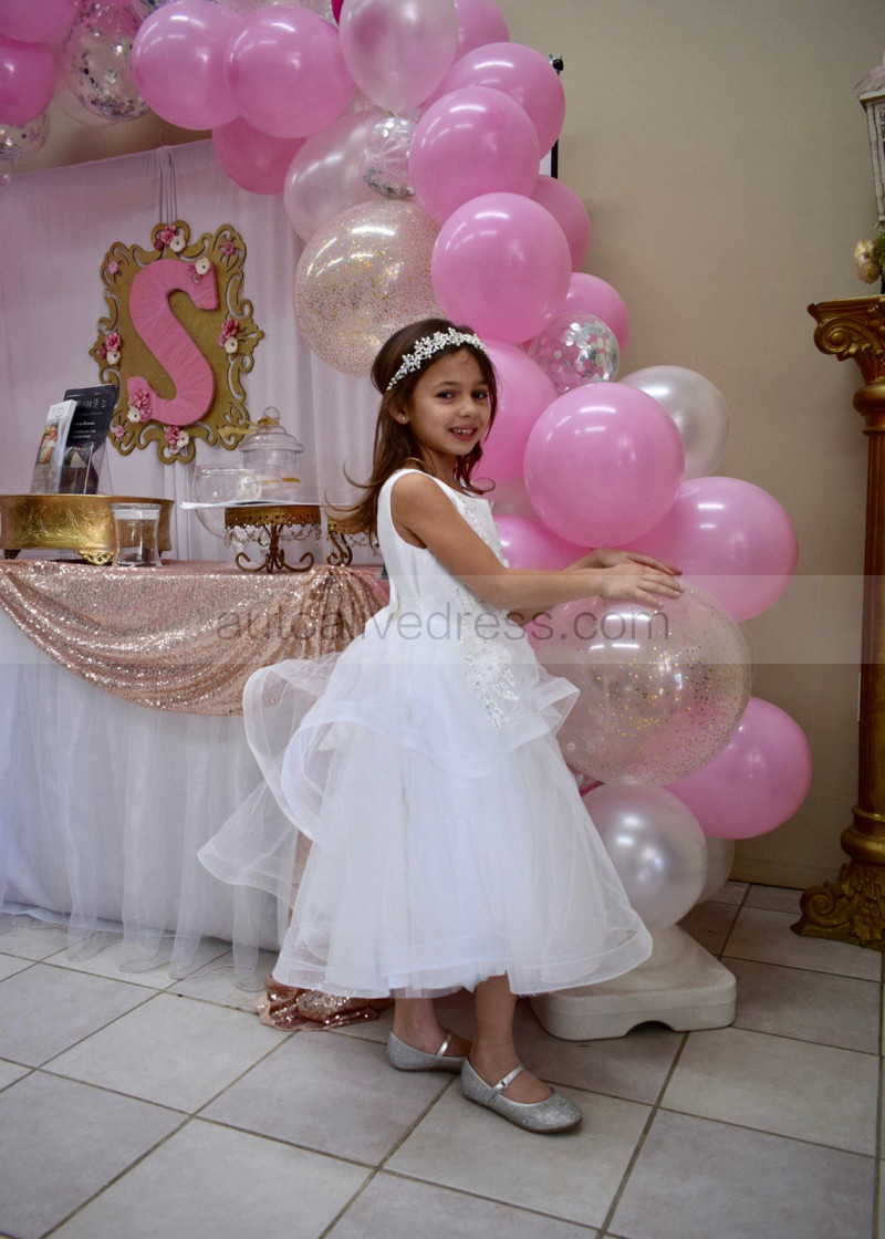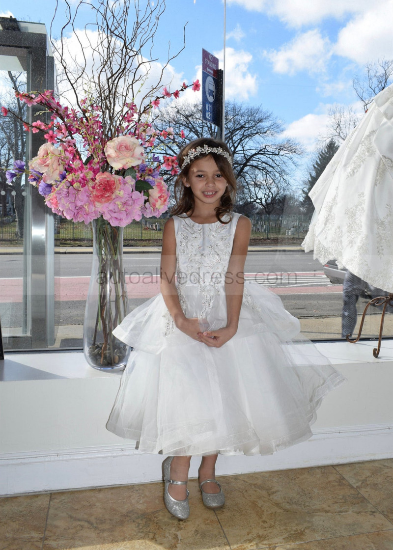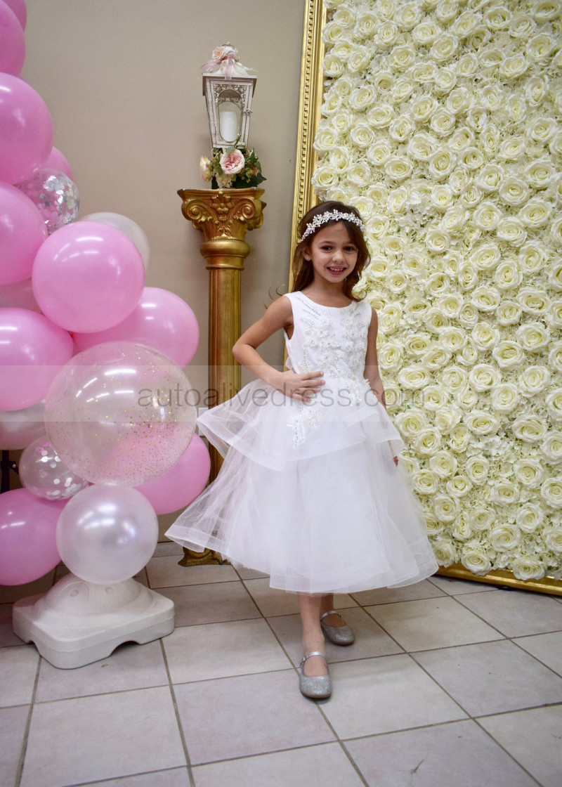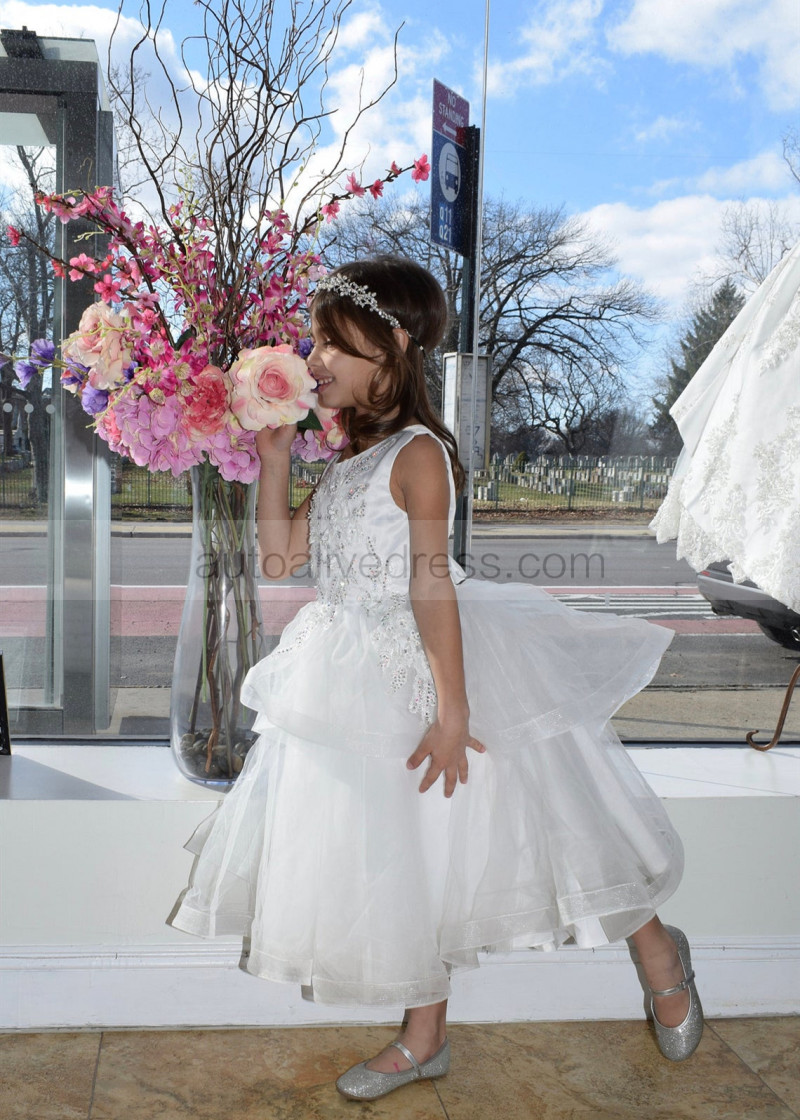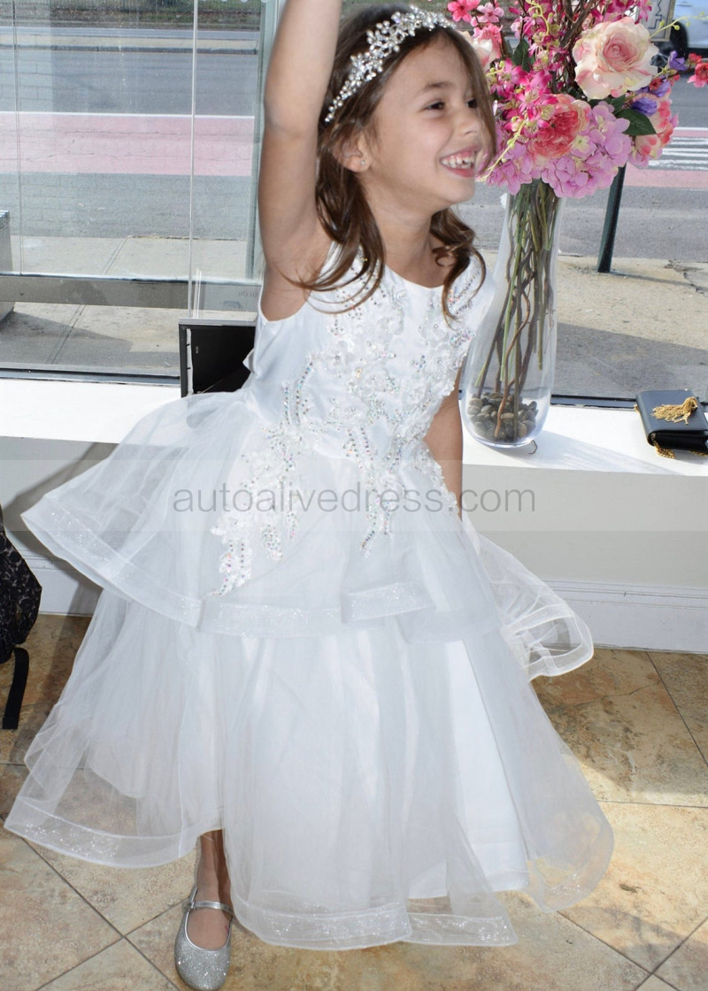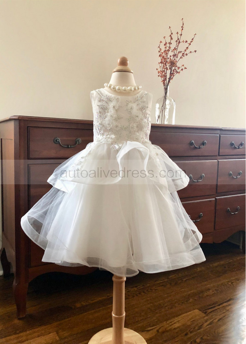 Beaded White 3D Flowers Tulle Tiered Flower Girl Dress