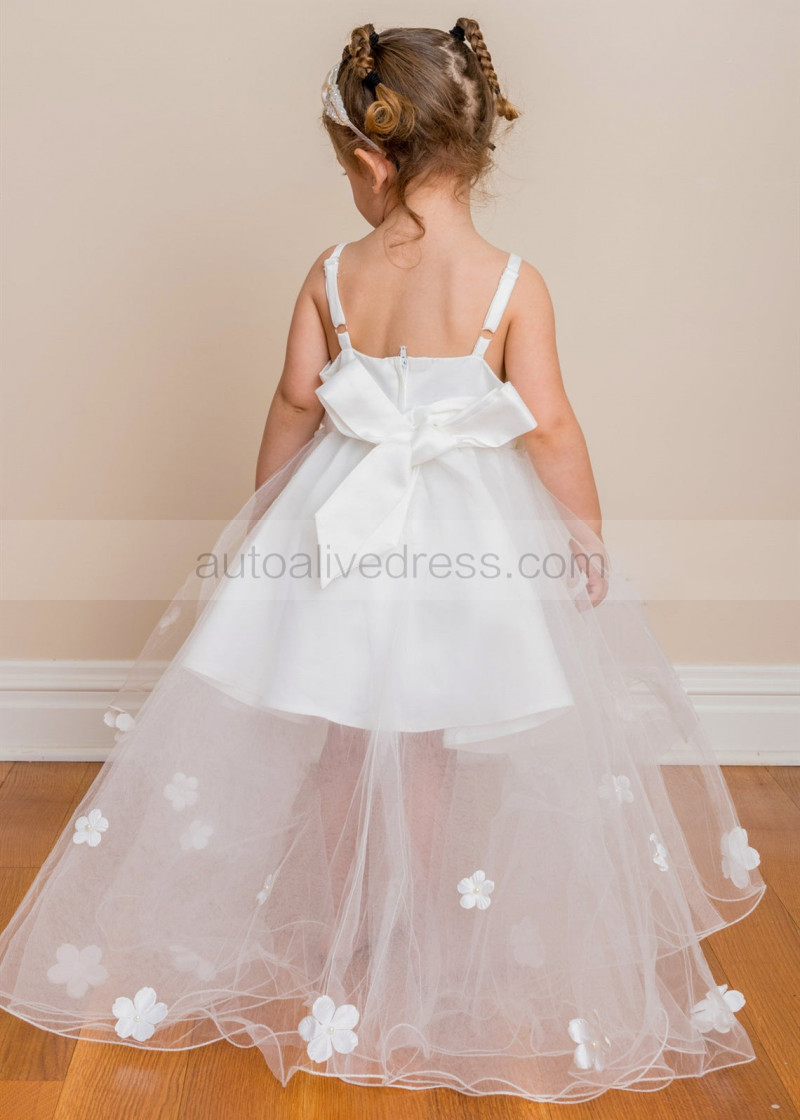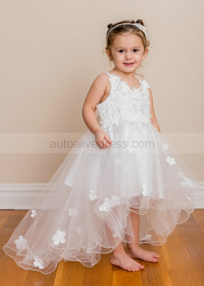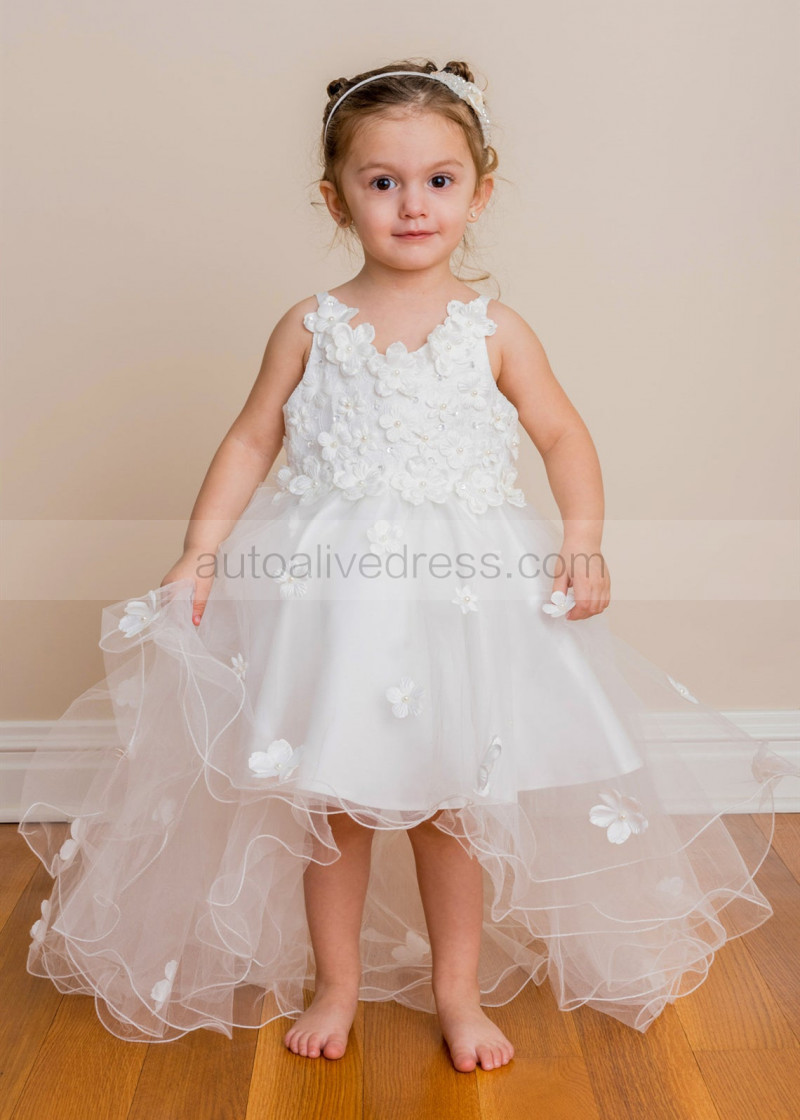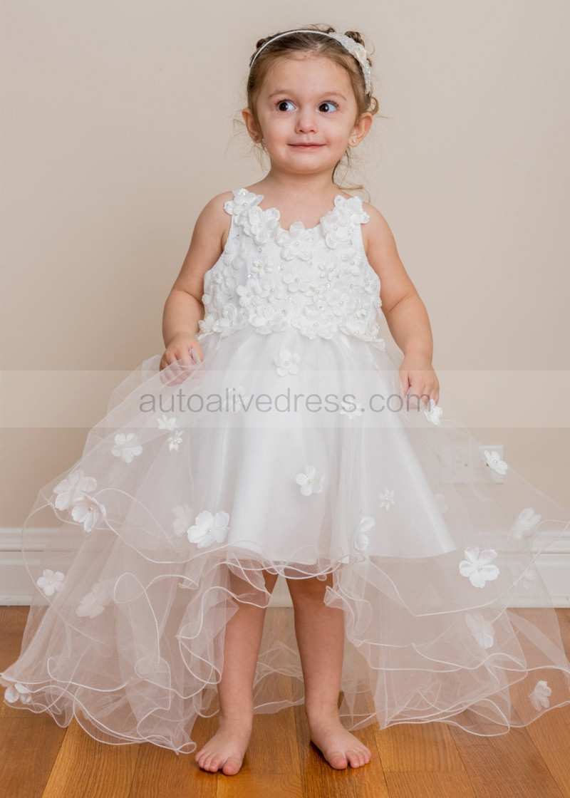 Beaded White Floral Tulle High Low Flower Girl Dress