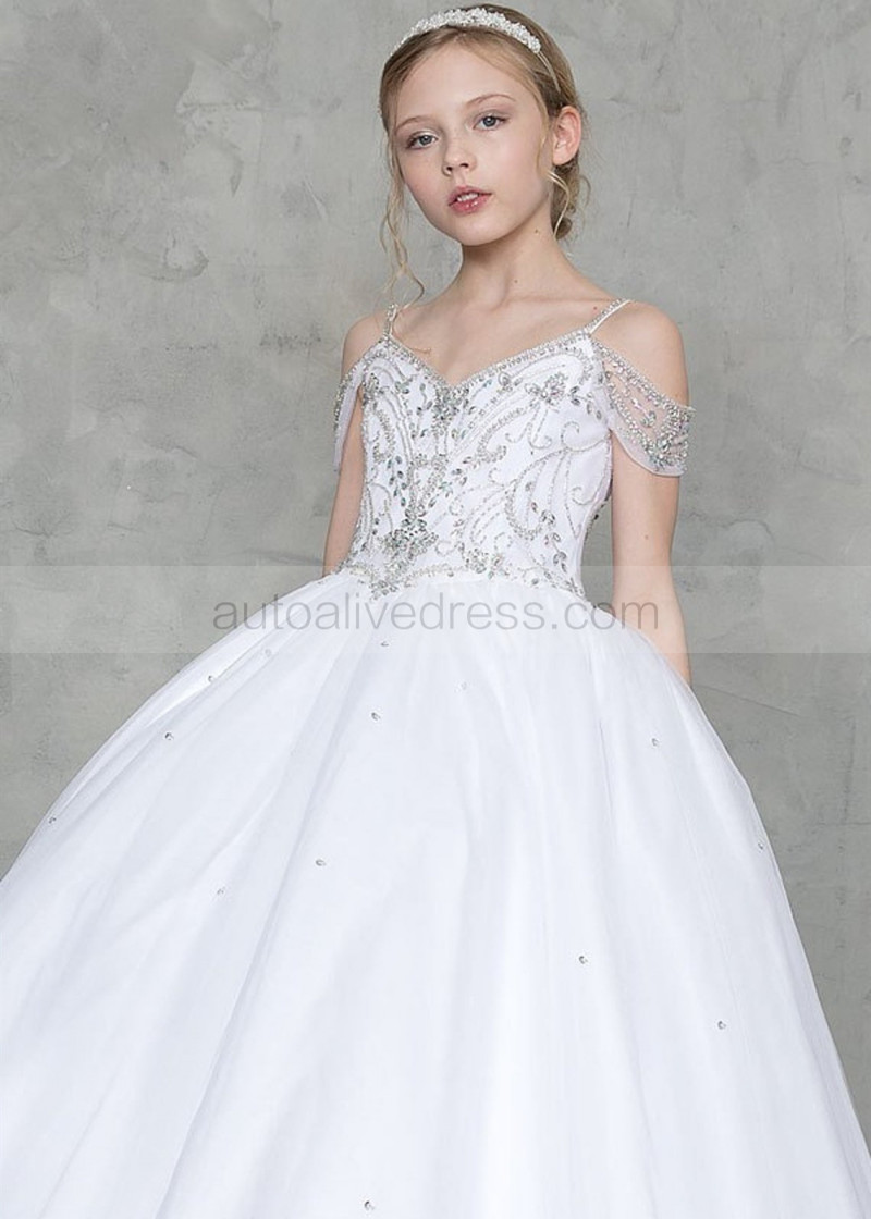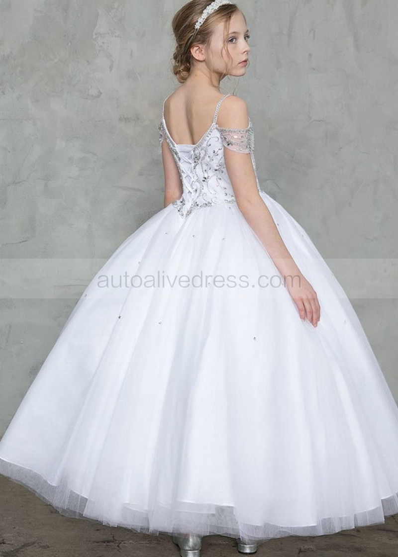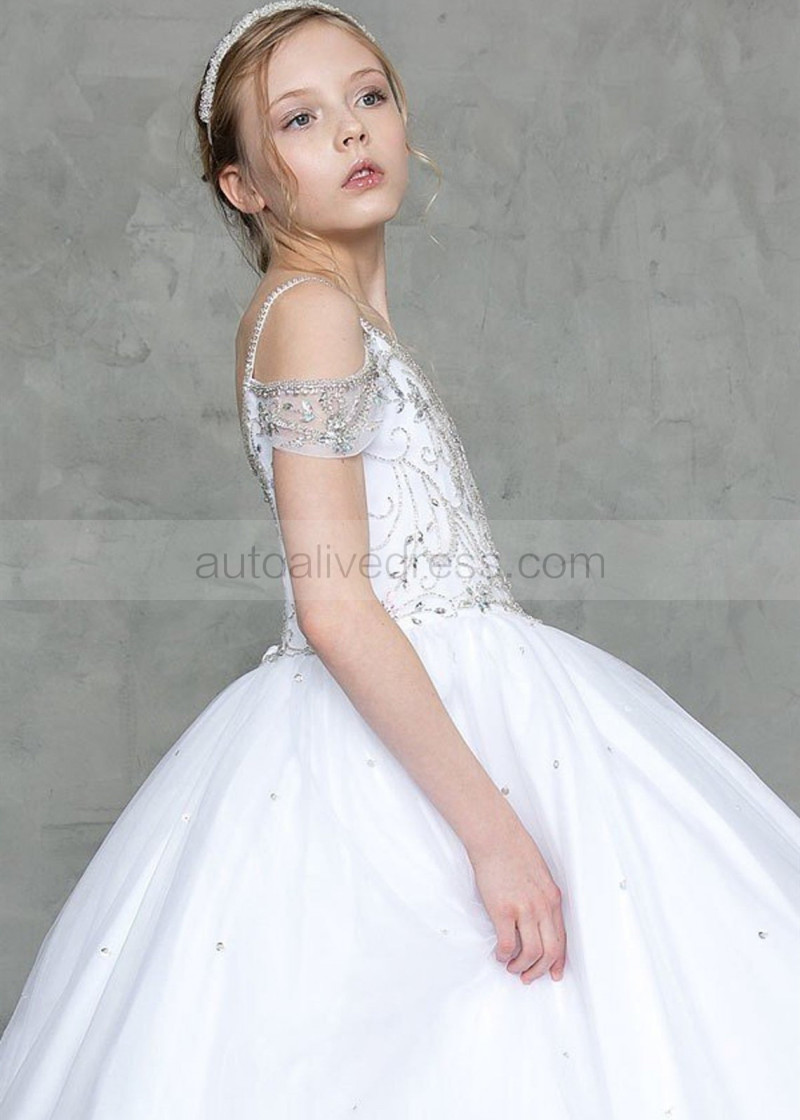 Beaded White Tulle Drop Waist Flower Girl Dress