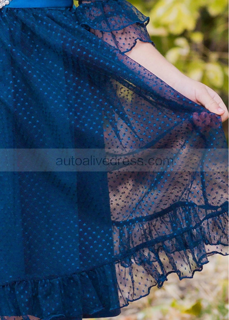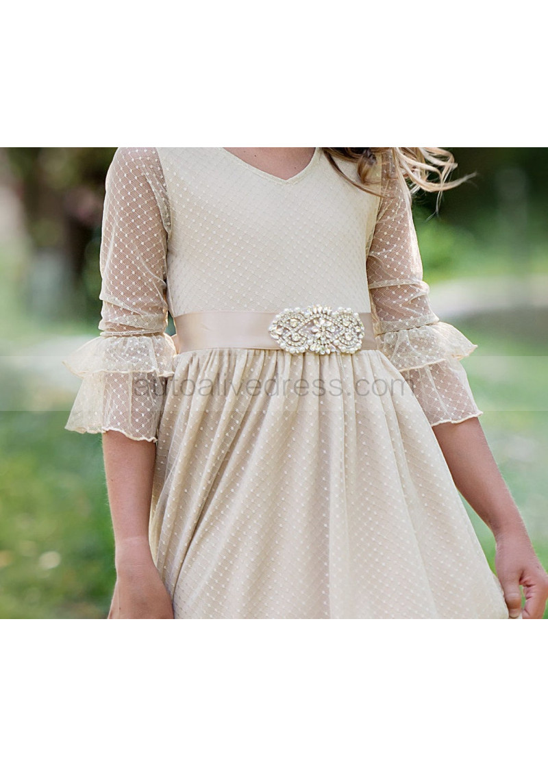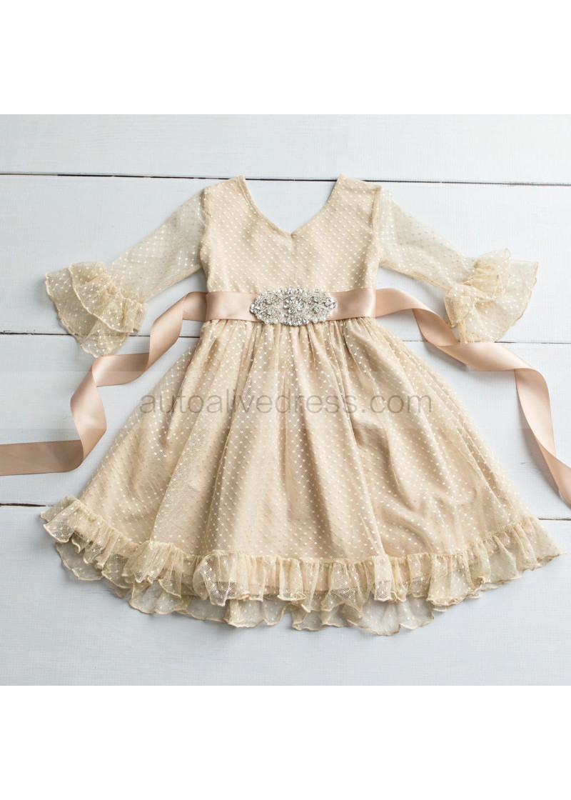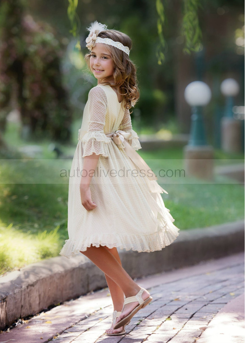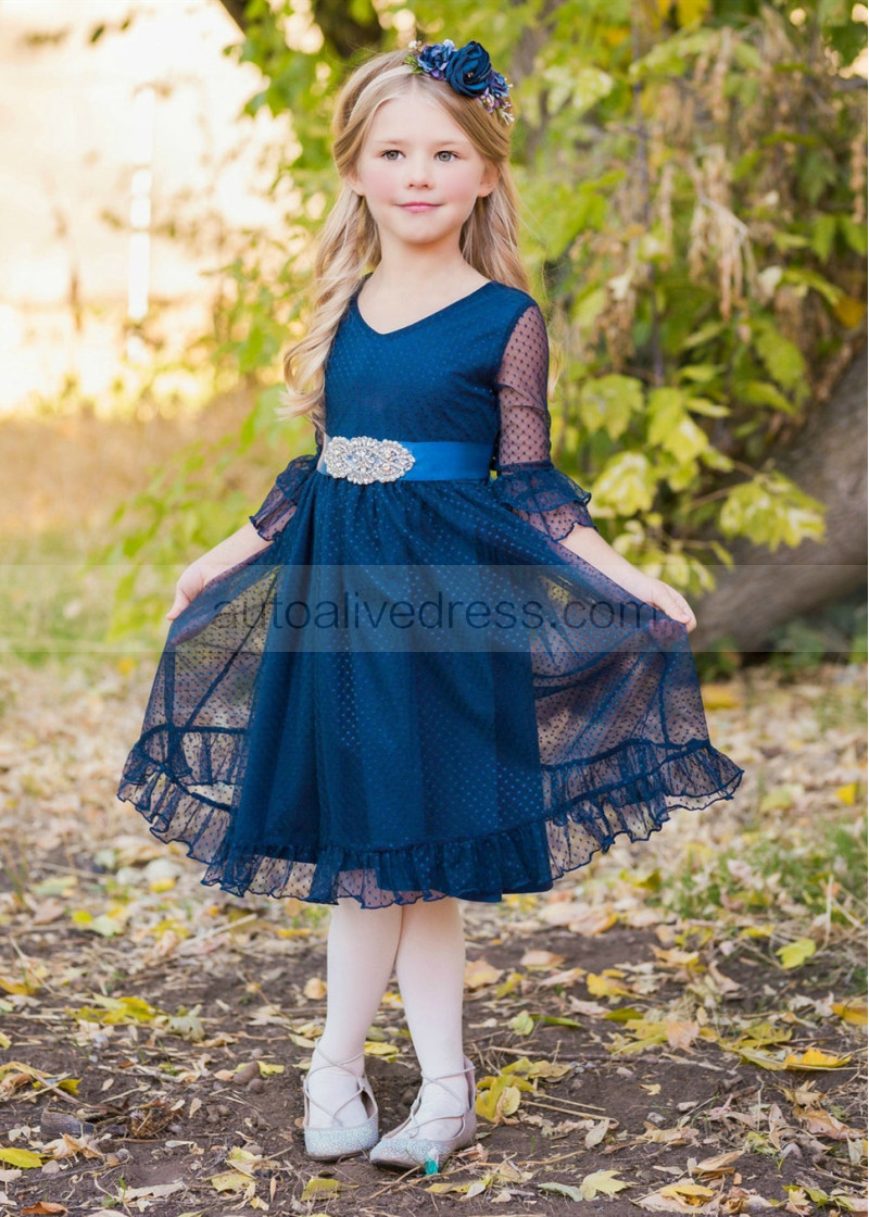 Bell Sleeve Polka Dot Tulle Knee Length Flower Girl Dress
