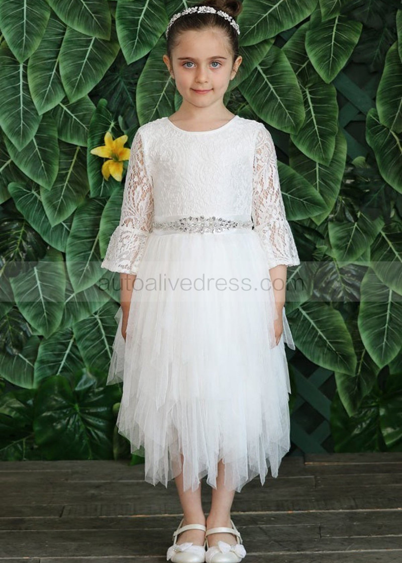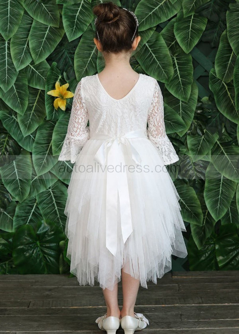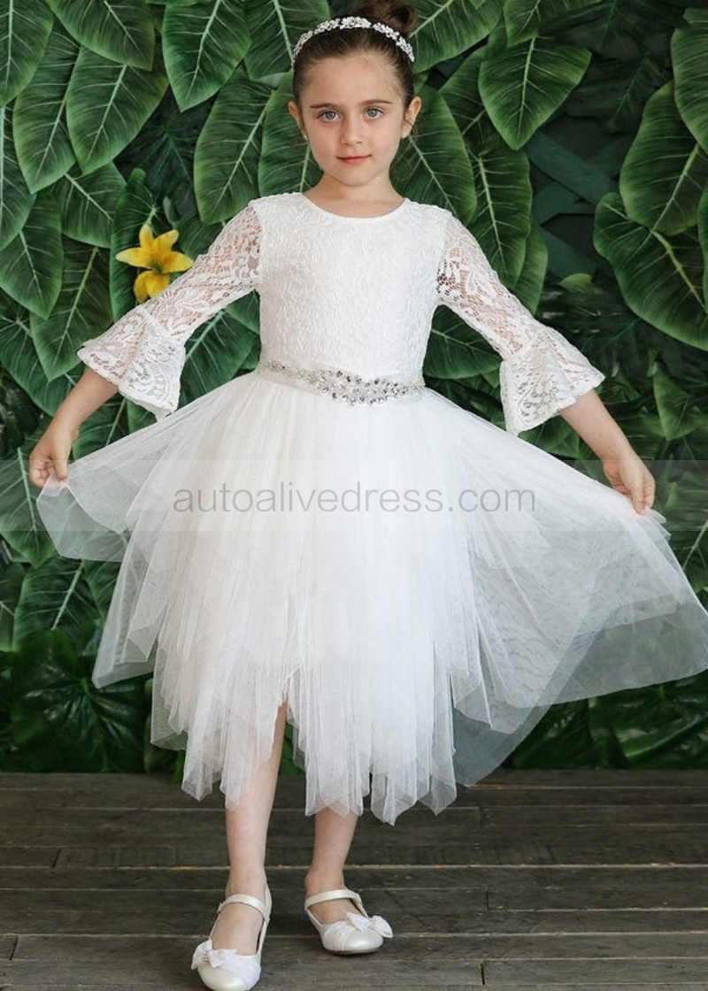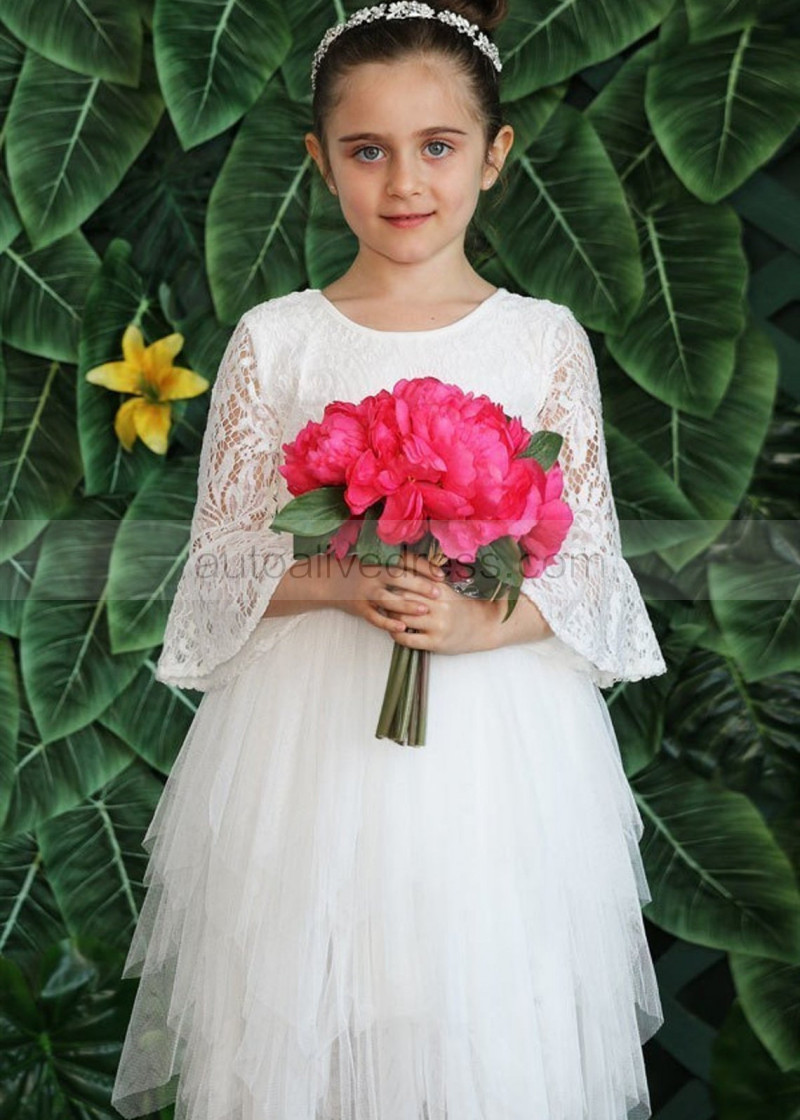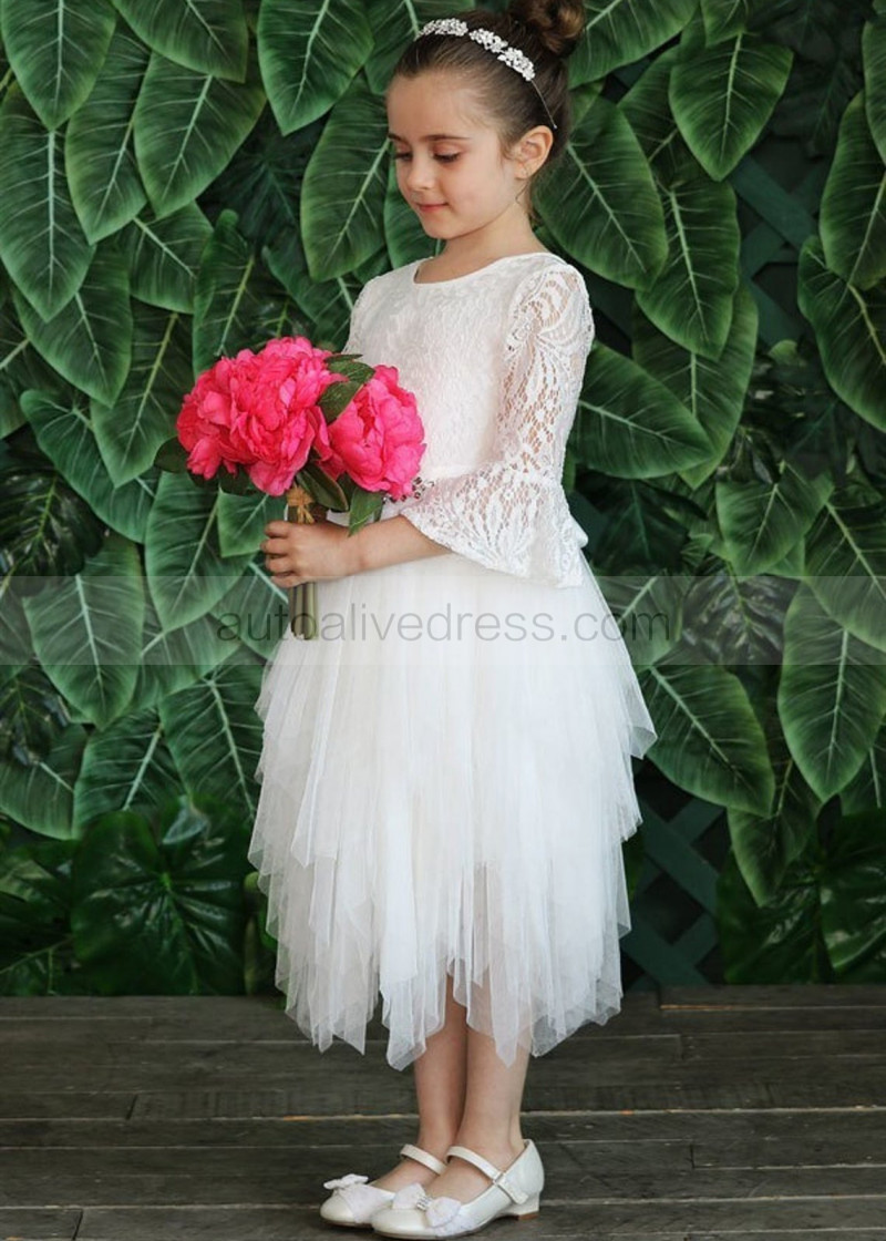 Bell Sleeves Ivory Lace Handkerchief Tulle Skirt Flower Girl Dress