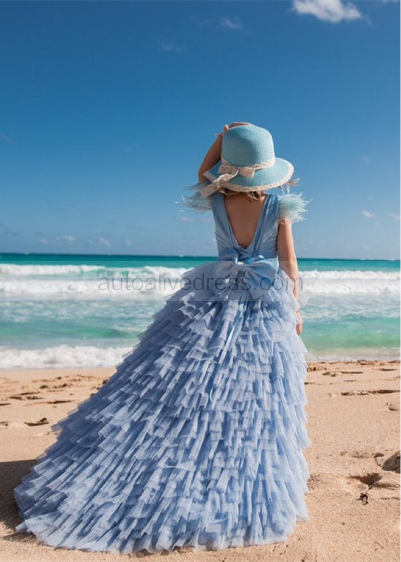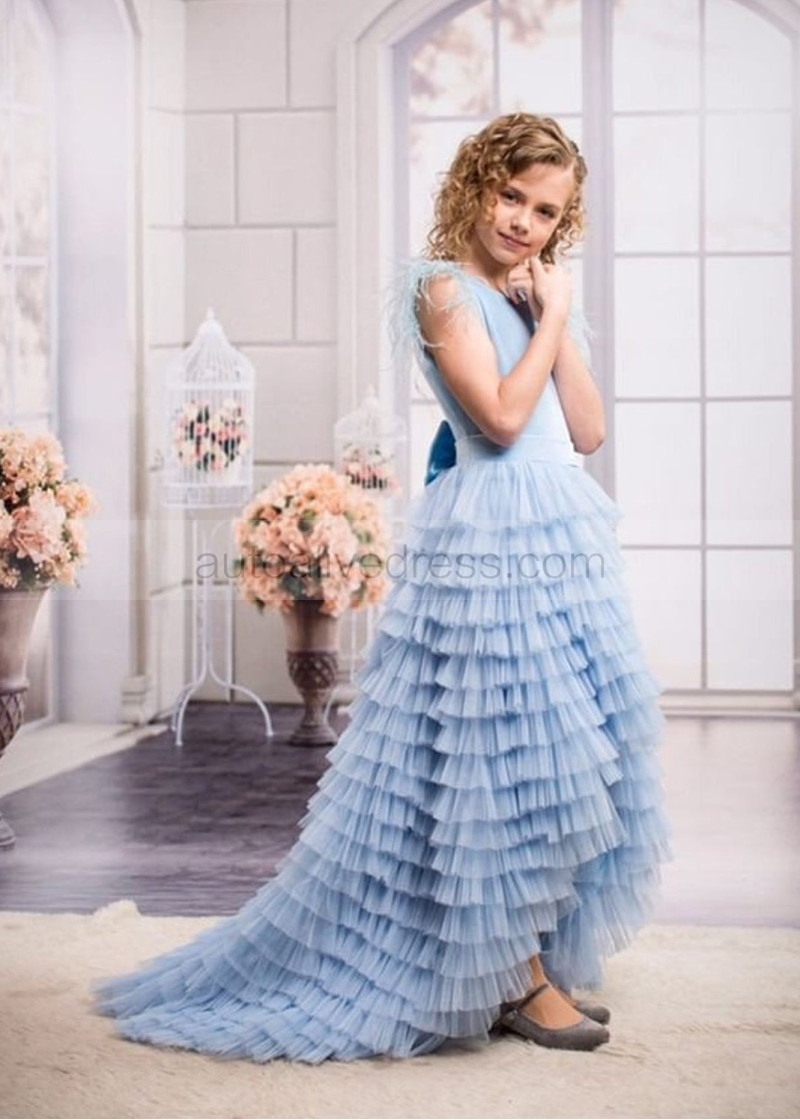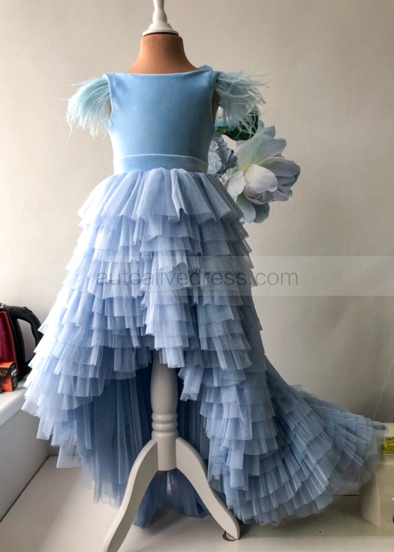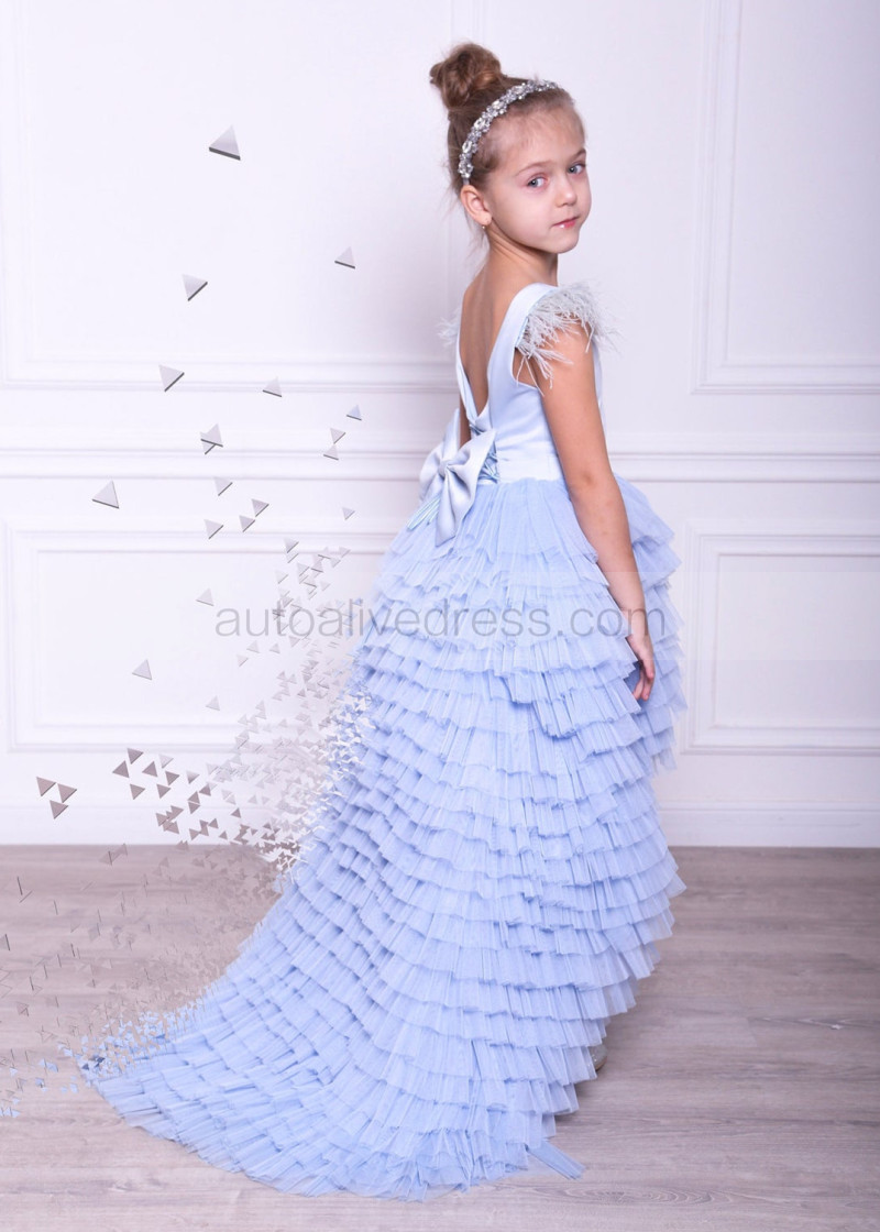 Blue Ruffled Tulle Feather High Low Flower Girl Dress