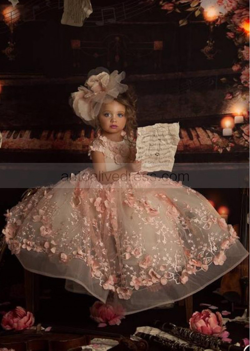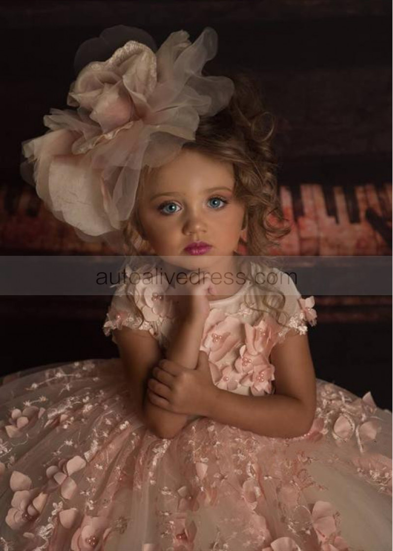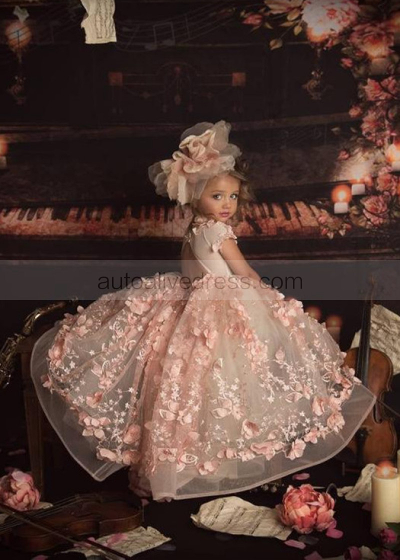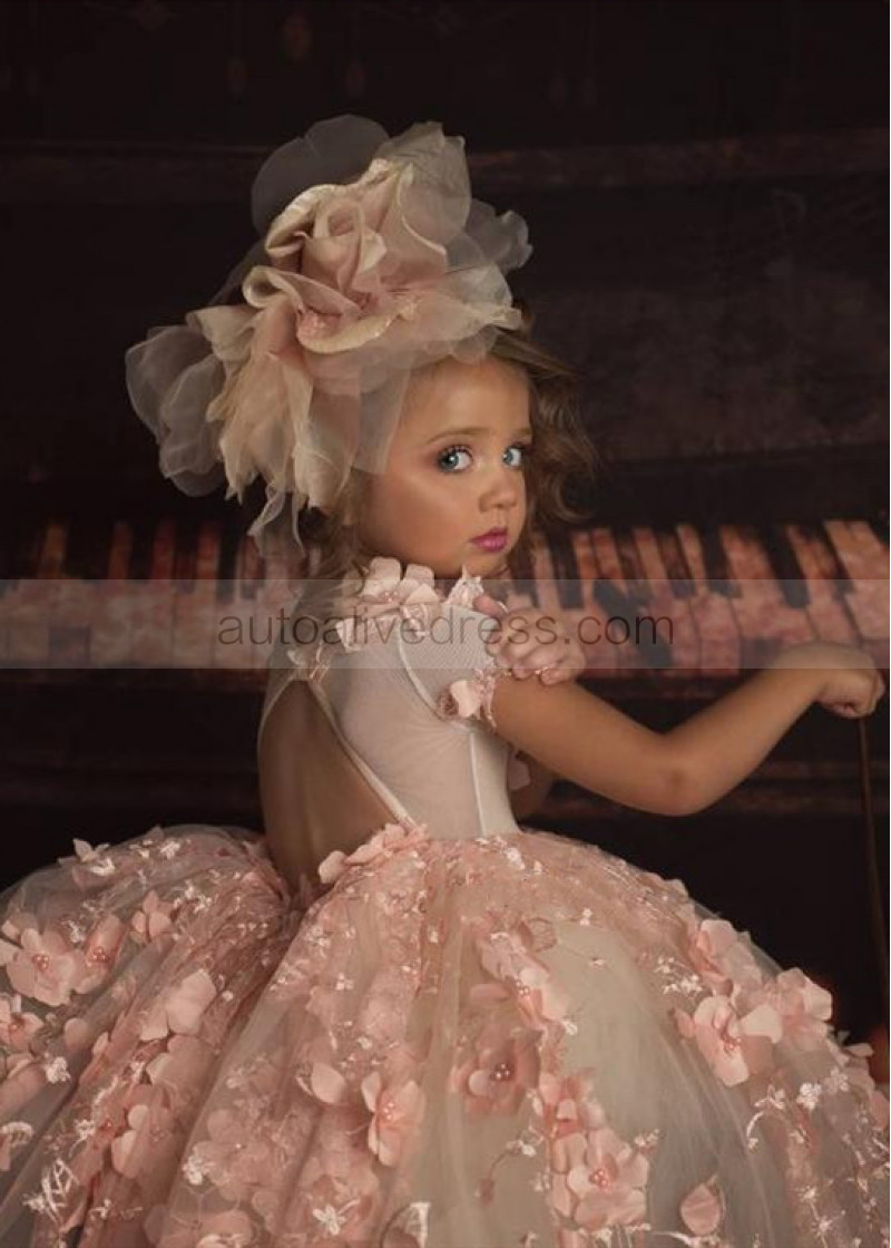 Blush Pink Pearl Beaded 3D Floral Flower Girl Dress