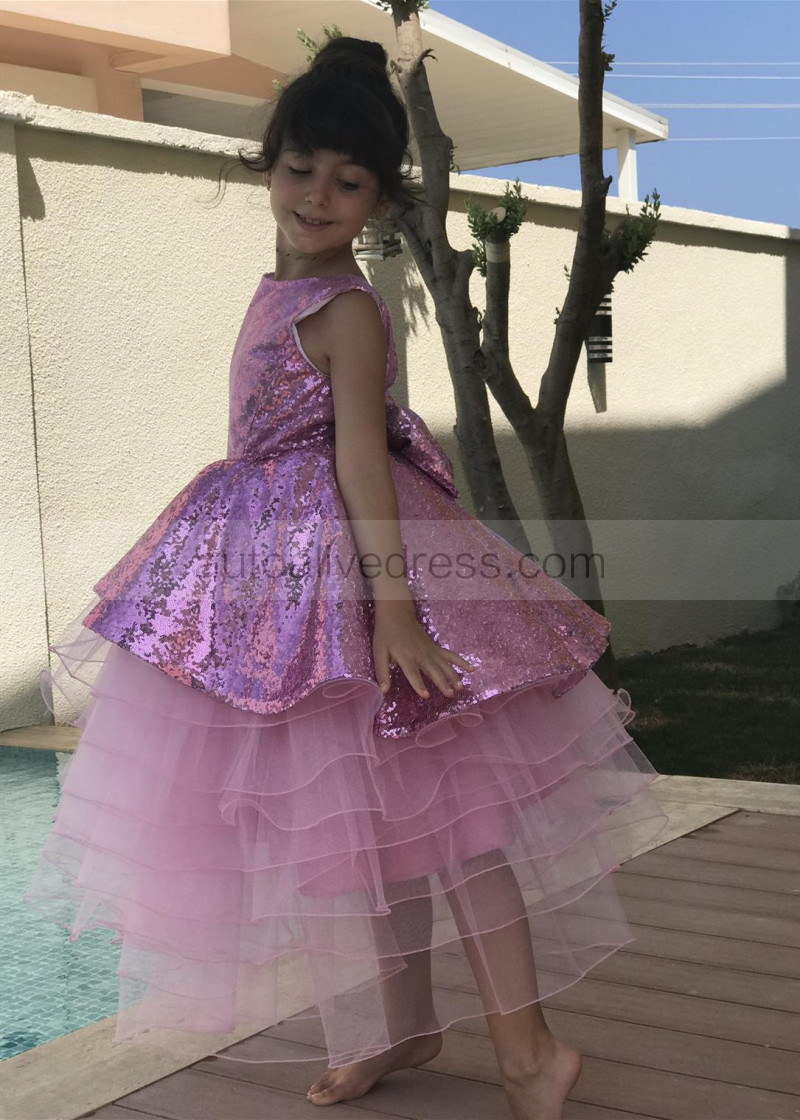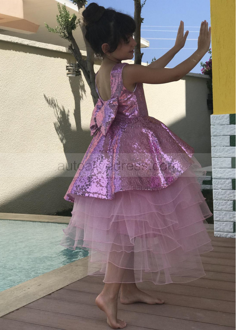 Bright Pink Sequin Organza Peplum Flower Girl Dress
