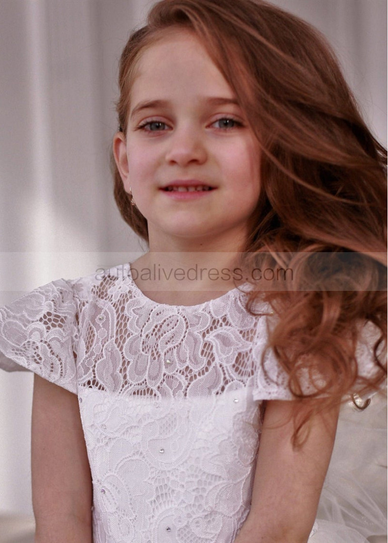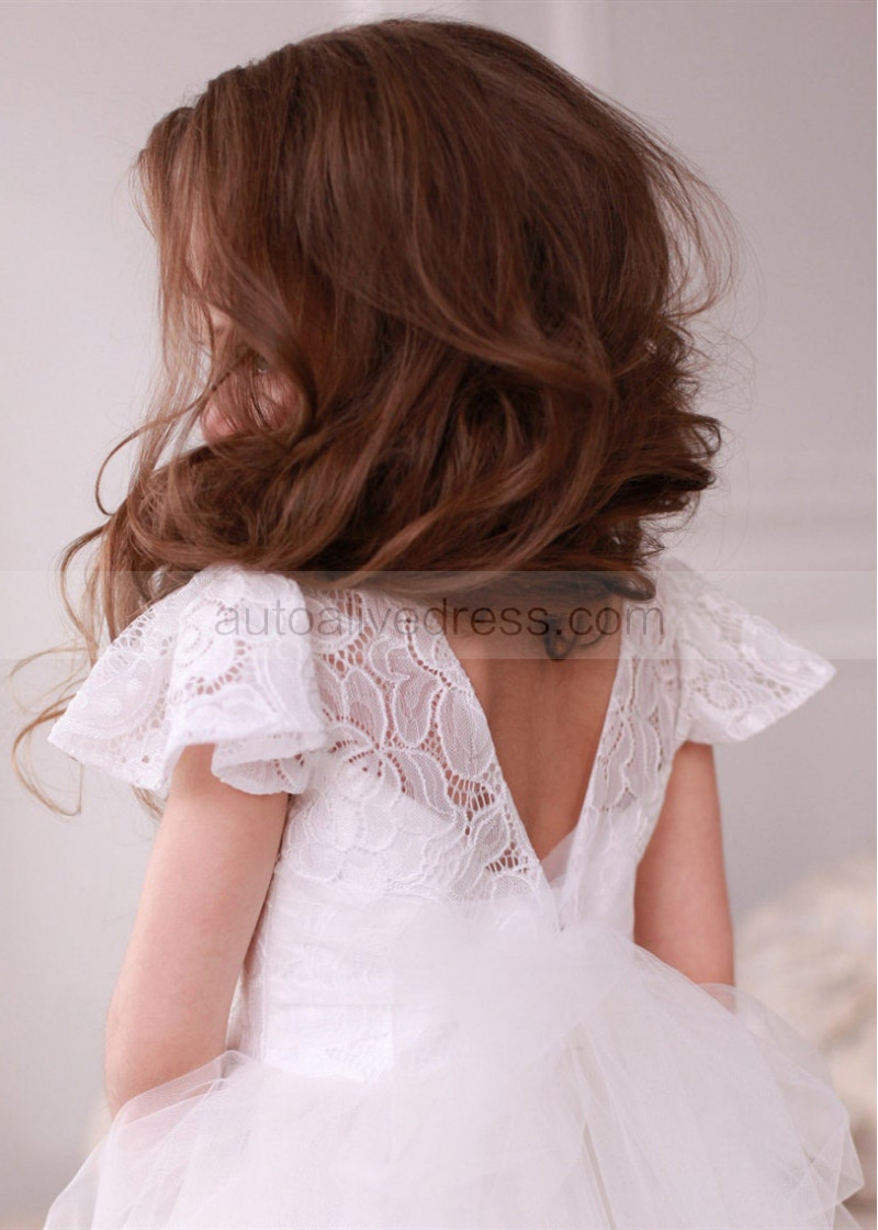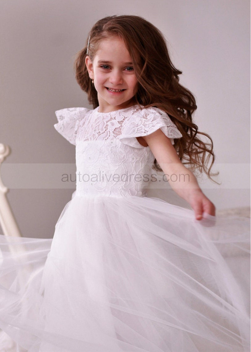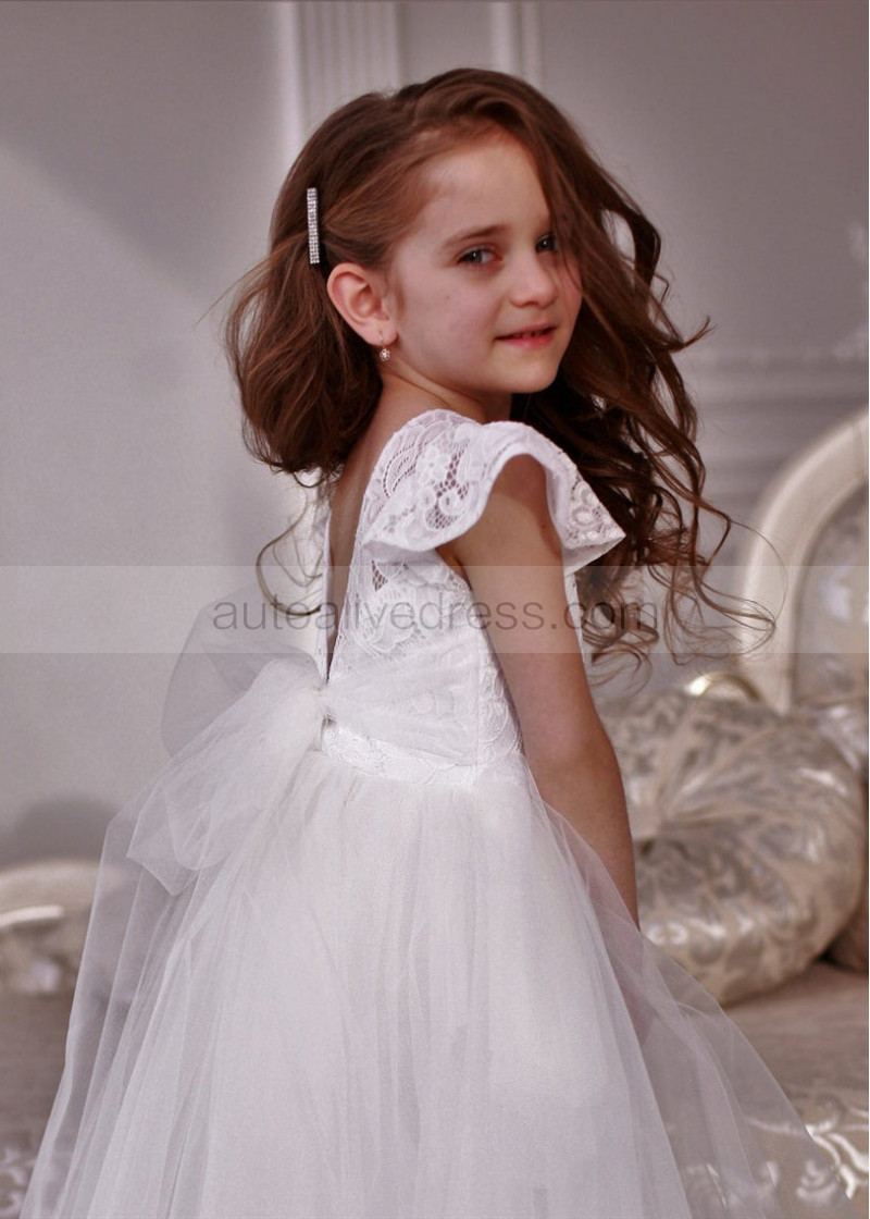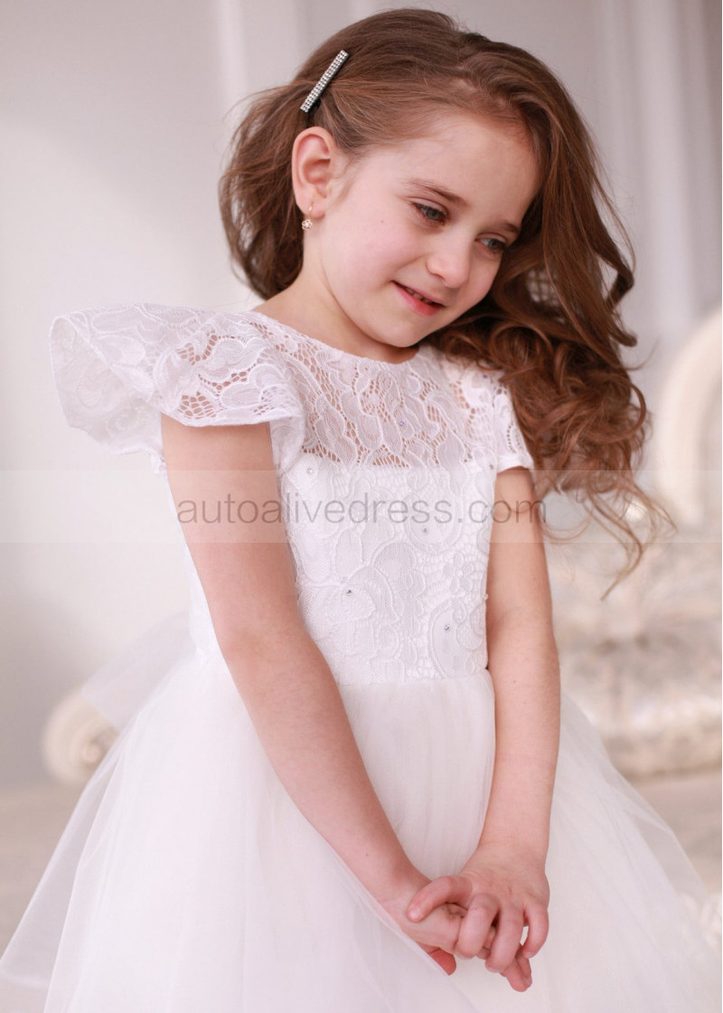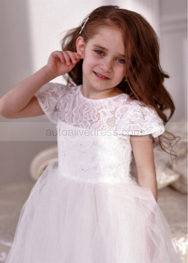 Cap Sleeve Ivory Lace Tulle Tea Length Flower Girl Dress