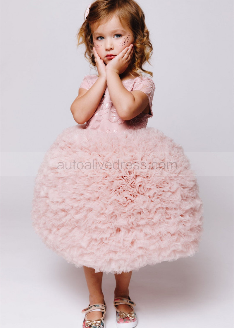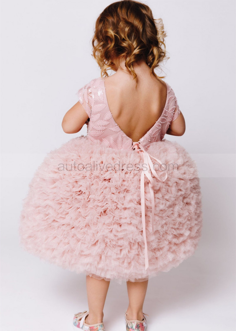 Cap Sleeves Beaded Pink Tulle Ruffle Flower Girl Dress