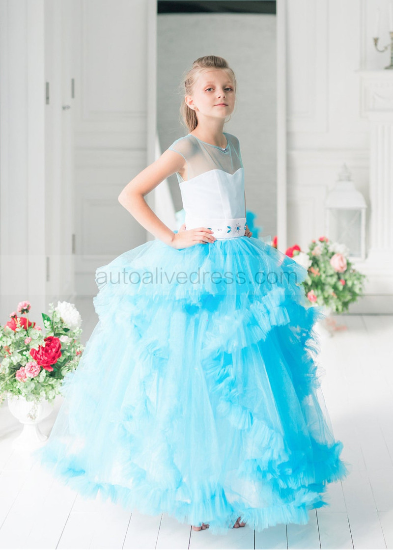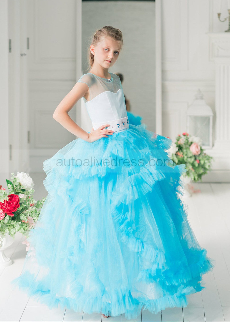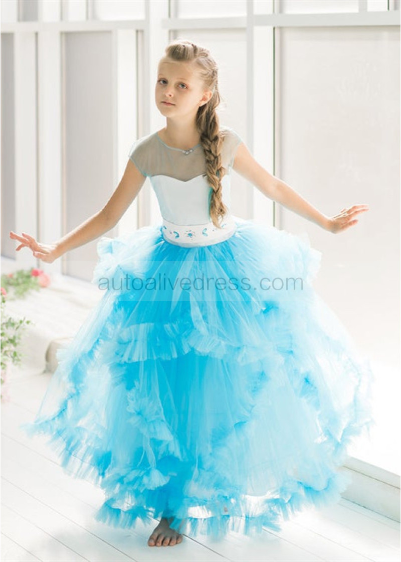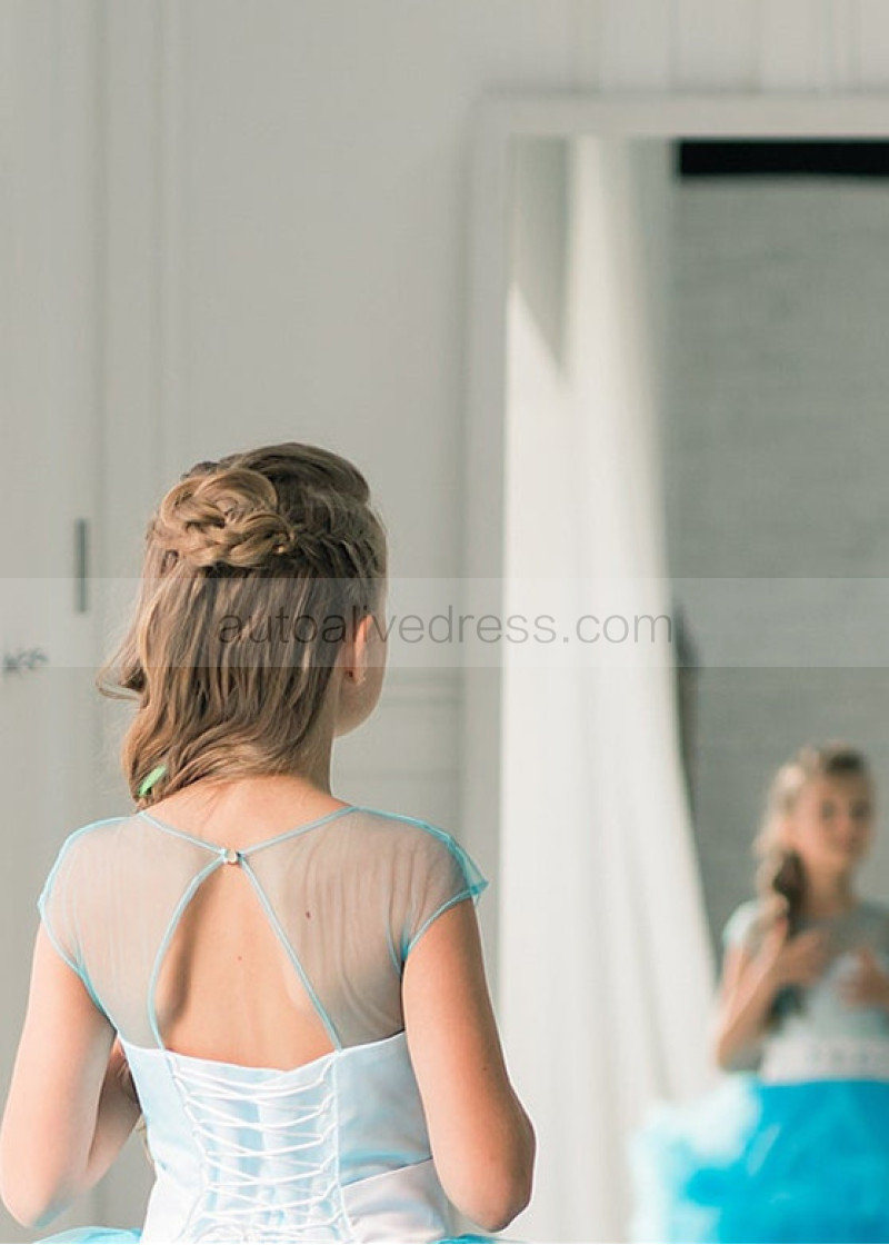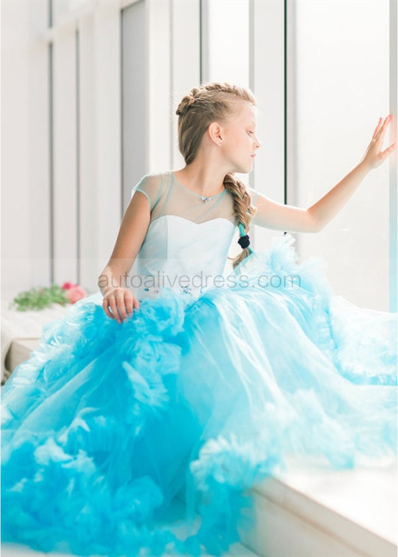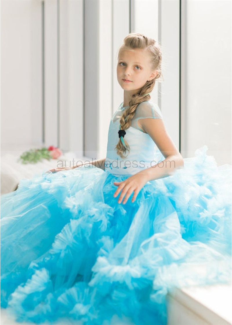 Cap Sleeves Blue Tulle Clouds Ruffled Flower Girl Dress