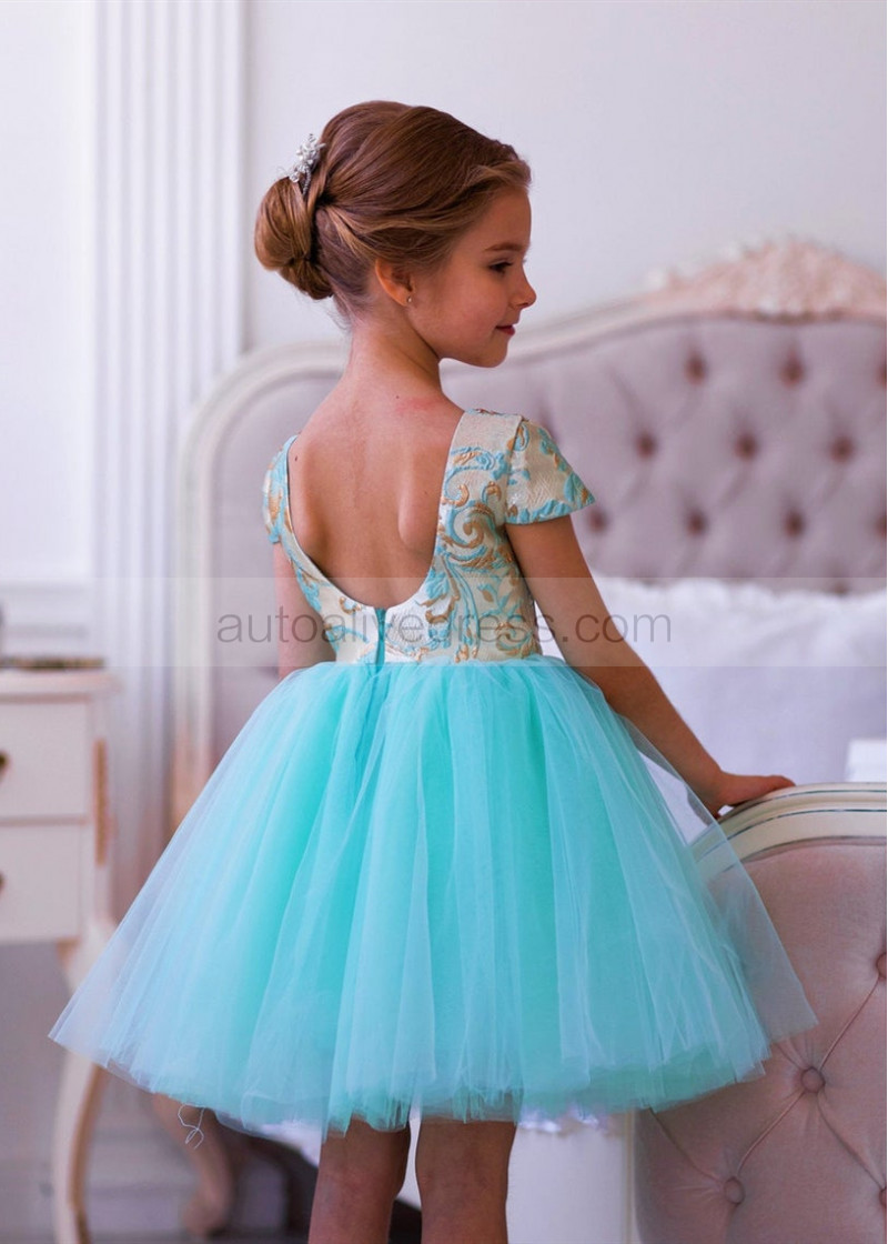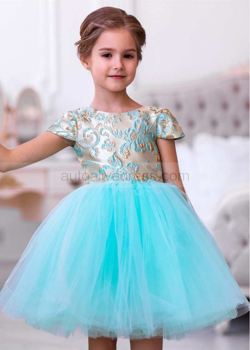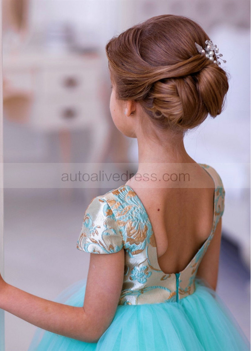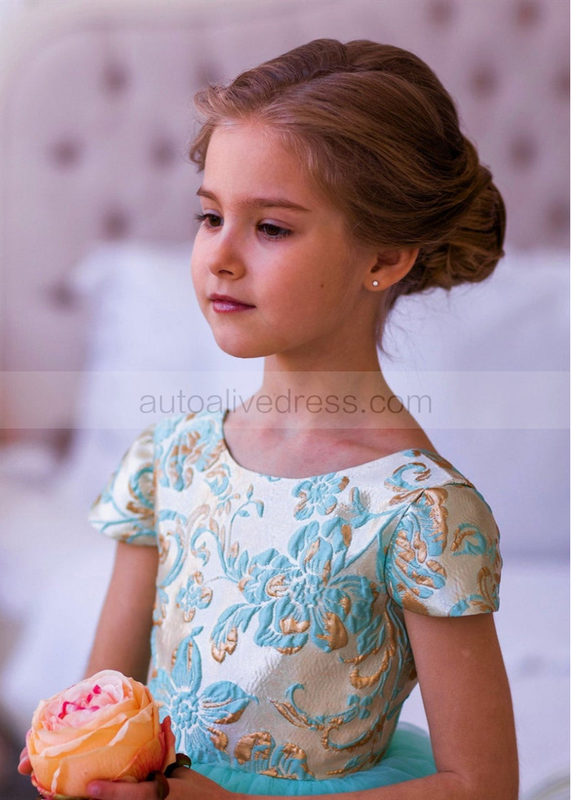 Cap Sleeves Tiffany Blue Jacquard Tulle V Back Flower Girl Dress