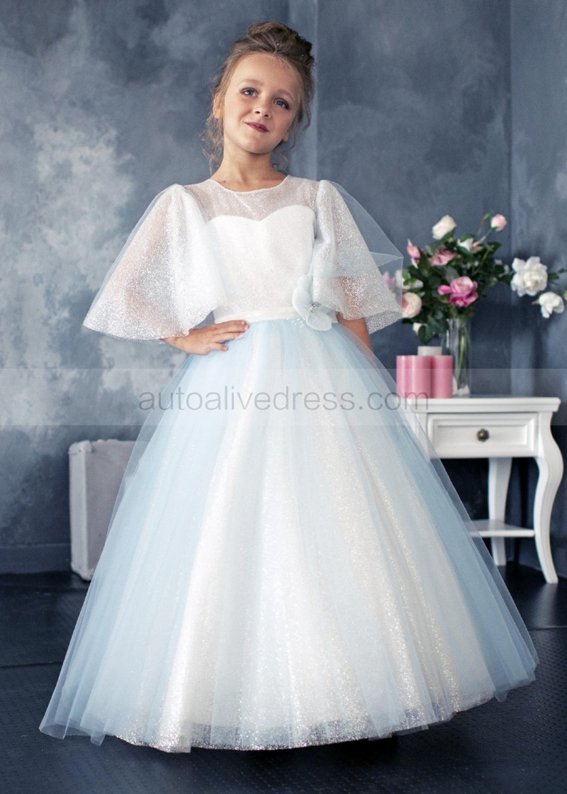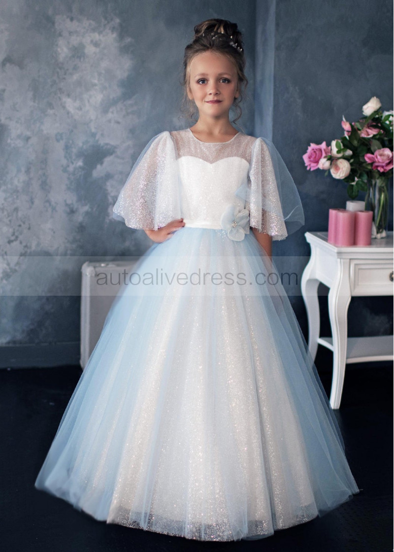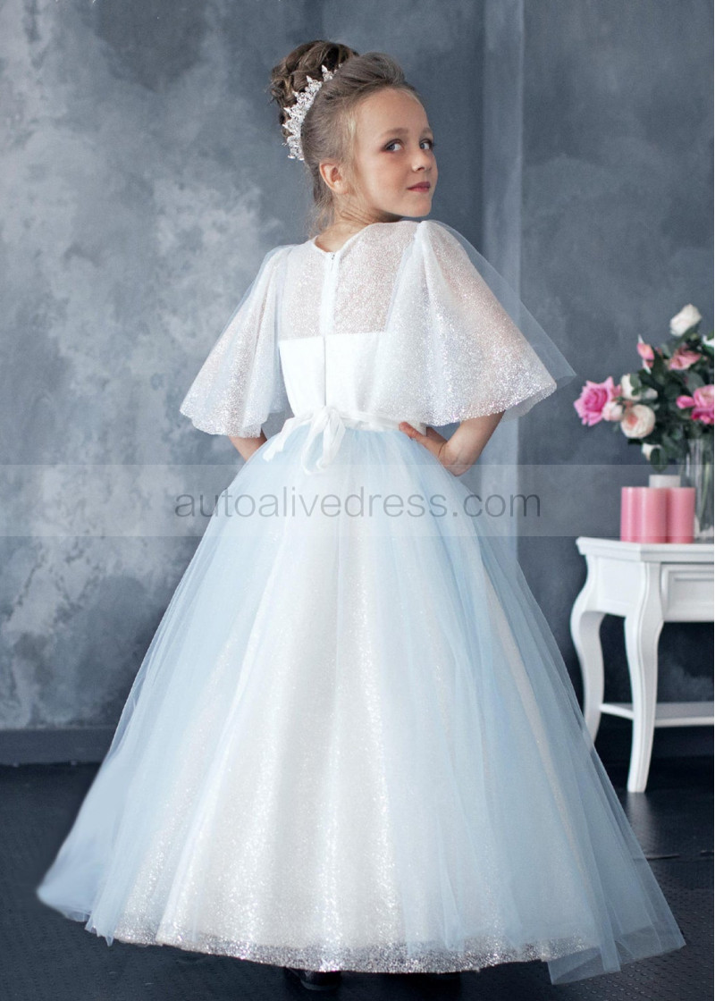 Cape Sleeves Ivory And Soft Blue Glitter Tulle Flower Girl Dress