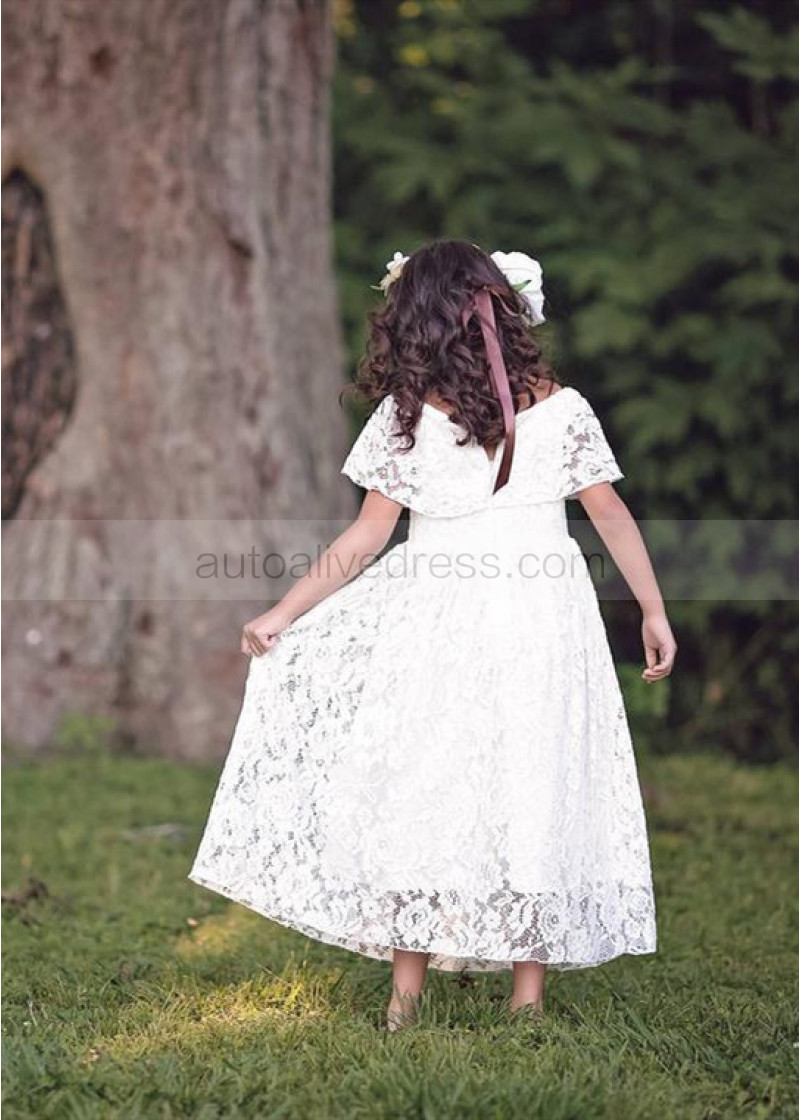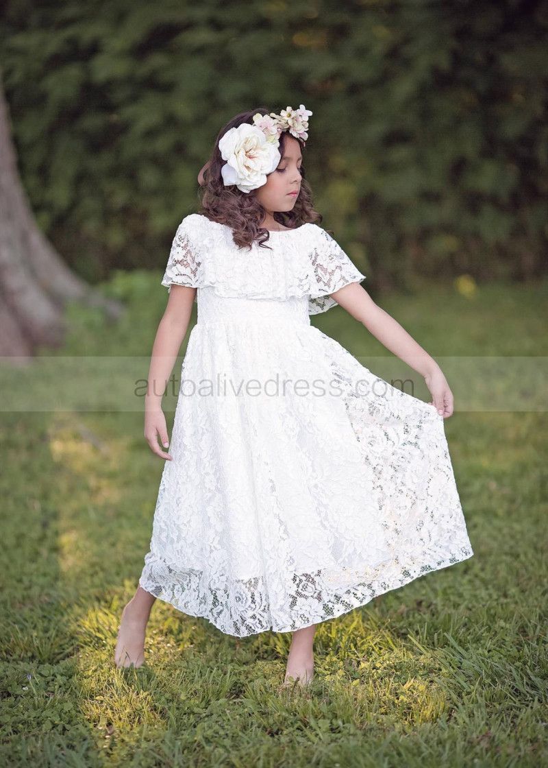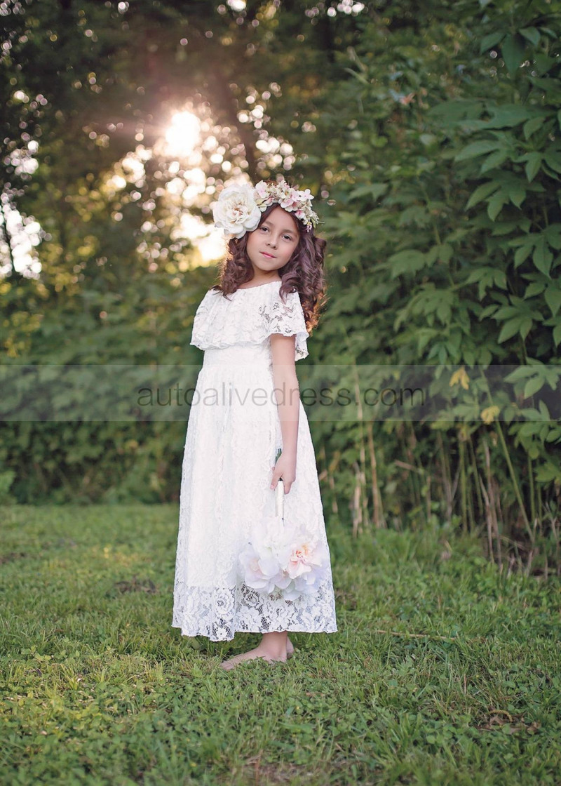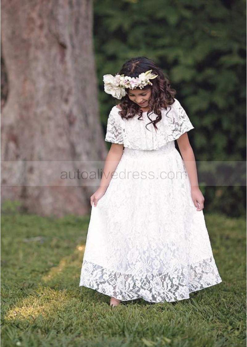 Cape Sleeves Ivory Lace Ankle Length Flower Girl Dress