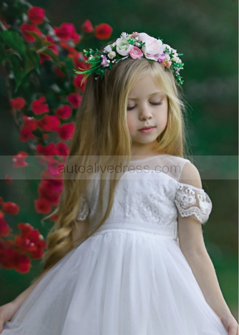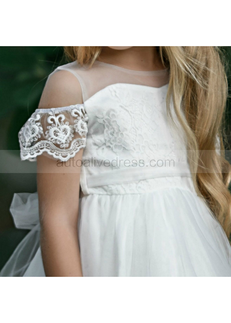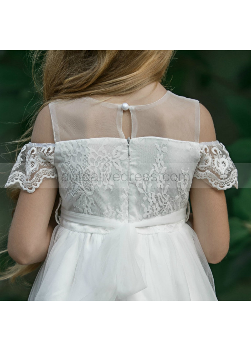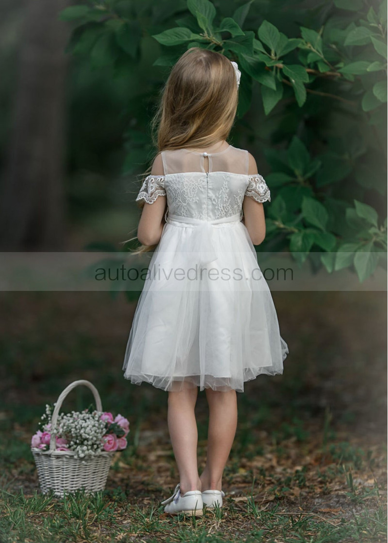 Cold Shoulder Ivory Lace Tulle Short Flower Girl Dress