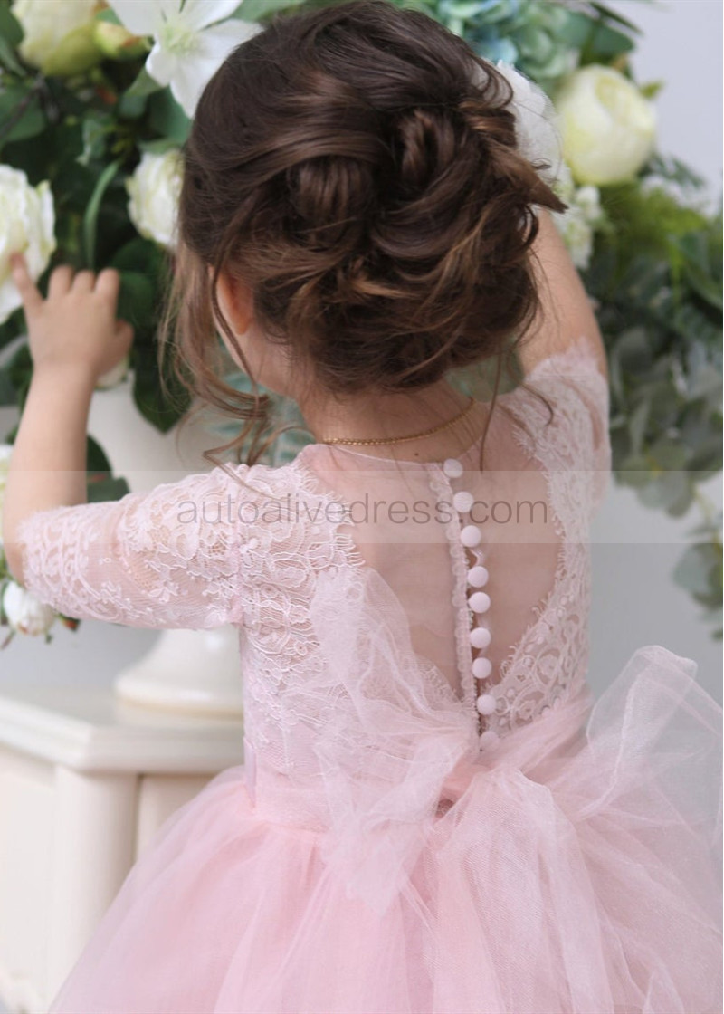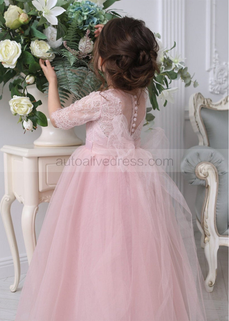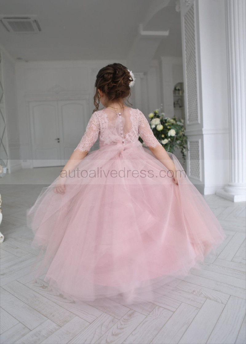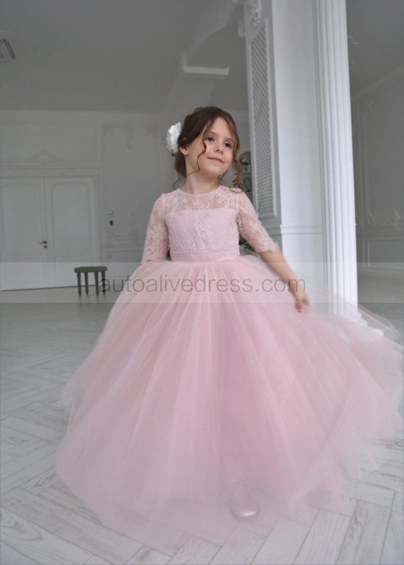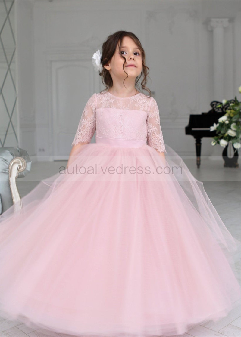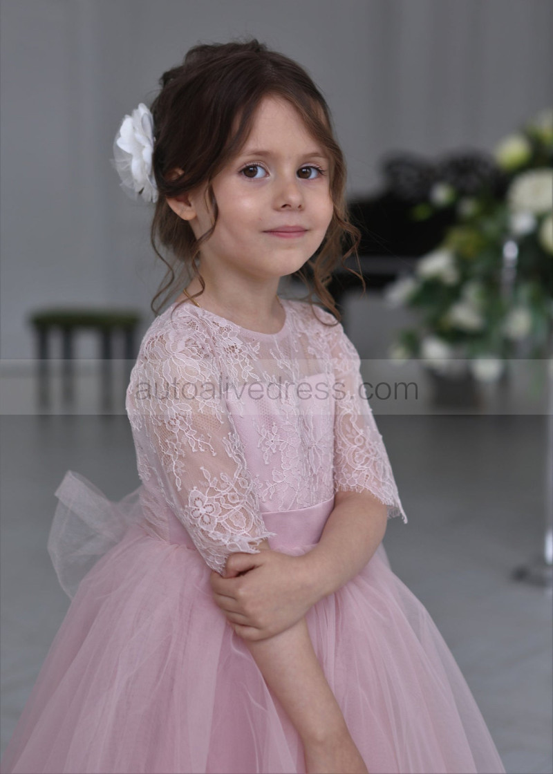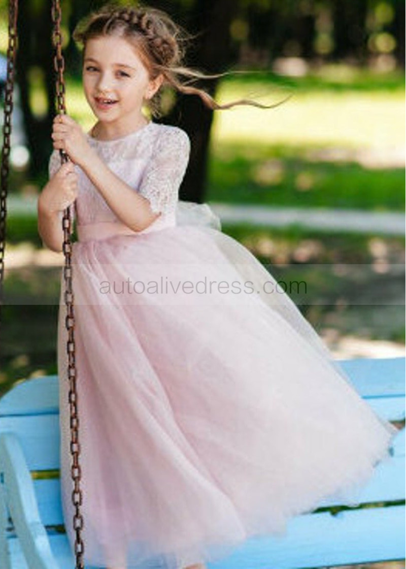 Elbow Sleeve Blush Pink Lace Tulle Flower Girl Dress