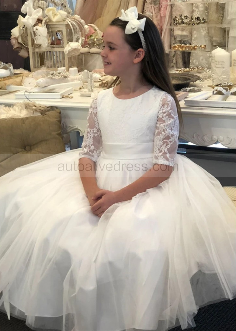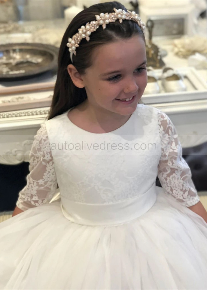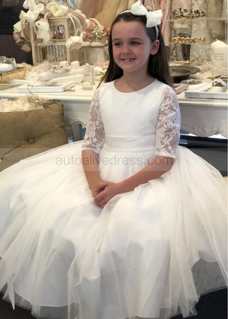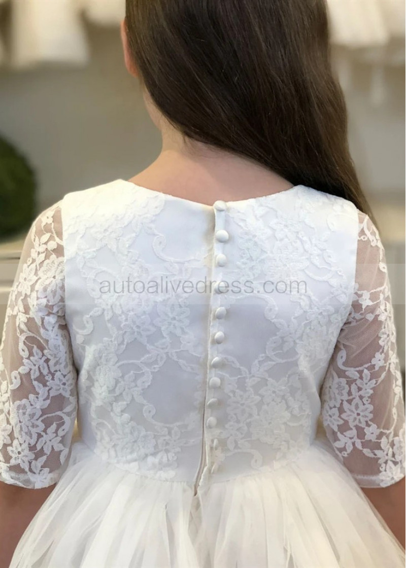 Elbow Sleeve Ivory Lace Tulle Flower Girl Dress