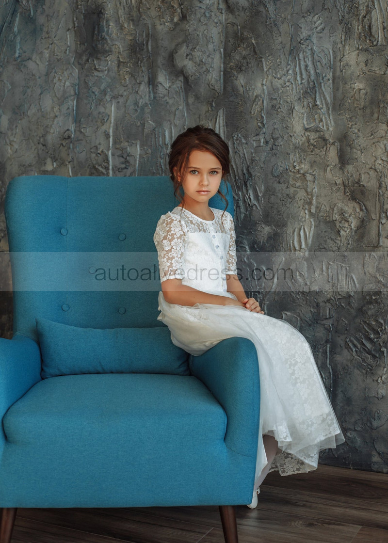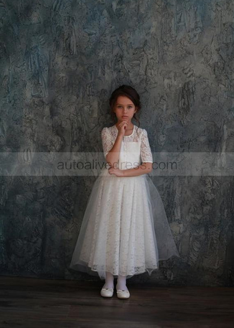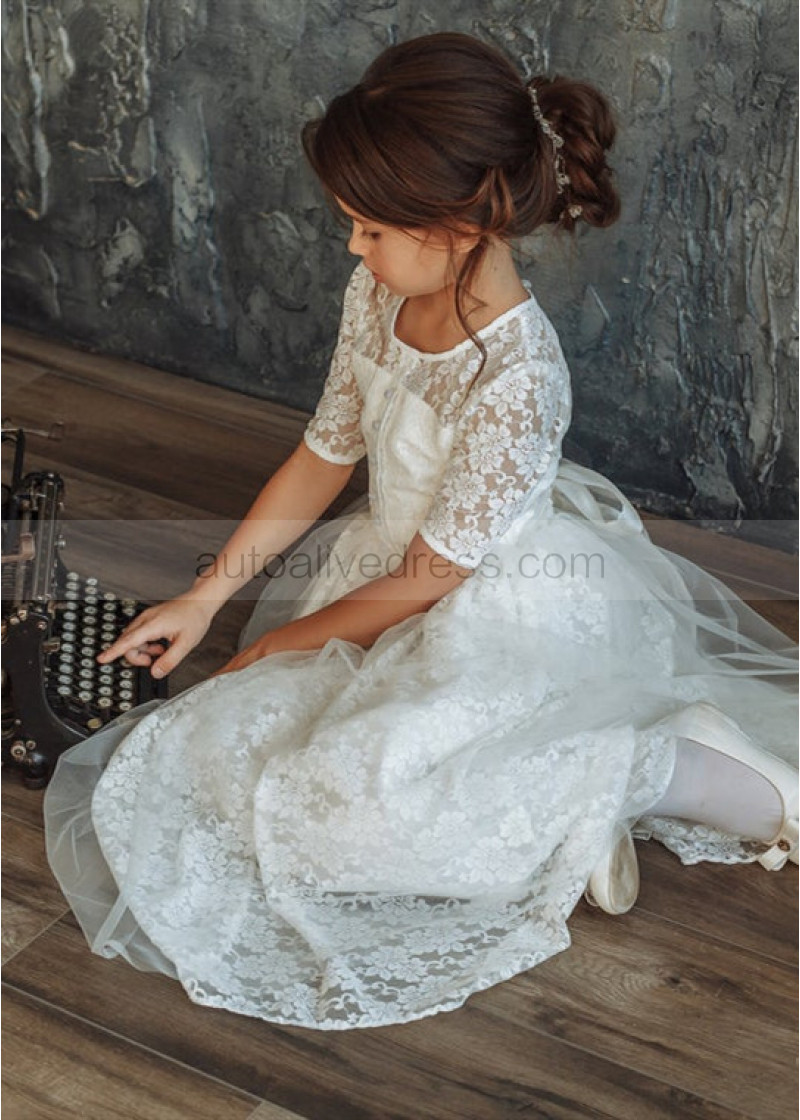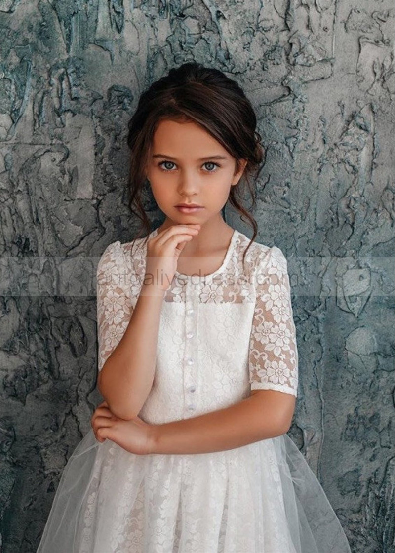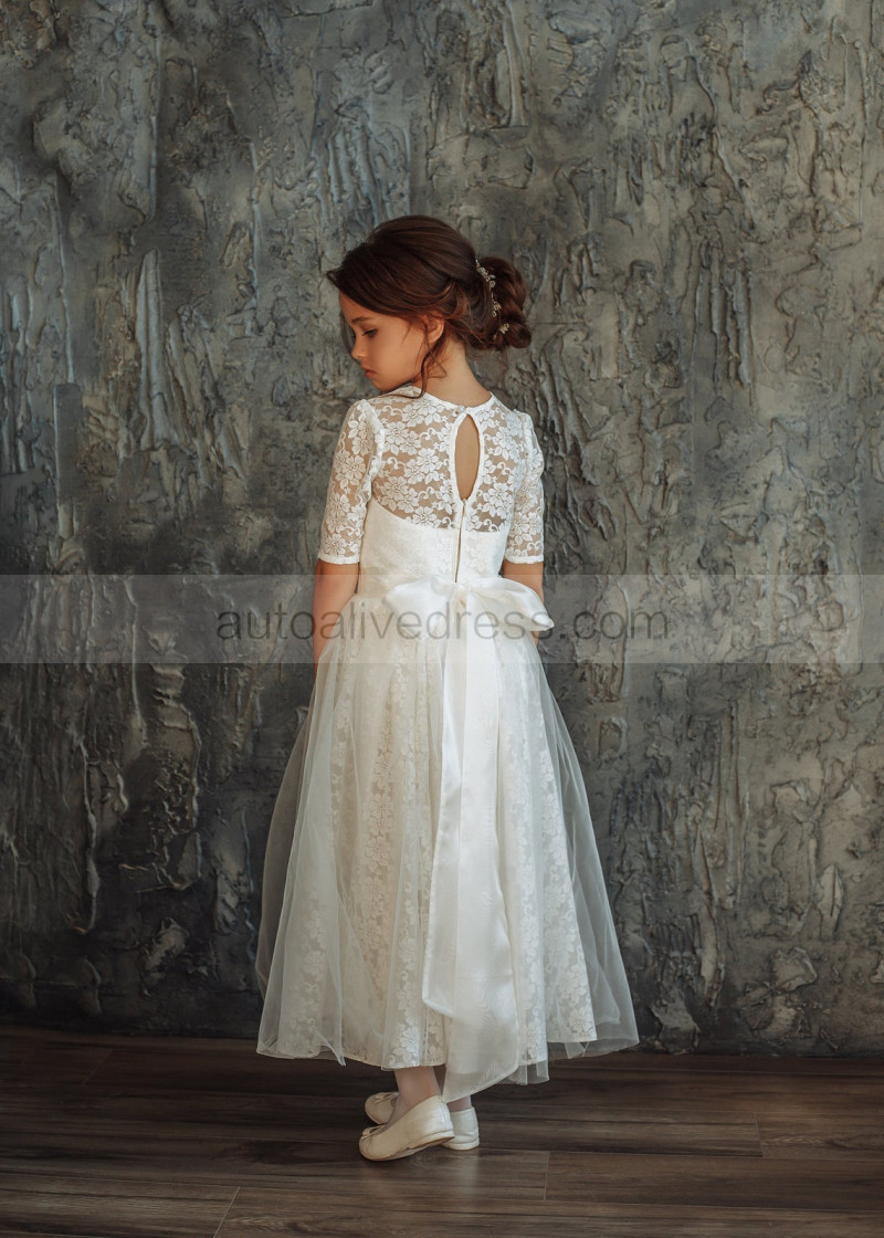 Elbow Sleeve Ivory Lace Tulle Keyhole Back Flower Girl Dress