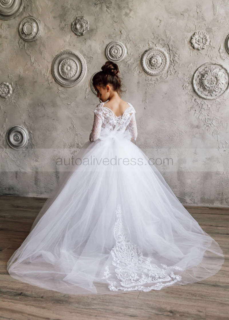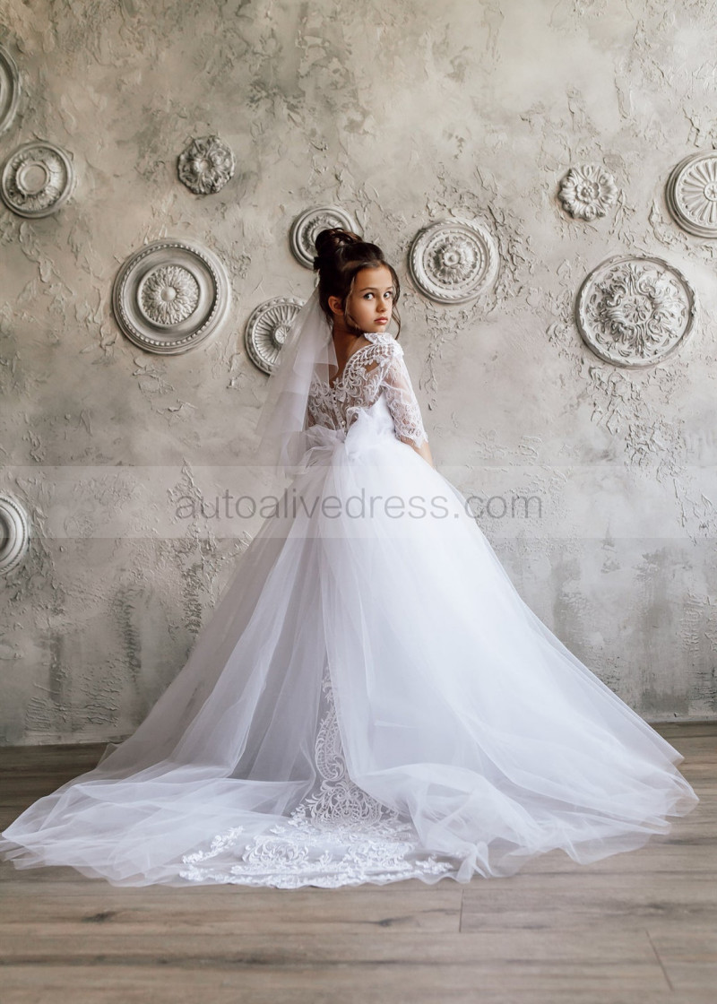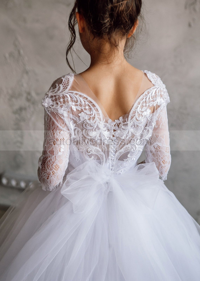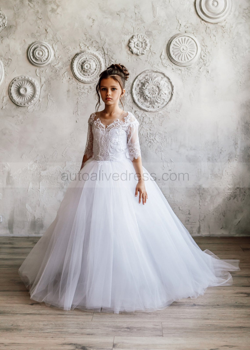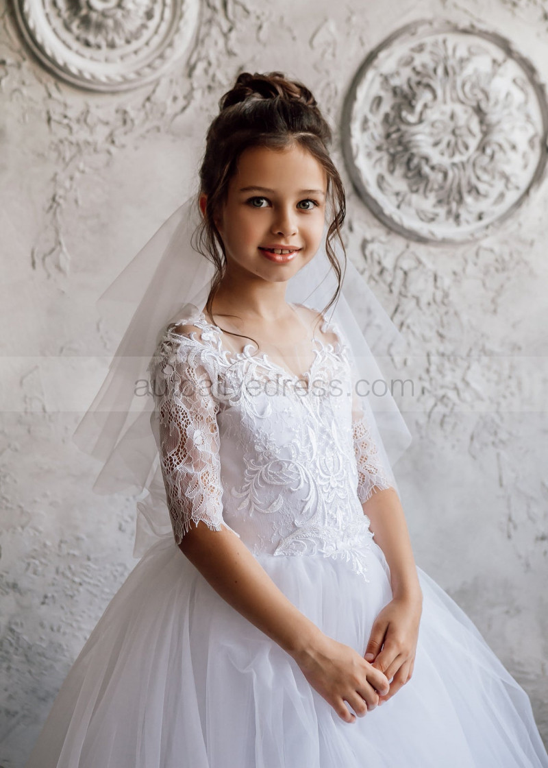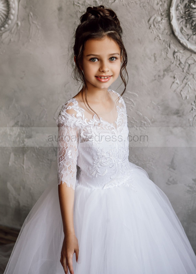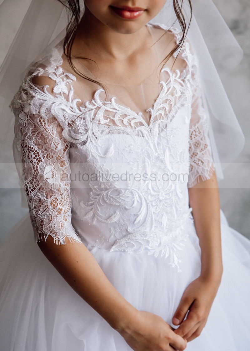 Elbow Sleeve White Lace Tulle Flower Girl Dress