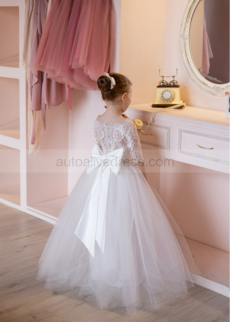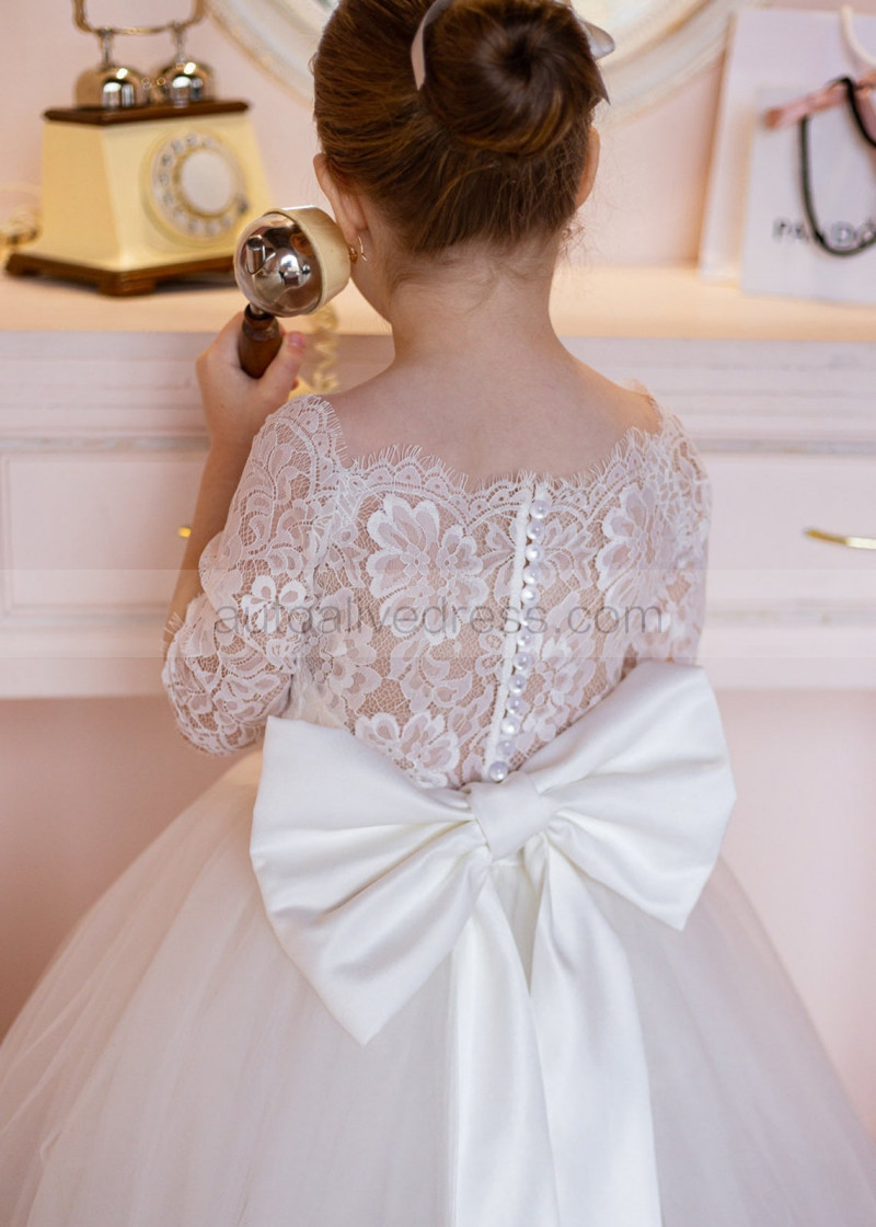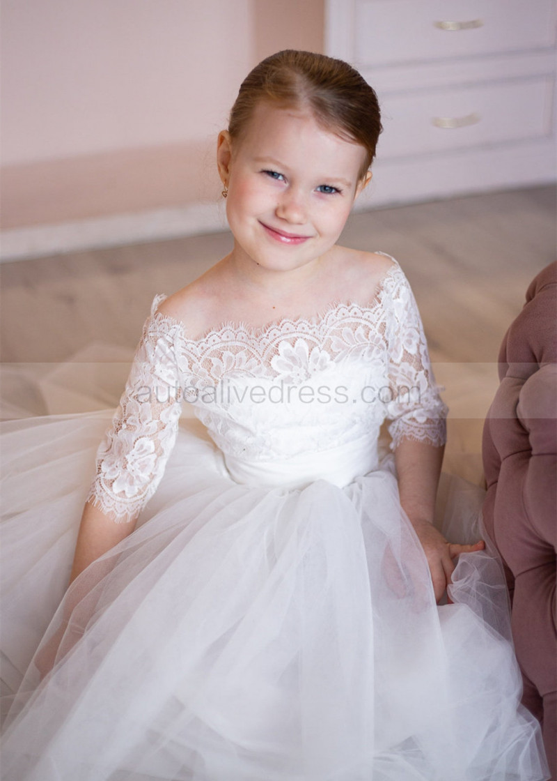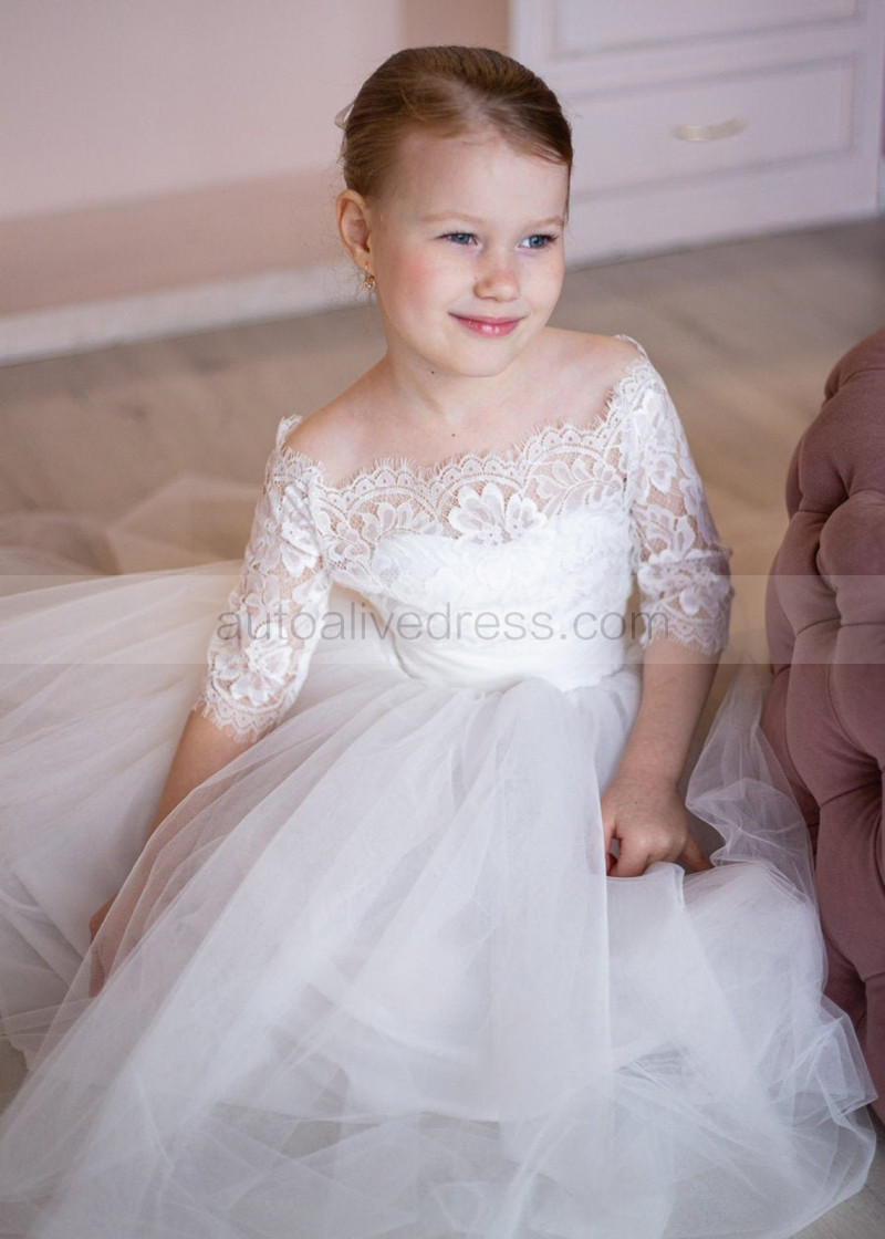 Elbow Sleeves Ivory Lace Tulle Flower Girl Dress