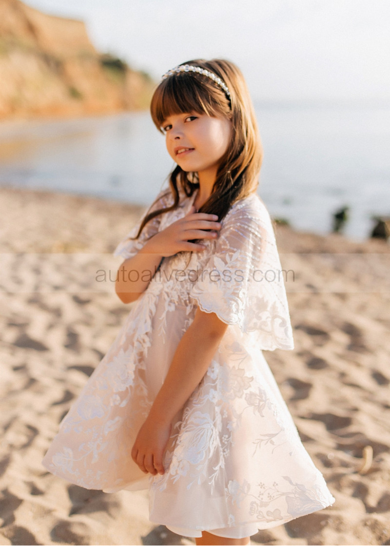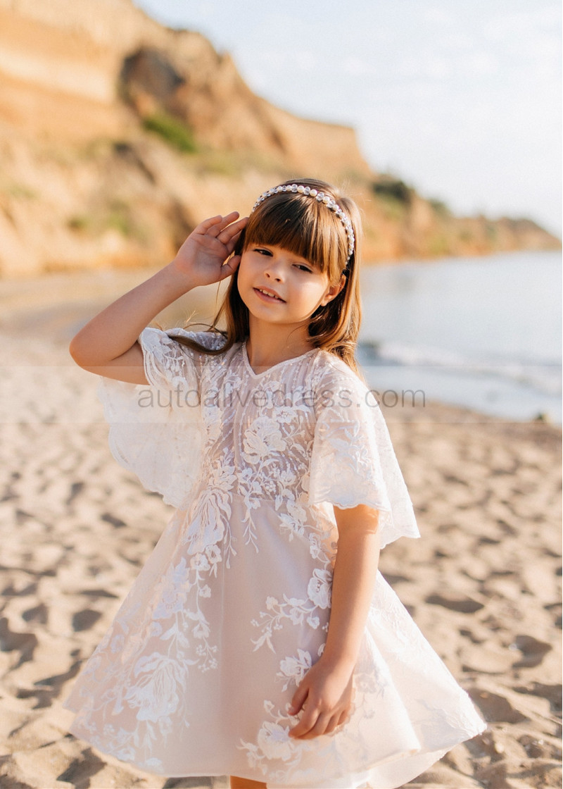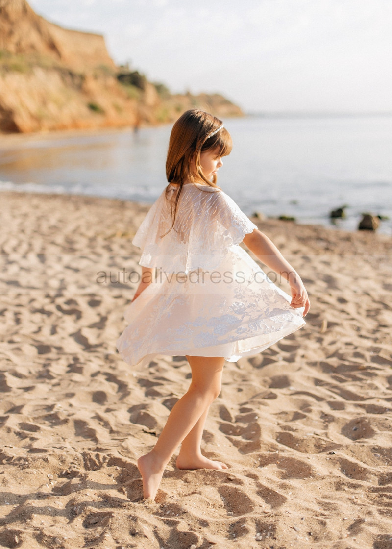 Elbow Sleeves Ivory Lace Tulle Shimmering Flower Girl Dress