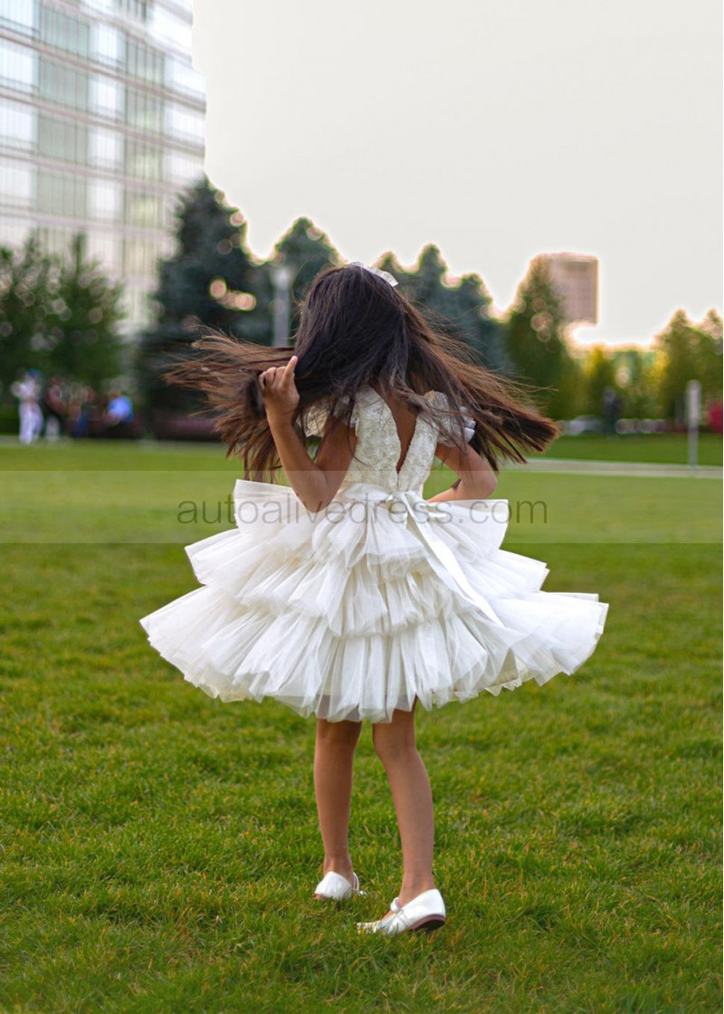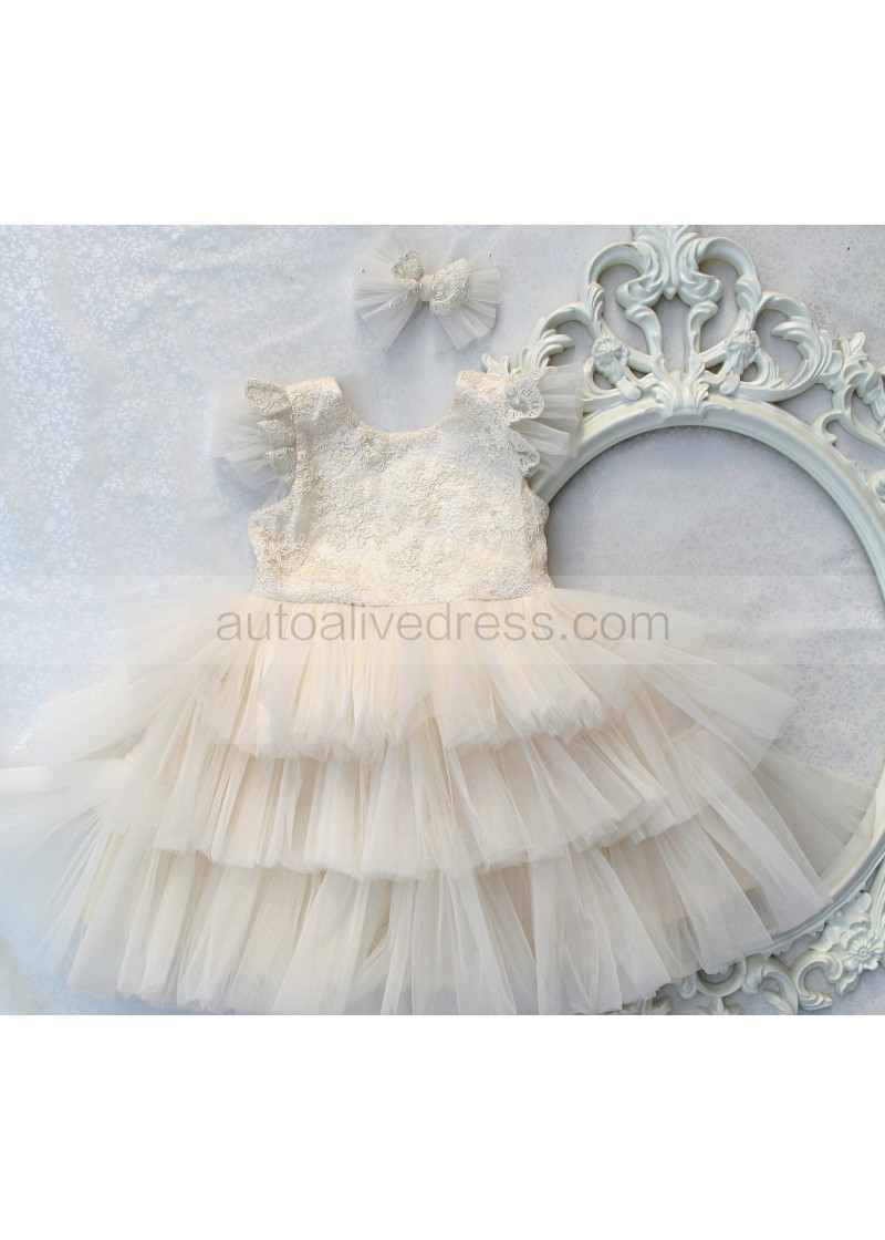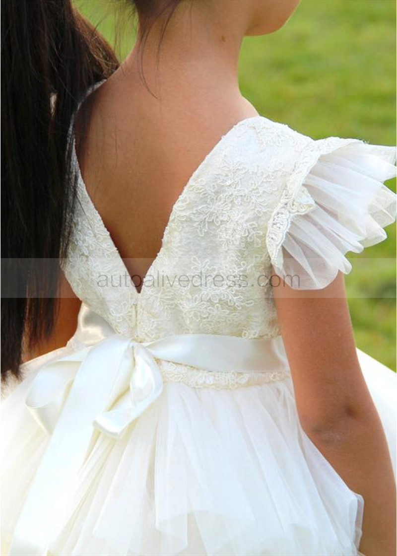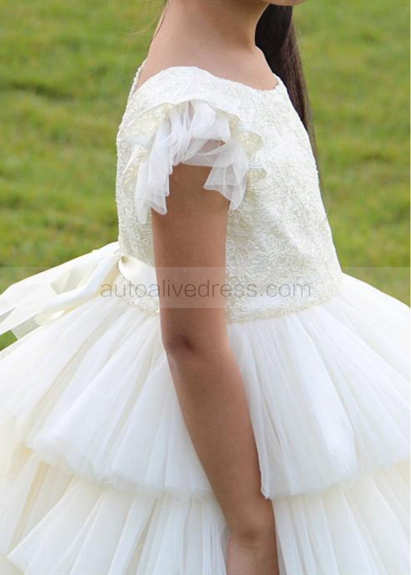 Feifei Sleeves Ivory Lace Tulle Tiered Flower Girl Dress