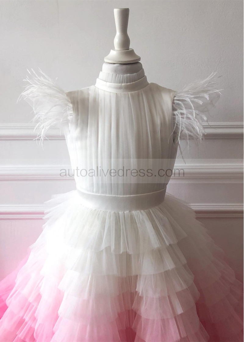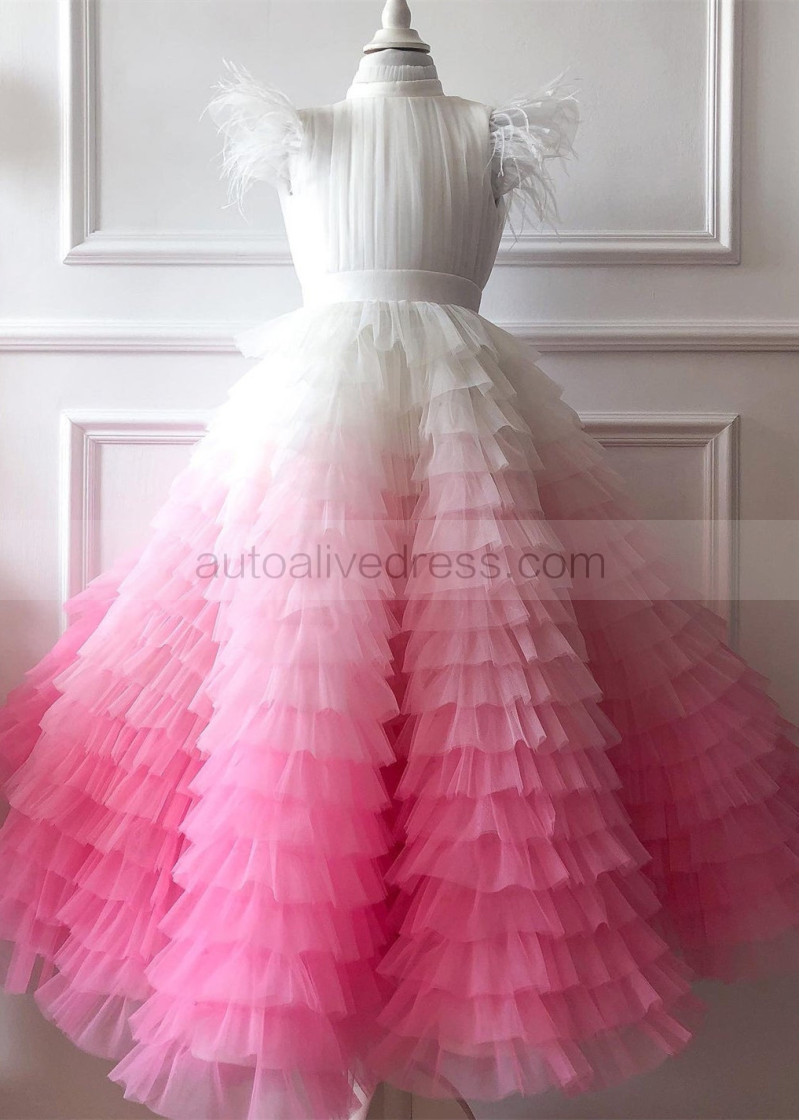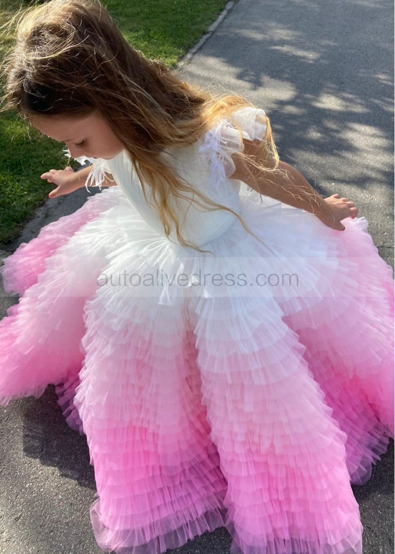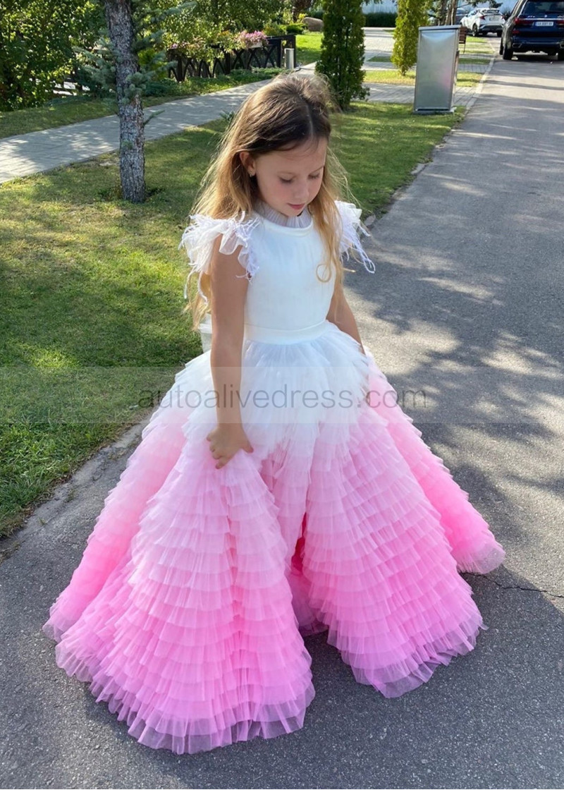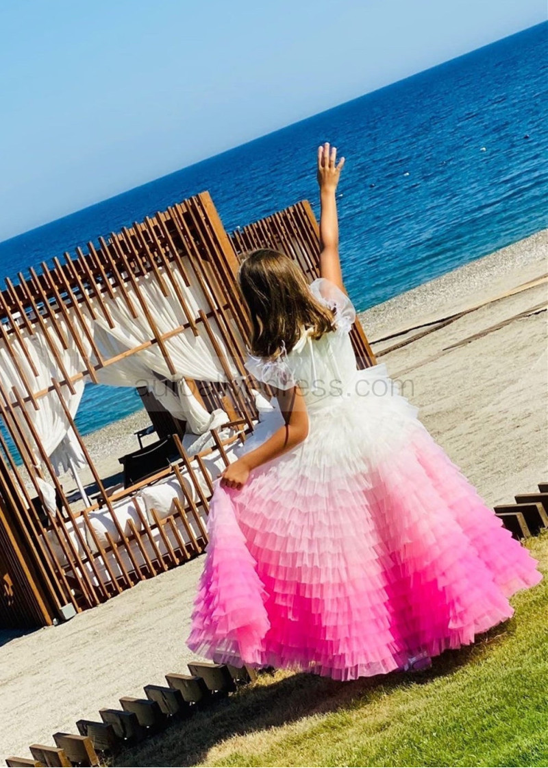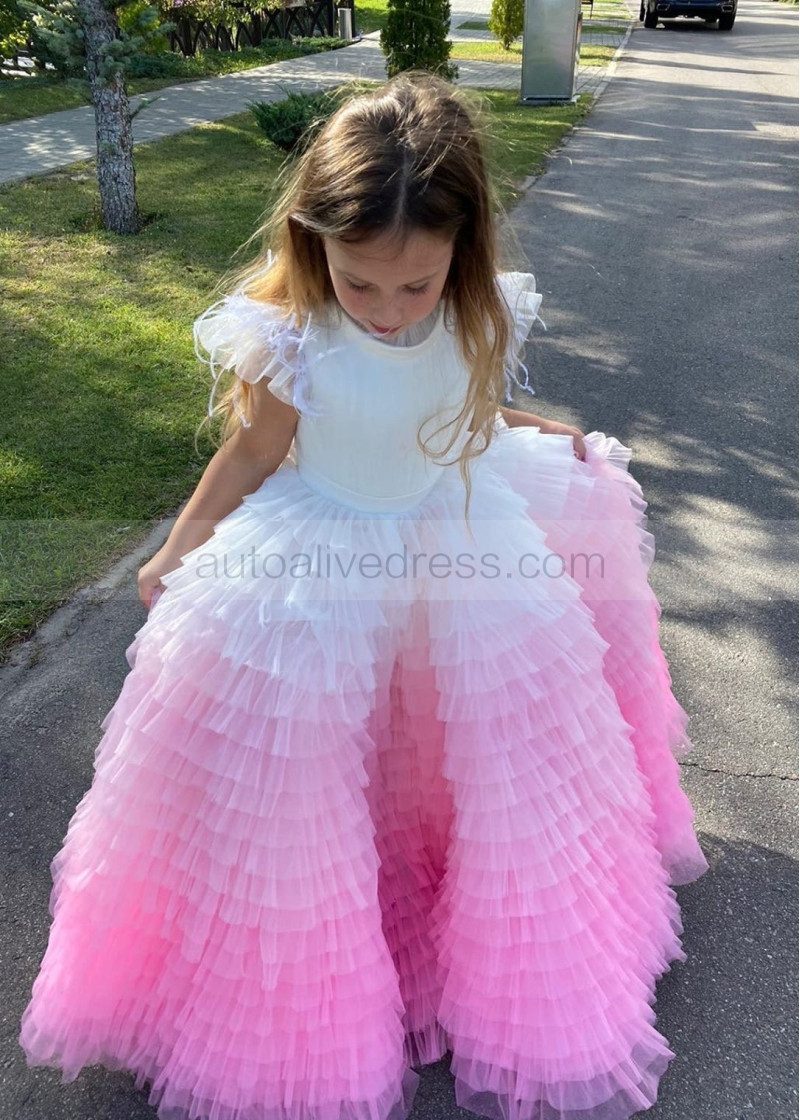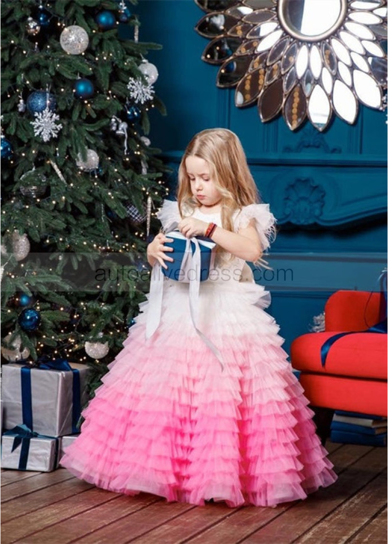 Flutter Sleeves Tulle Gradient Ruffles Flower Girl Dress