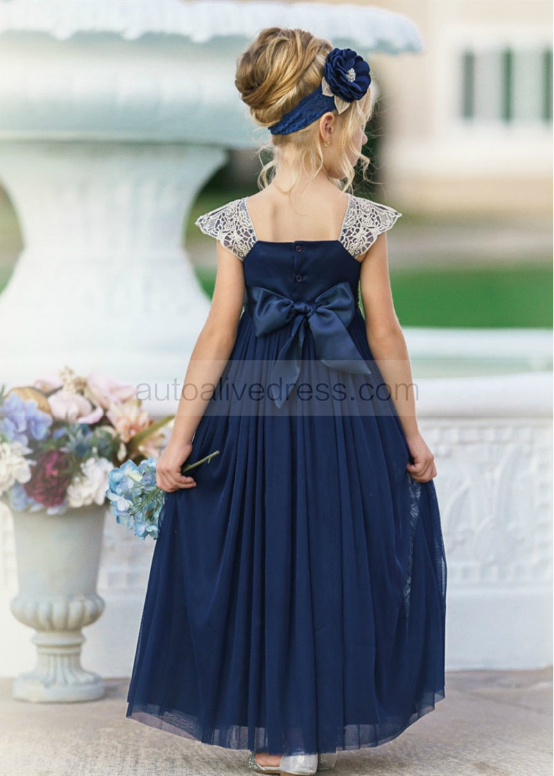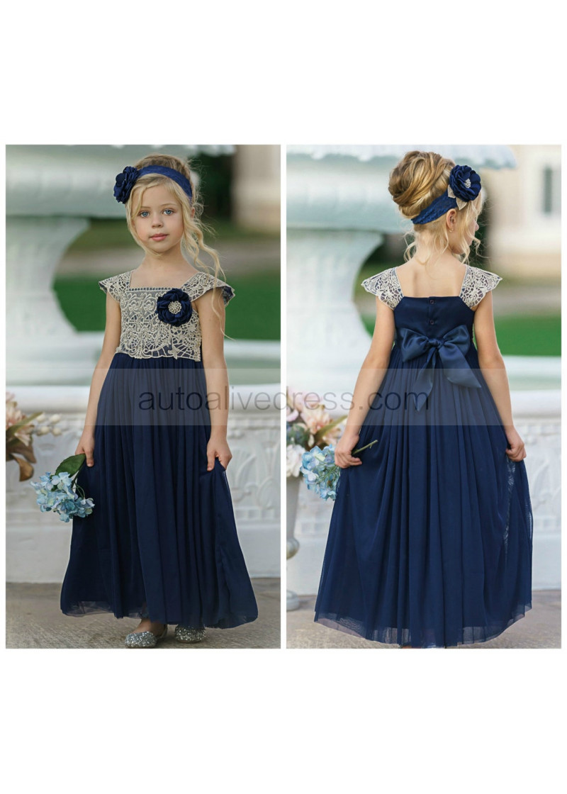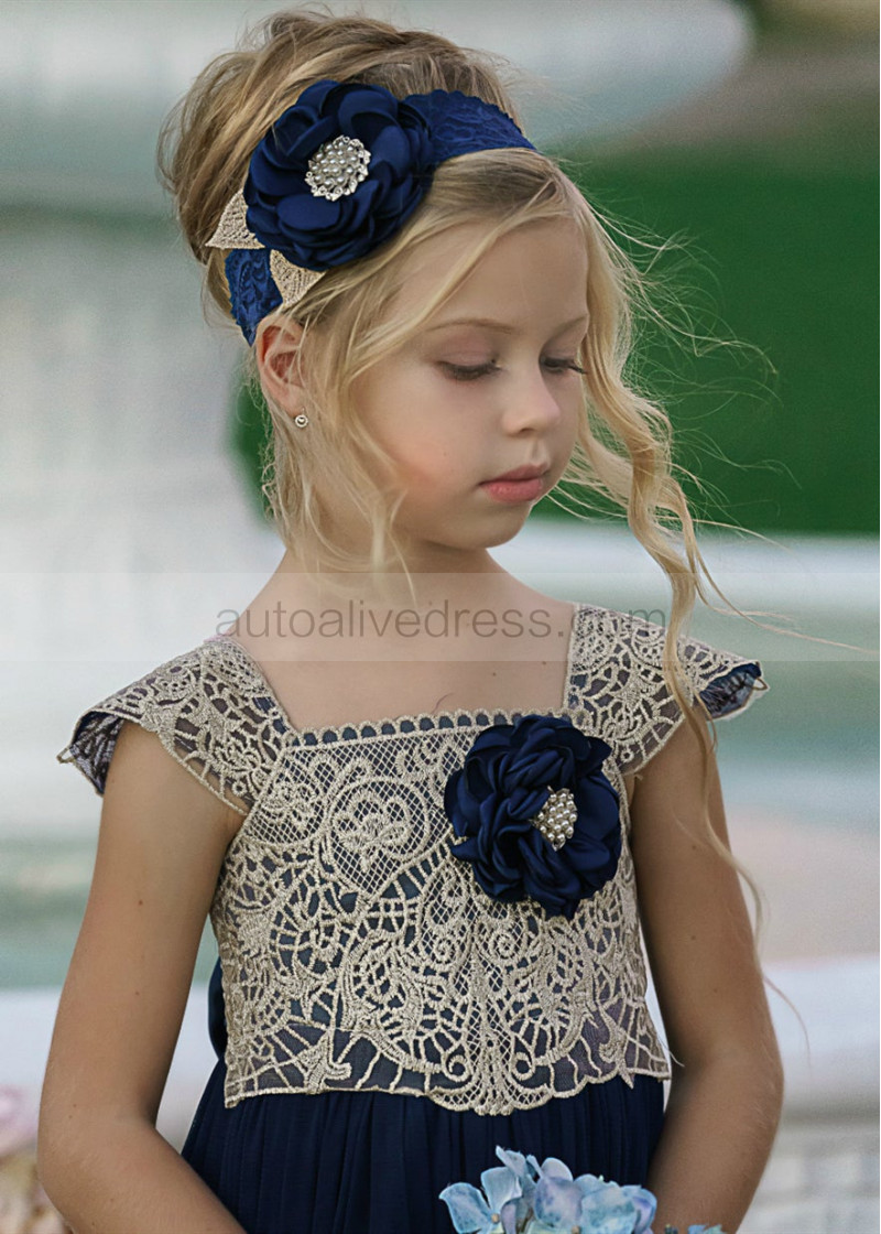 Gold Lace Navy Blue Tulle Ankle Length Flower Girl Dress