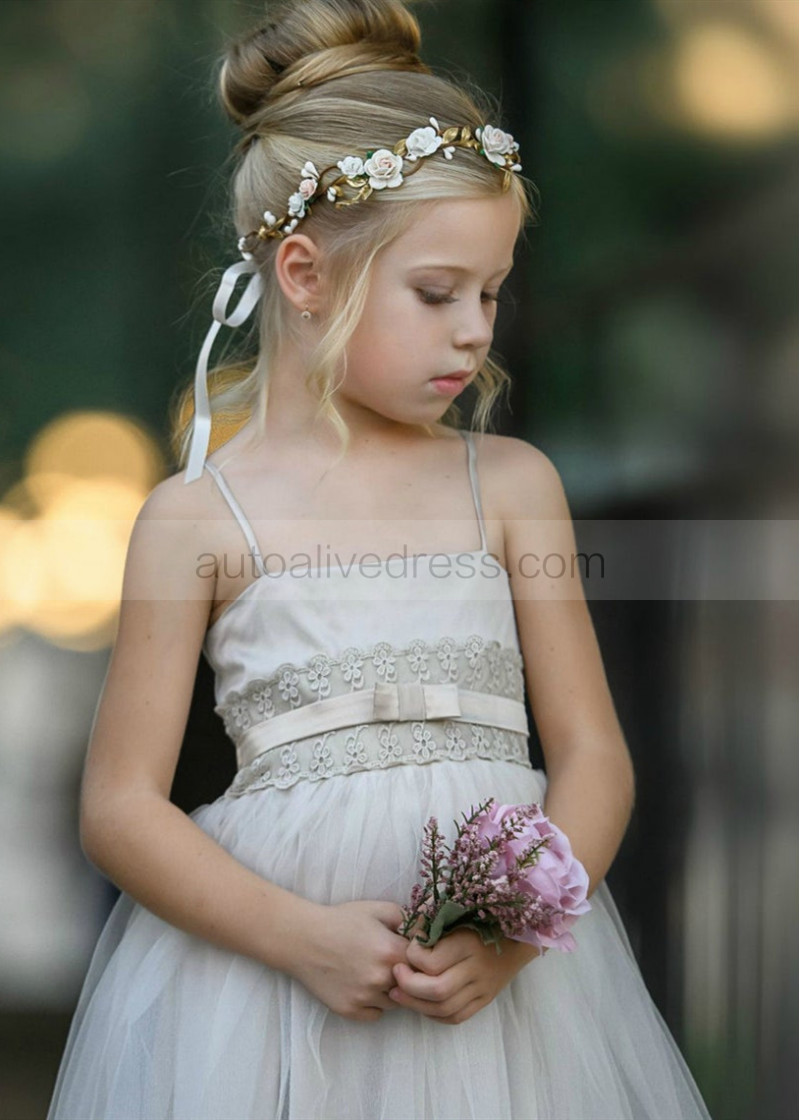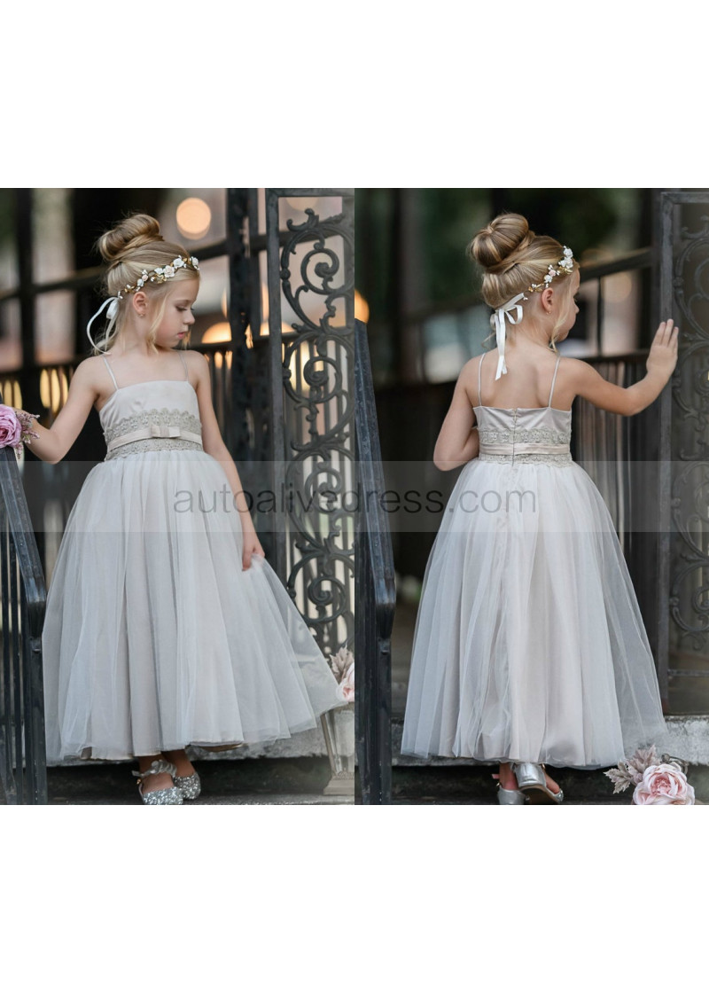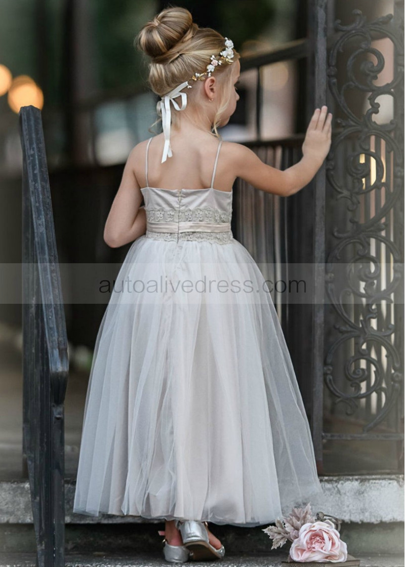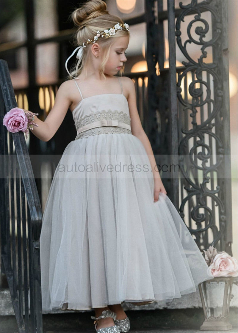 Gray Lace Tulle Ankle Length Country Flower Girl Dress