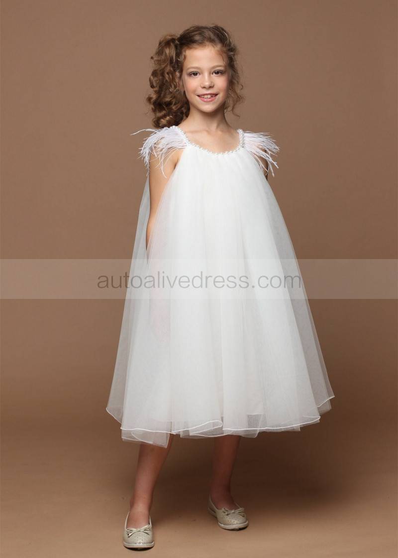 Ivory Adorable Tulle Feather Flower Girl Dress