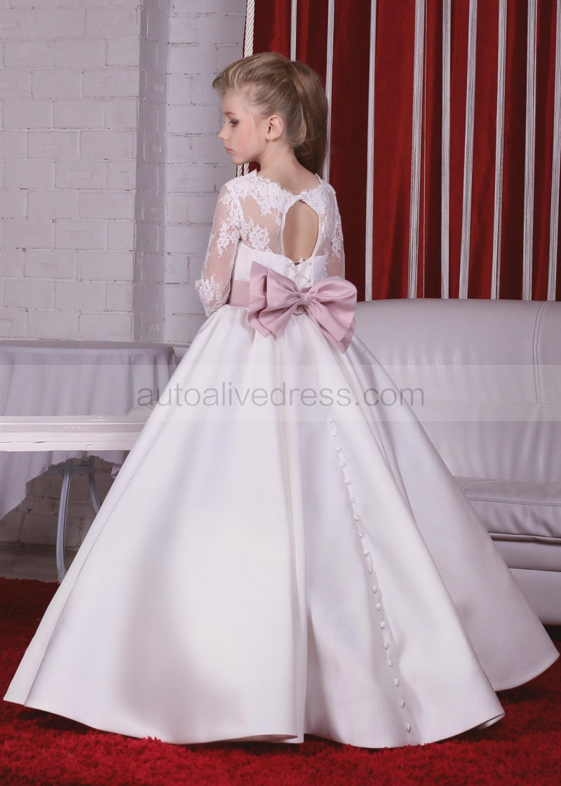 Ivory Lace Satin Flower Girl Dress With Decorated Buttons