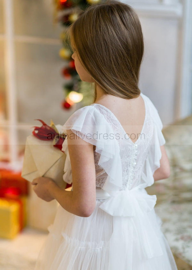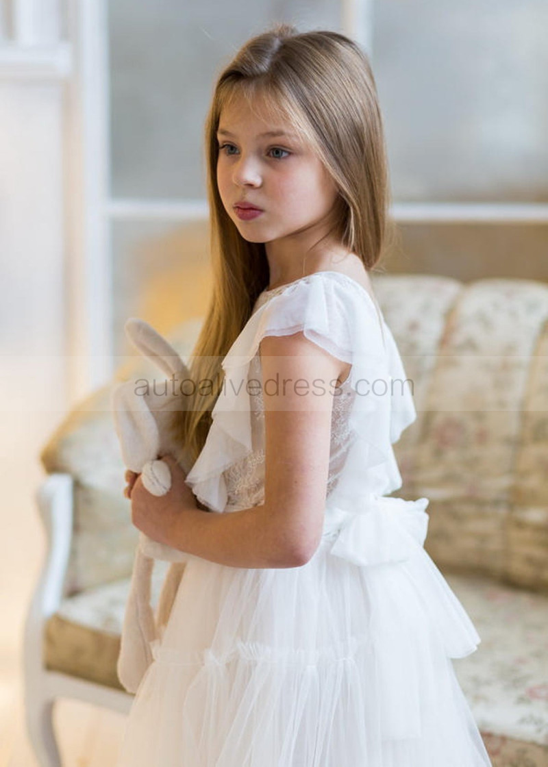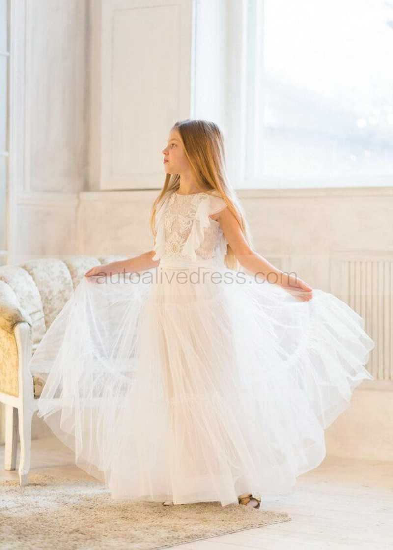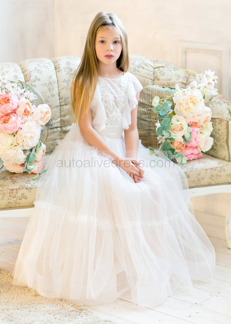 Ivory Lace Tulle Floor Length V Back Boho Flower Girl Dress