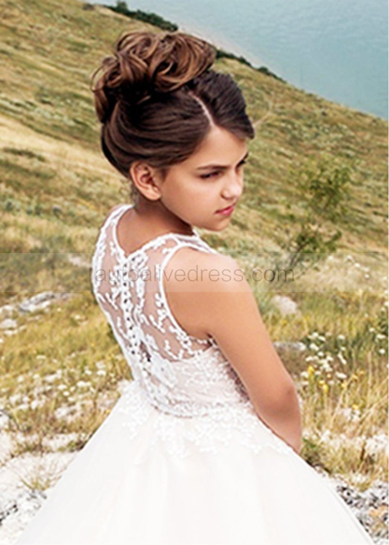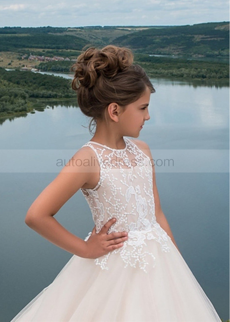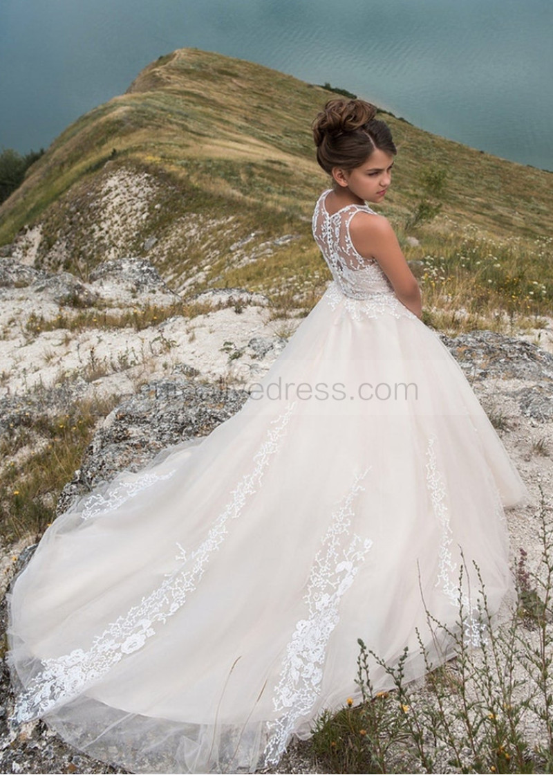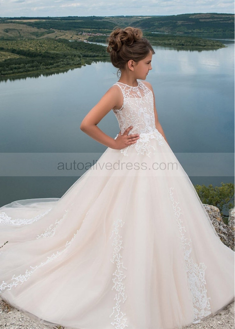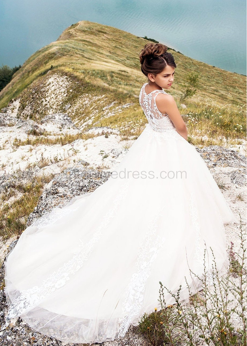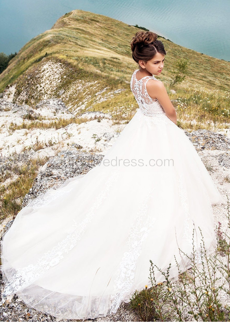 Ivory Lace Tulle Flower Girl Dress With Long Train