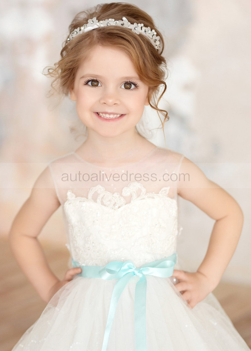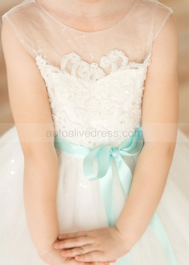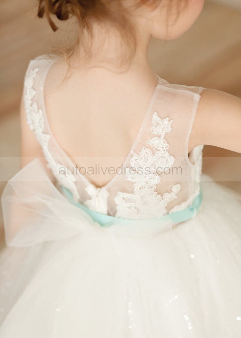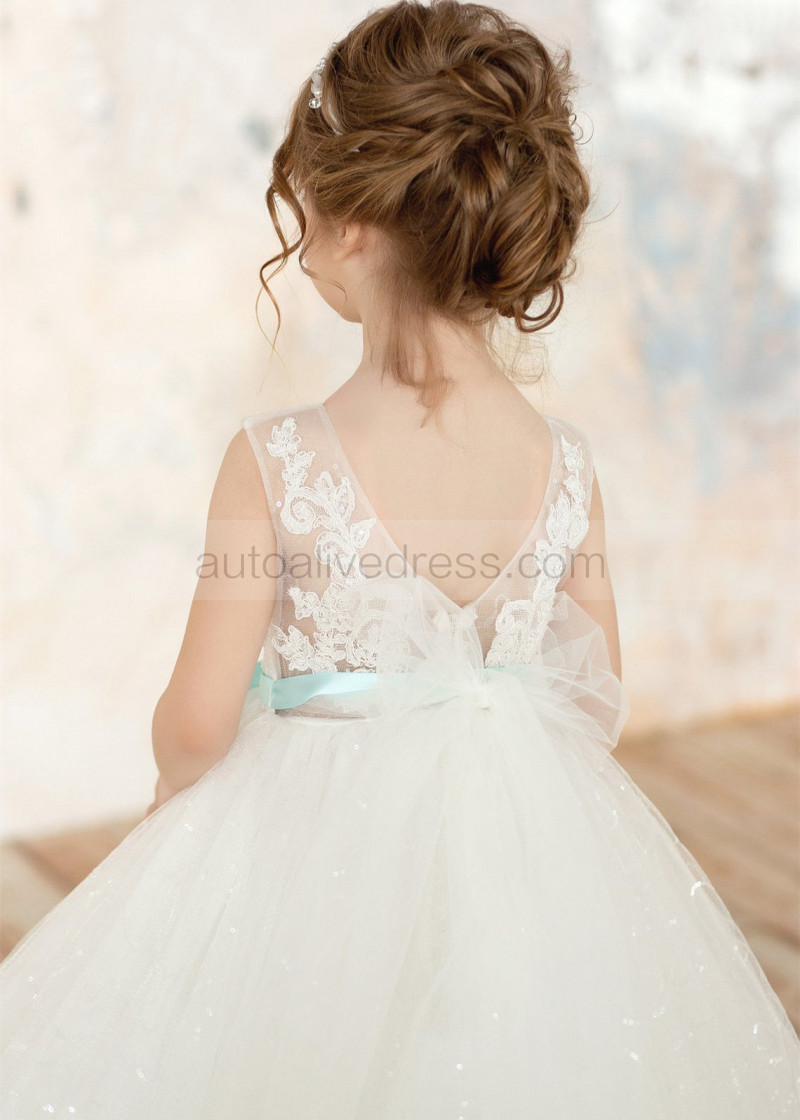 Ivory Lace Tulle Flower Girl Dress With Mint Sash