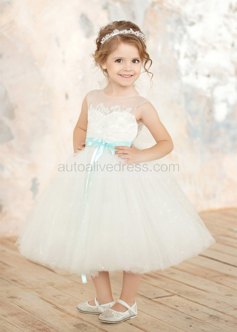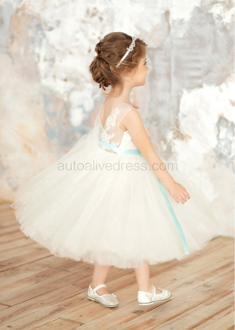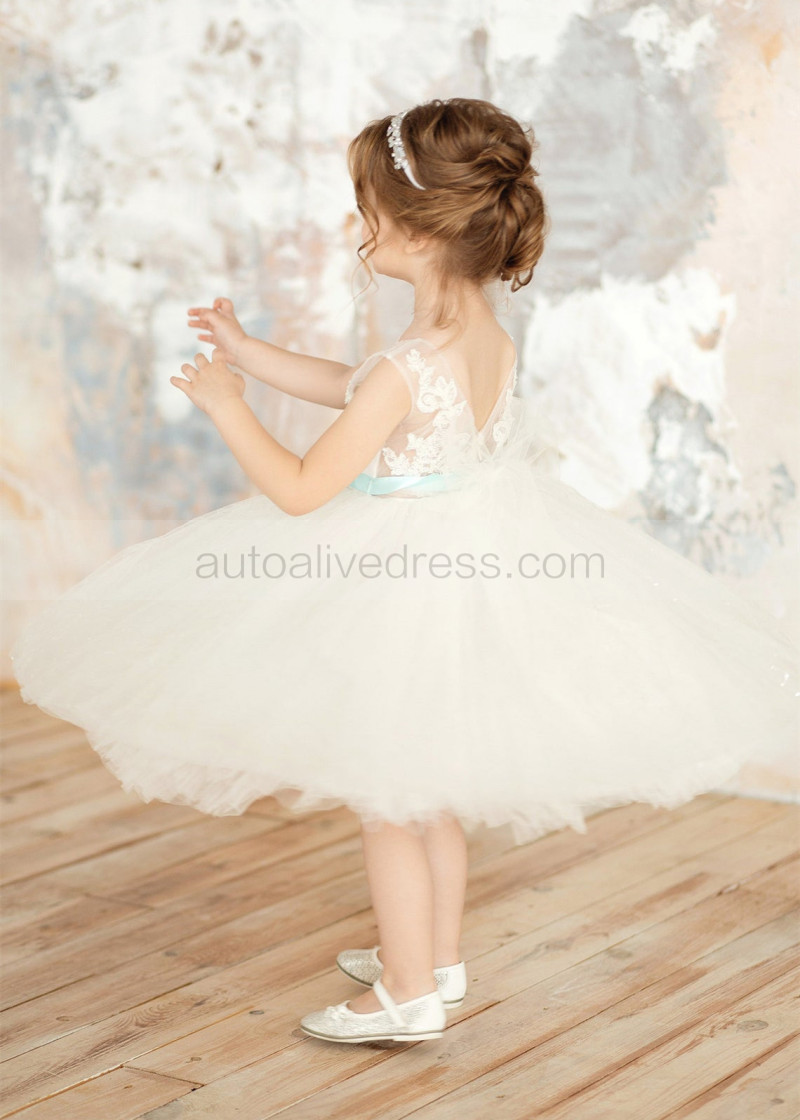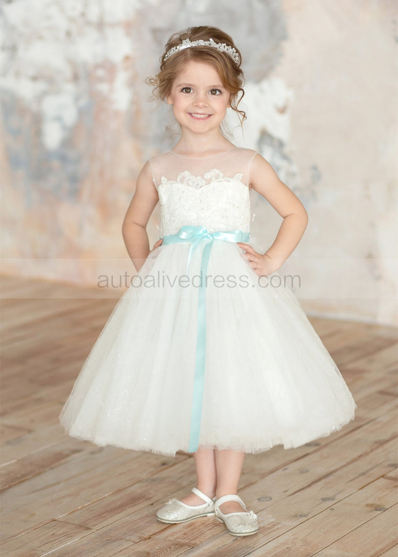 Ivory Lace Tulle Flower Girl Dress With Mint Sash