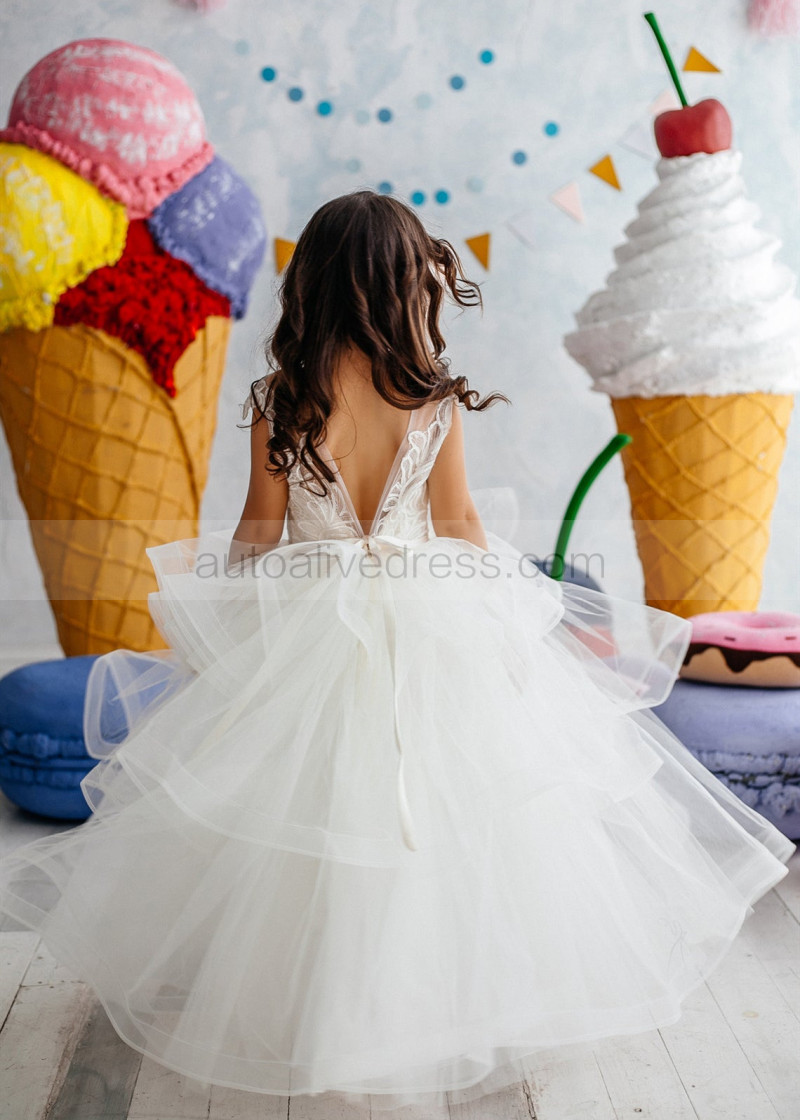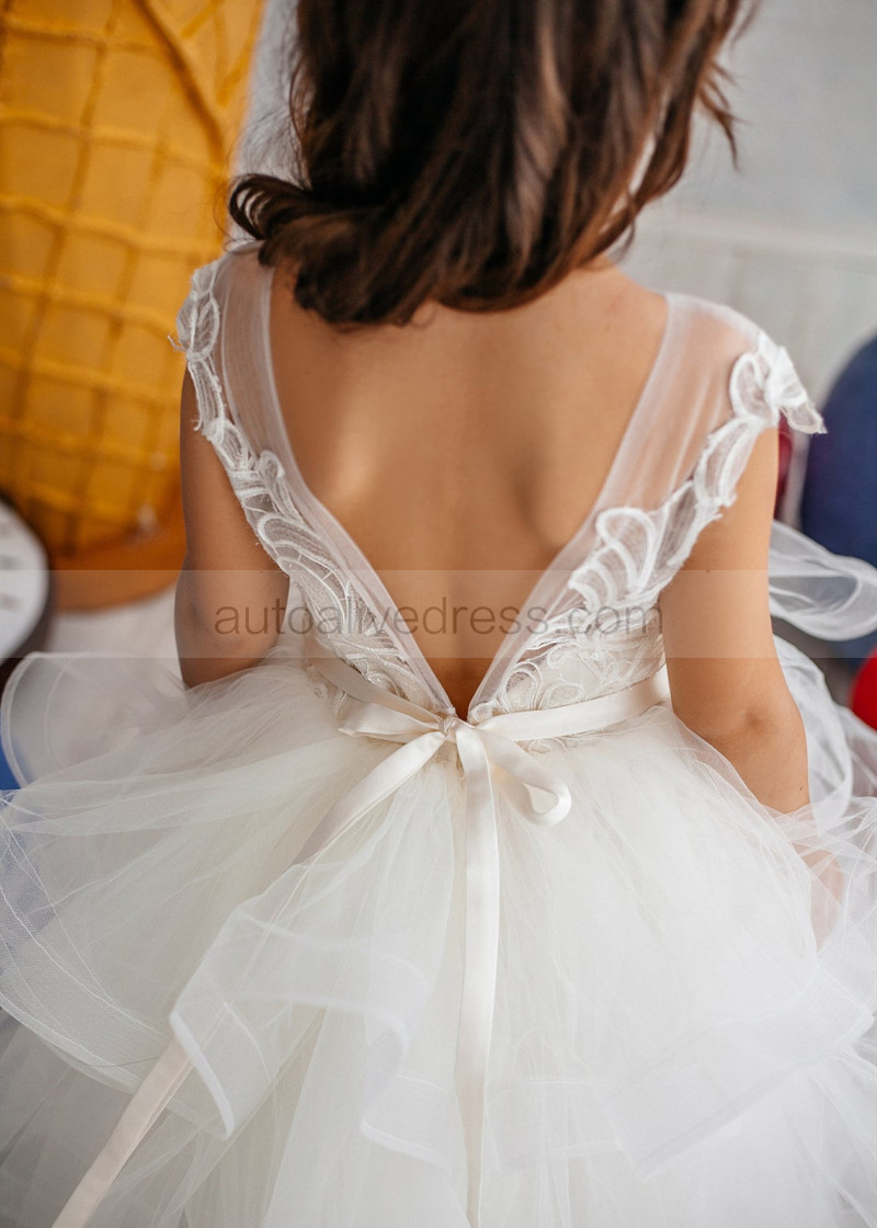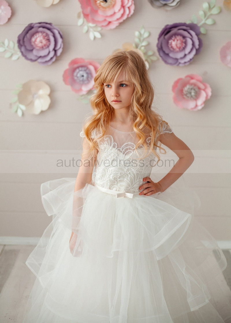 Ivory Lace Tulle Tiered Cupcake Long Flower Girl Dress