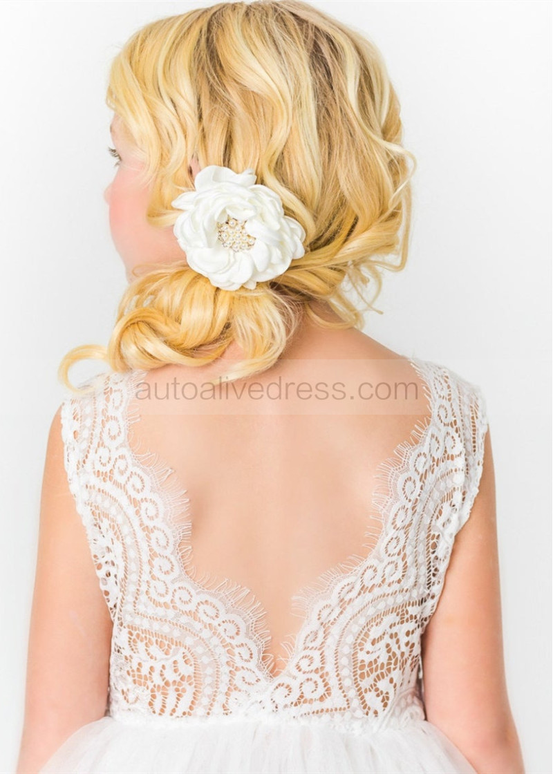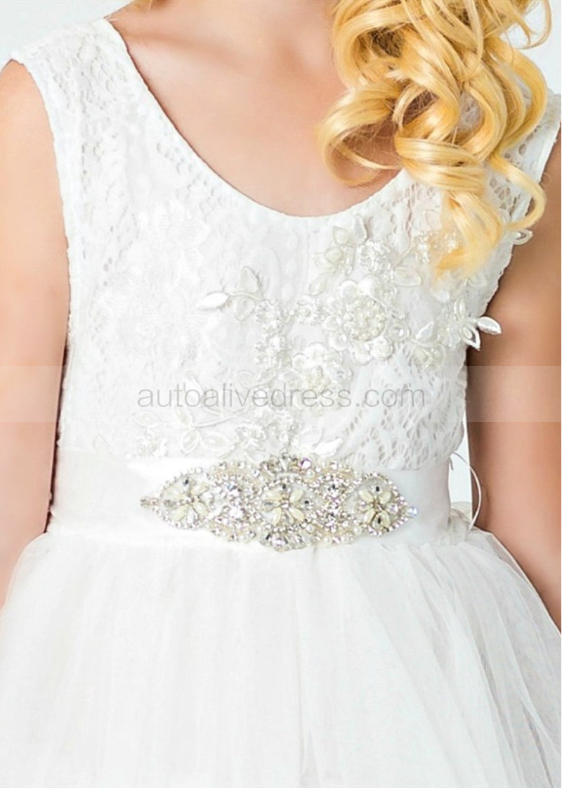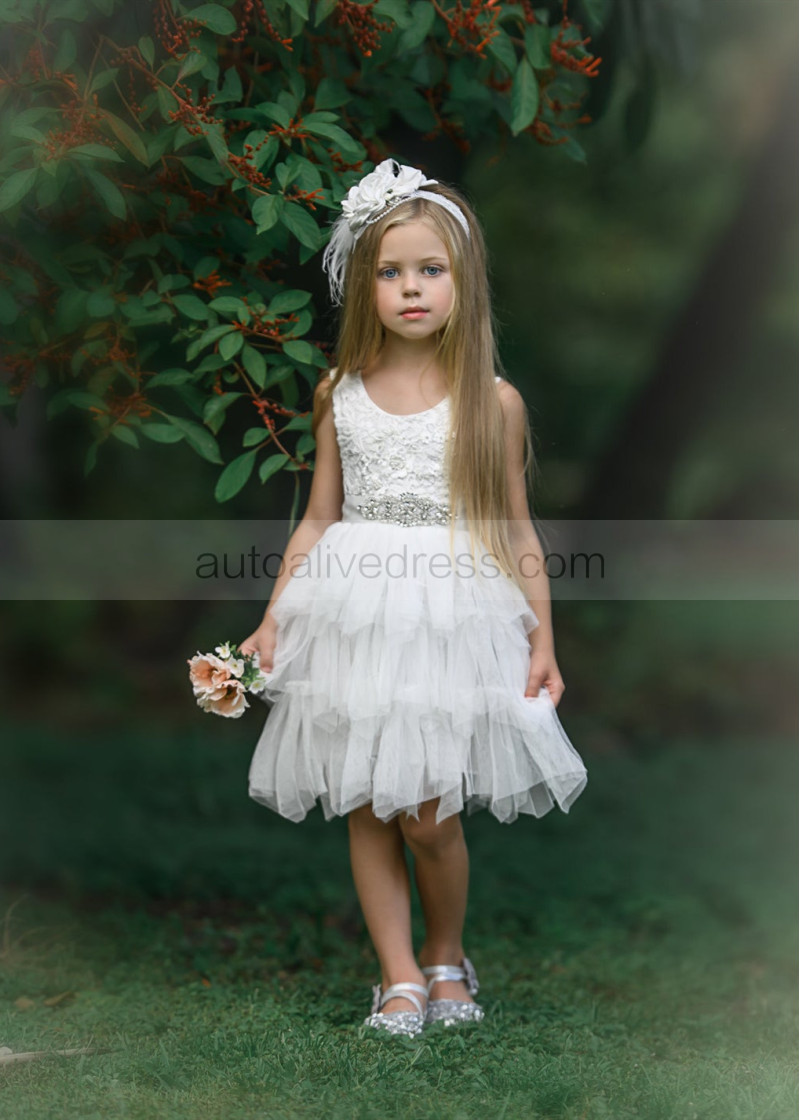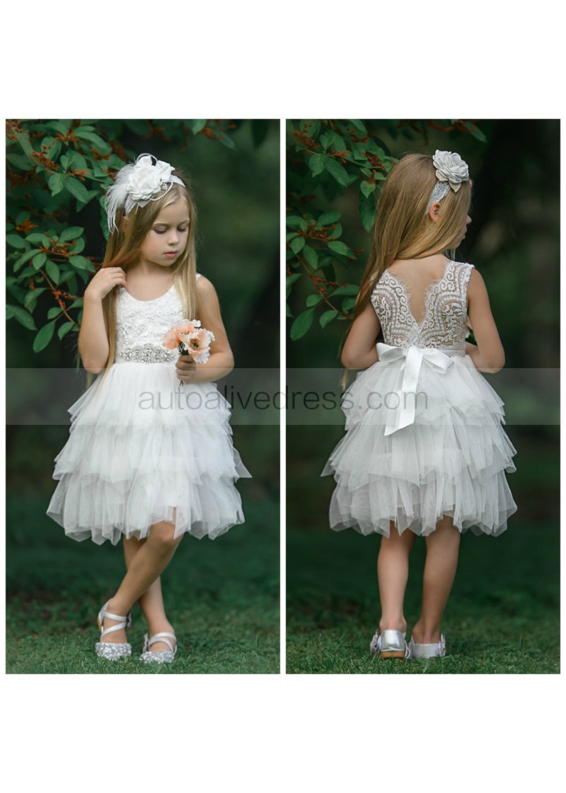 Ivory Lace Tulle Tiered Tutu Flower Girl Dress With Rhinestone Sash