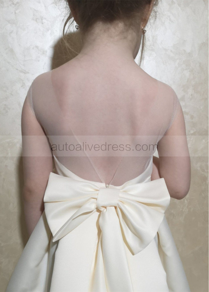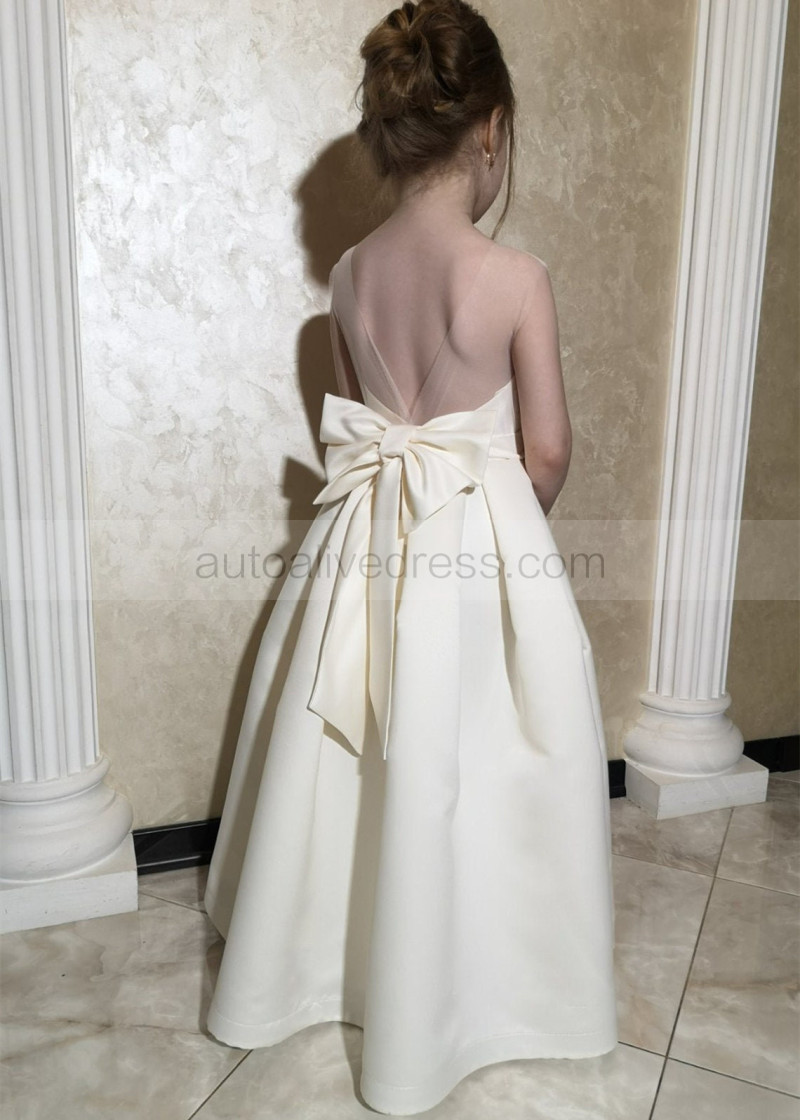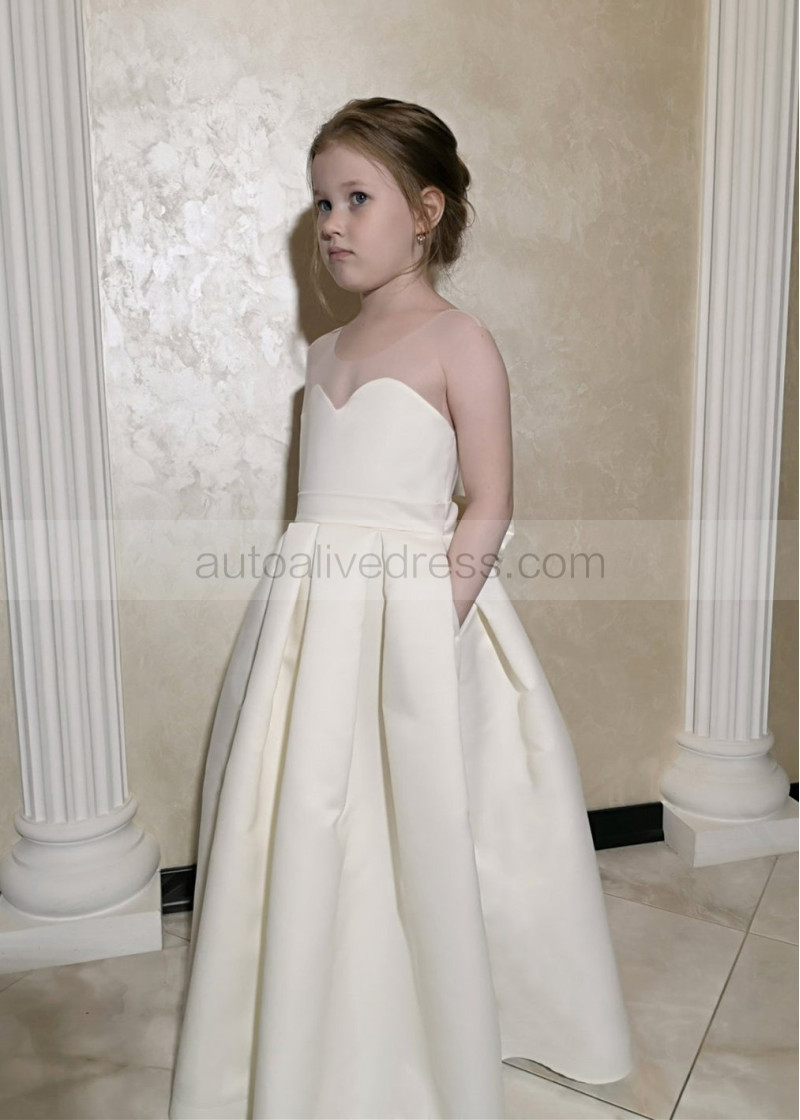 Ivory Satin Box Pleated Simple Flower Girl Dress With Pockets