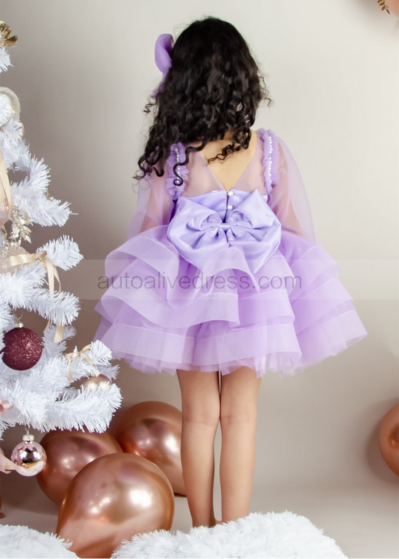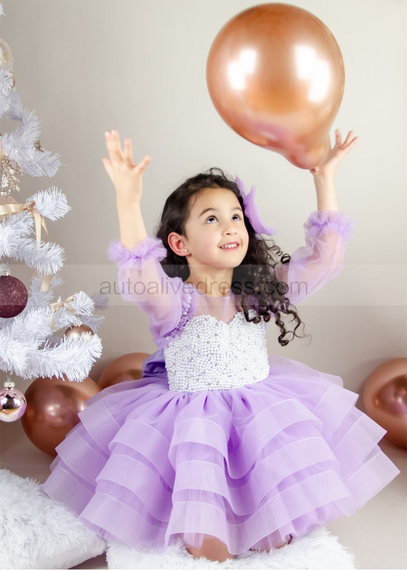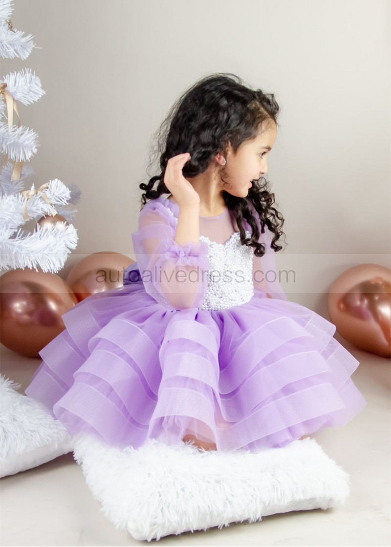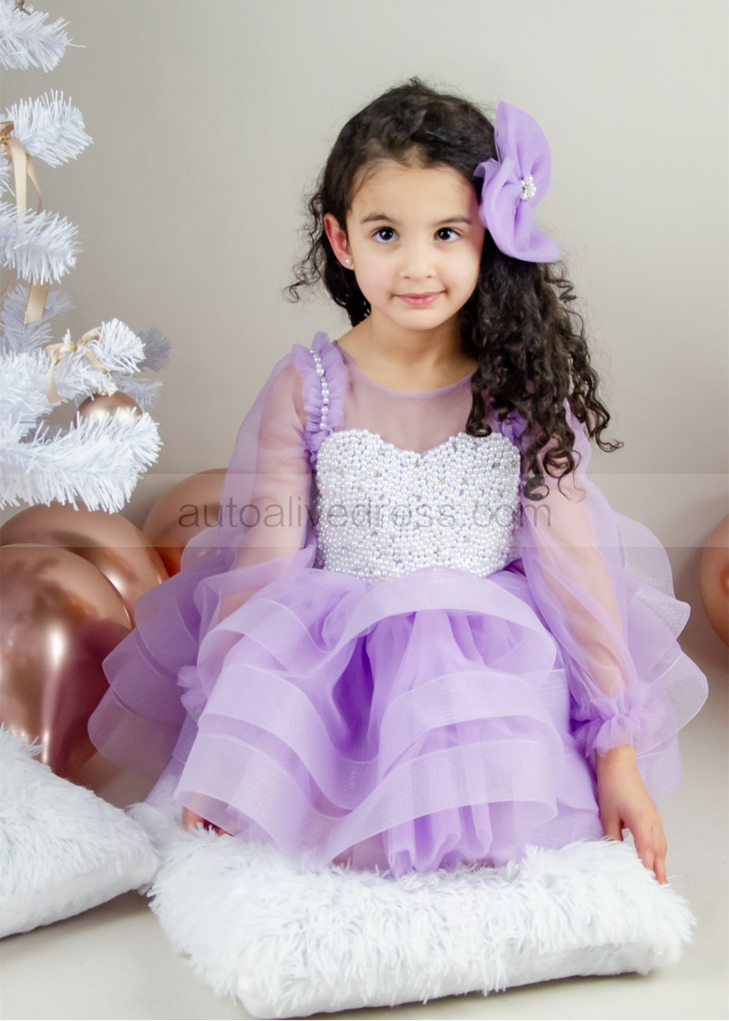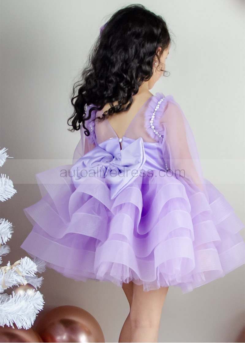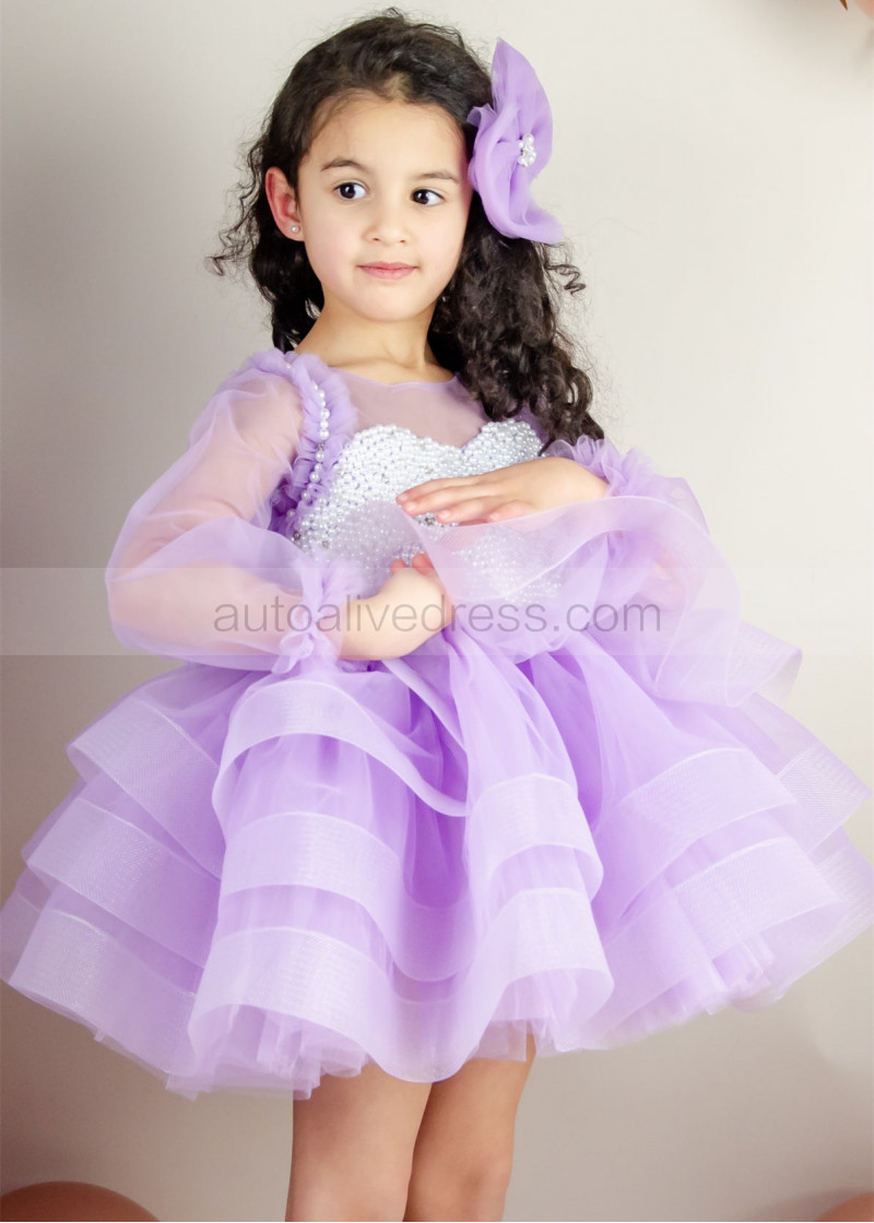 Lilac Tulle Pearls Beaded Short Flower Girl Dress