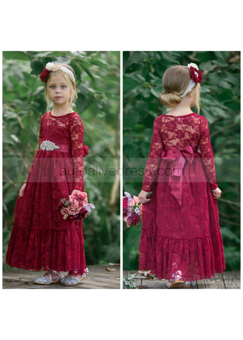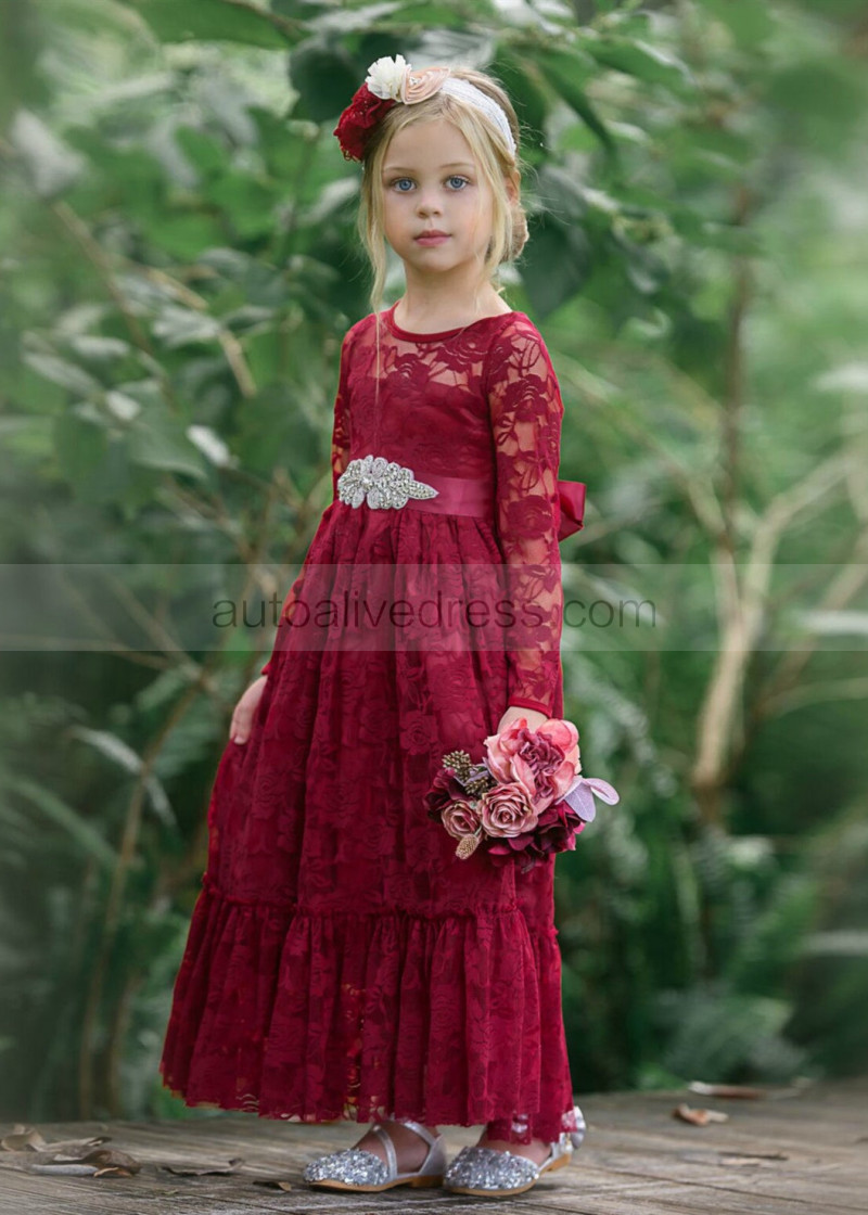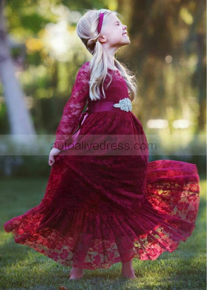Long Sleeve Burgundy Lace Floor Length Flower Girl Dress