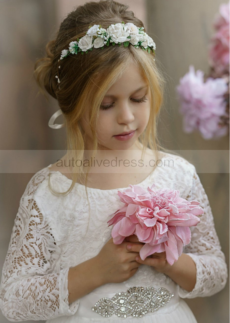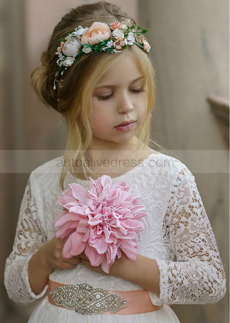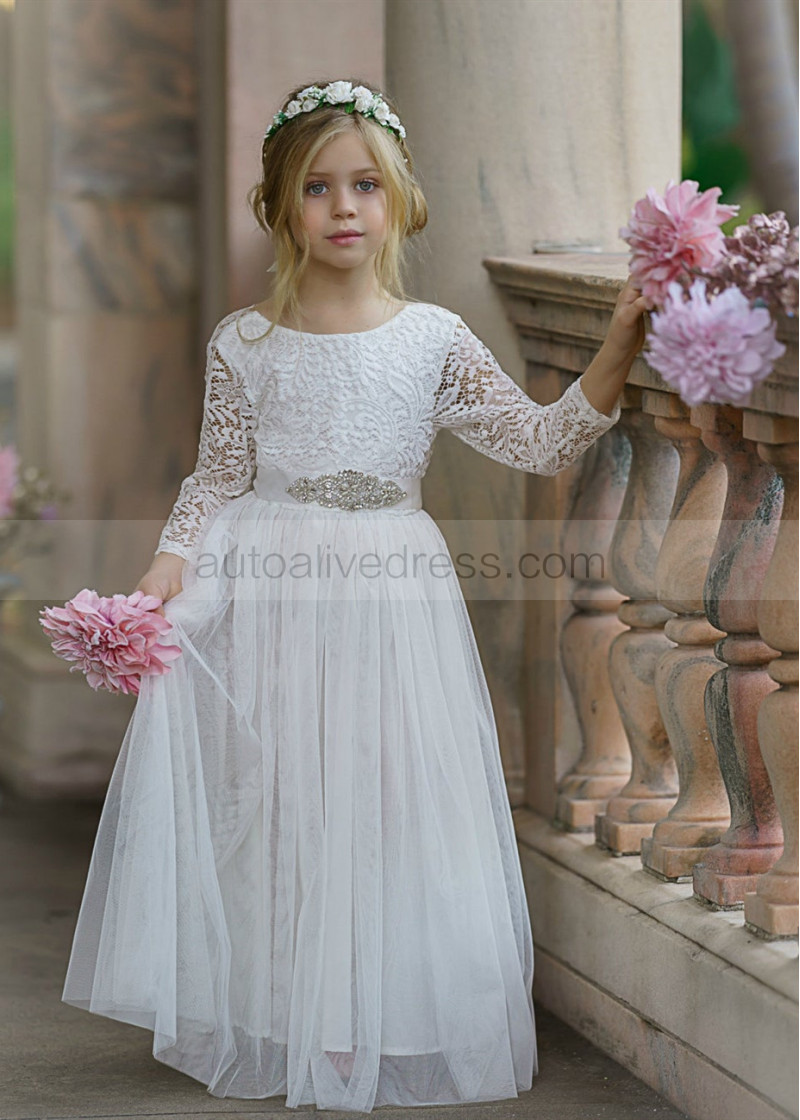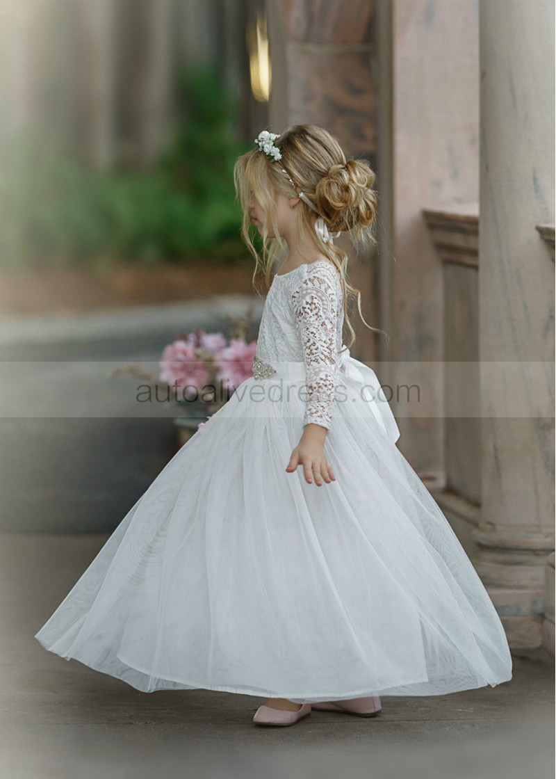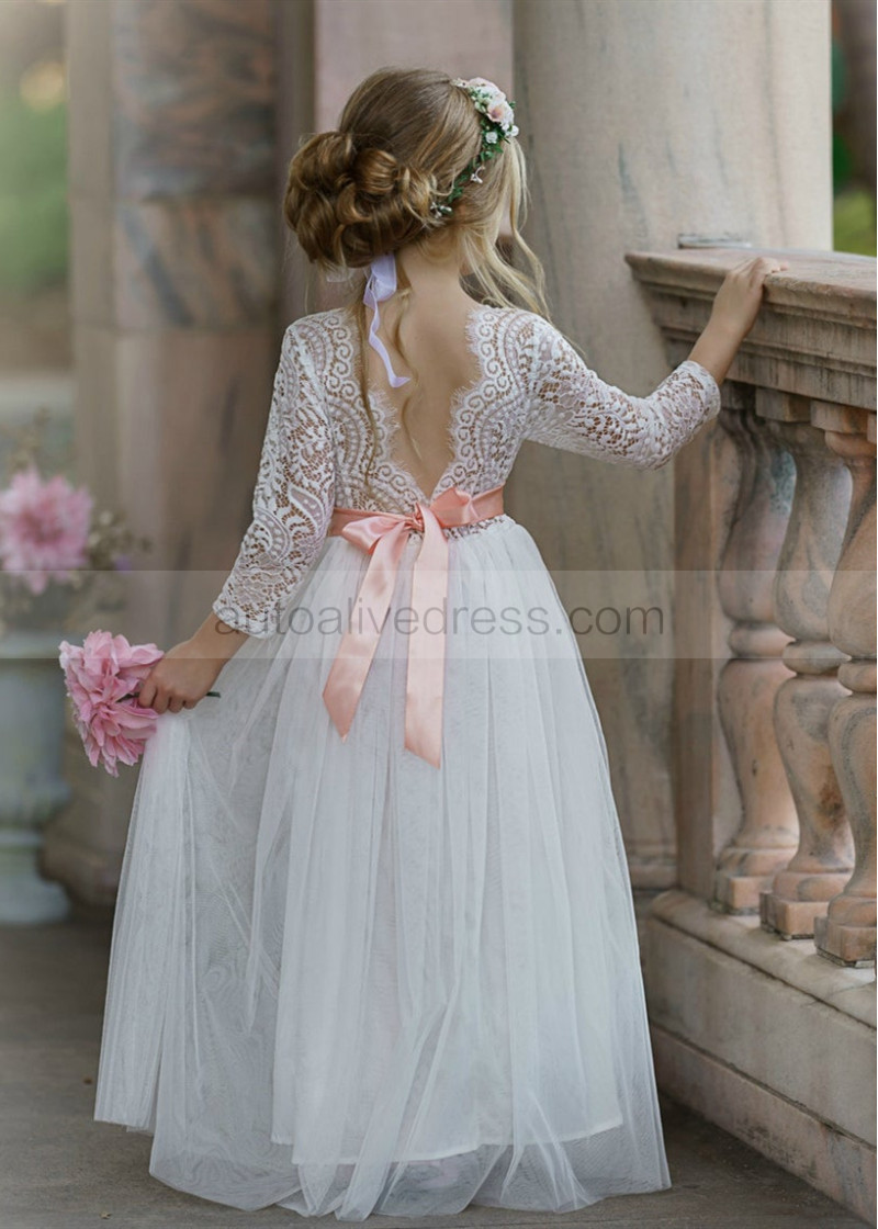 Long Sleeve Ivory Lace Tulle V Back Flower Girl Dress