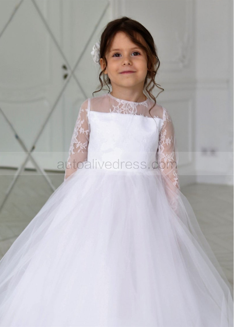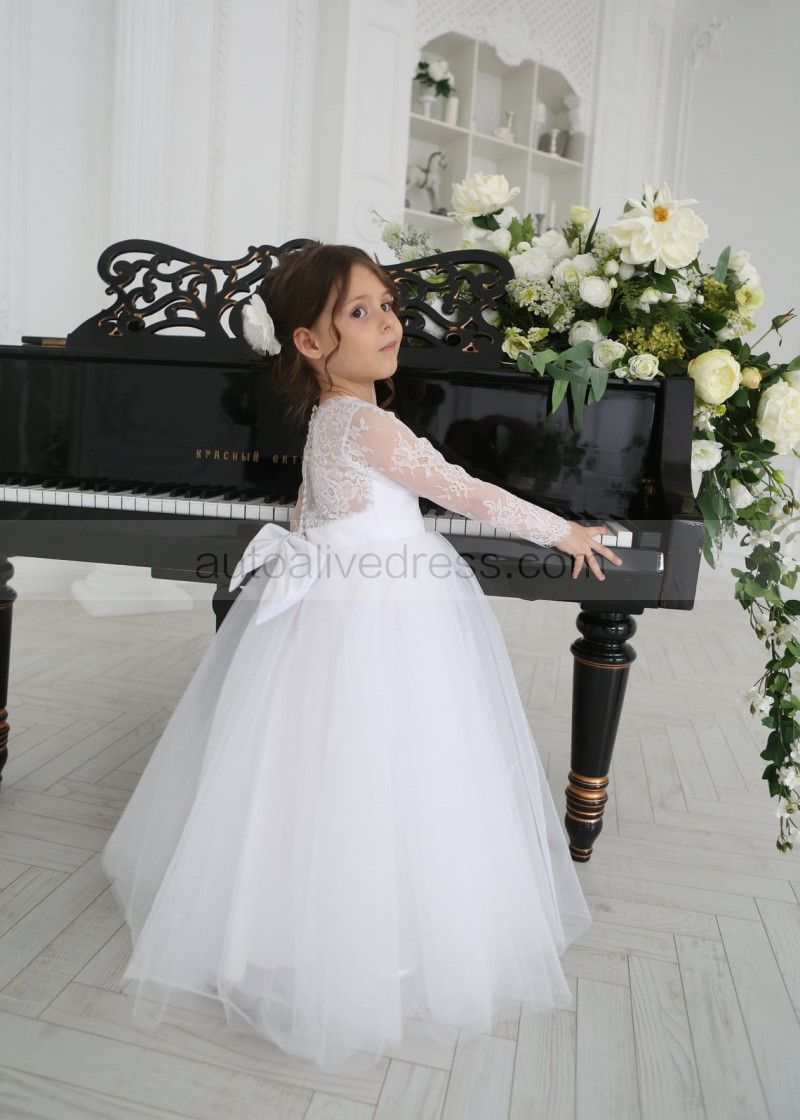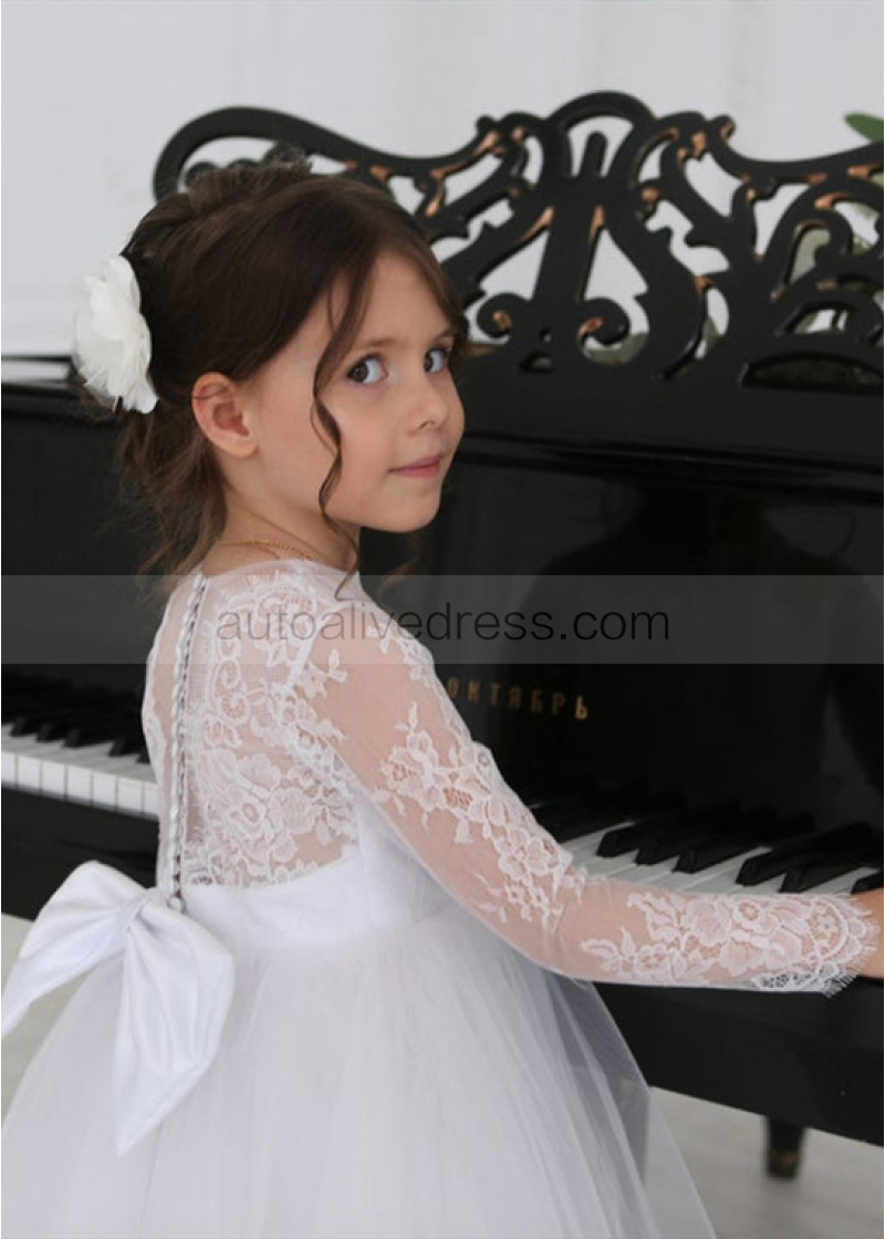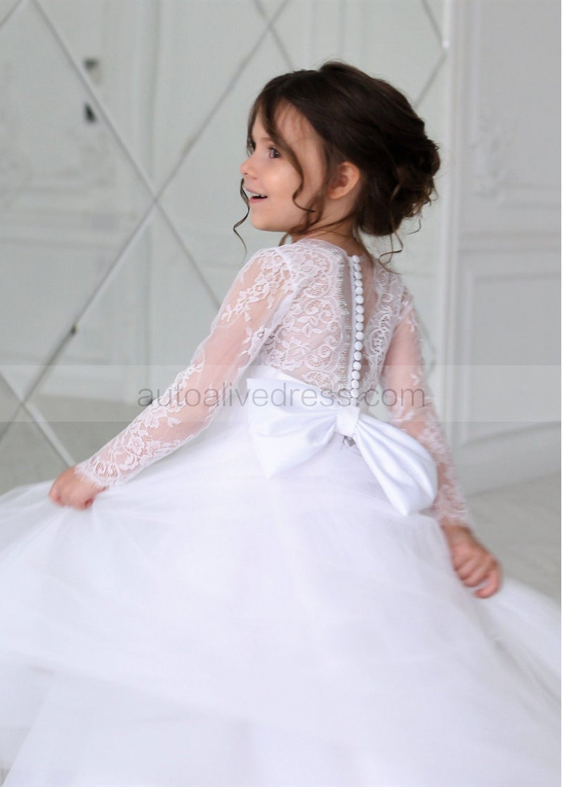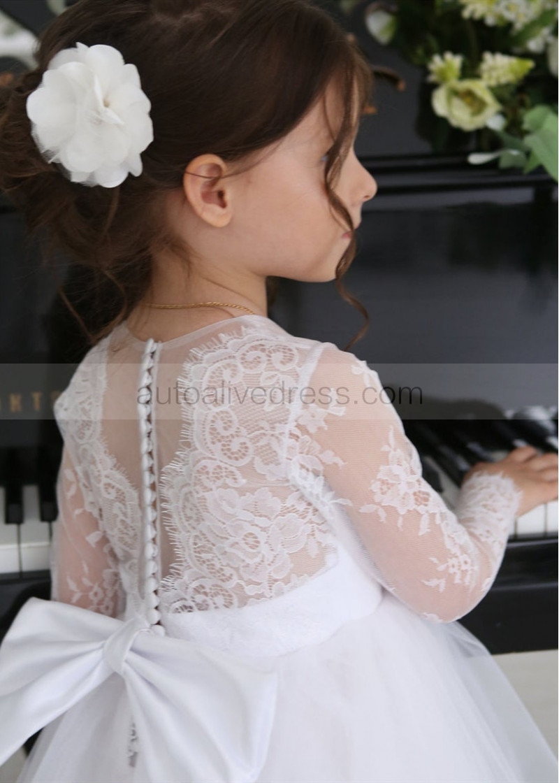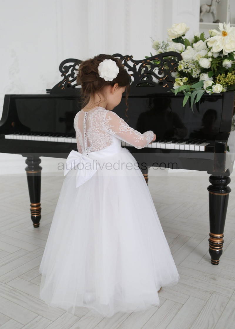 Long Sleeve White Lace Tulle Buttons Back Flower Girl Dress